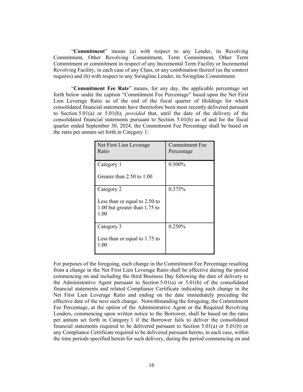 16 0.500% Net First Lien Leverage Ratio Category 2 Less than or equal to 2.50 to 1.00 but greater than 1.75 to 1.00 Commitment Fee Percentage 0.375% “Commitment” means (a) with respect to any Lender, its Revolving Commitment, Other Revolving Commitment, Term Commitment, Other Term Commitment or commitment in respect of any Incremental Term Facility or Incremental Revolving Facility, in each case of any Class, or any combination thereof (as the context requires) and (b) with respect to any Swingline Lender, its Swingline Commitment. “Commitment Fee Rate” means, for any day, the applicable percentage set forth below under the caption “Commitment Fee Percentage” based upon the Net First Lien Leverage Ratio as of the end of the fiscal quarter of Holdings for which consolidated financial statements have theretofore been most recently delivered pursuant to Section 5.01(a) or 5.01(b); provided that, until the date of the delivery of the consolidated financial statements pursuant to Section 5.01(b) as of and for the fiscal quarter ended September 30, 2024, the Commitment Fee Percentage shall be based on the rates per annum set forth in Category 1: Category 3 Less than or equal to 1.75 to 1.00 0.250% Category 1 Greater than 2.50 to 1.00 For purposes of the foregoing, each change in the Commitment Fee Percentage resulting from a change in the Net First Lien Leverage Ratio shall be effective during the period commencing on and including the third Business Day following the date of delivery to the Administrative Agent pursuant to Section 5.01(a) or 5.01(b) of the consolidated financial statements and related Compliance Certificate indicating such change in the Net First Lien Leverage Ratio and ending on the date immediately preceding the effective date of the next such change. Notwithstanding the foregoing, the Commitment Fee Percentage, at the option of the Administrative Agent or the Required Revolving Lenders, commencing upon written notice to the Borrower, shall be based on the rates per annum set forth in Category 1 if the Borrower fails to deliver the consolidated financial statements required to be delivered pursuant to Section 5.01(a) or 5.01(b) or any Compliance Certificate required to be delivered pursuant hereto, in each case, within the time periods specified herein for such delivery, during the period commencing on and