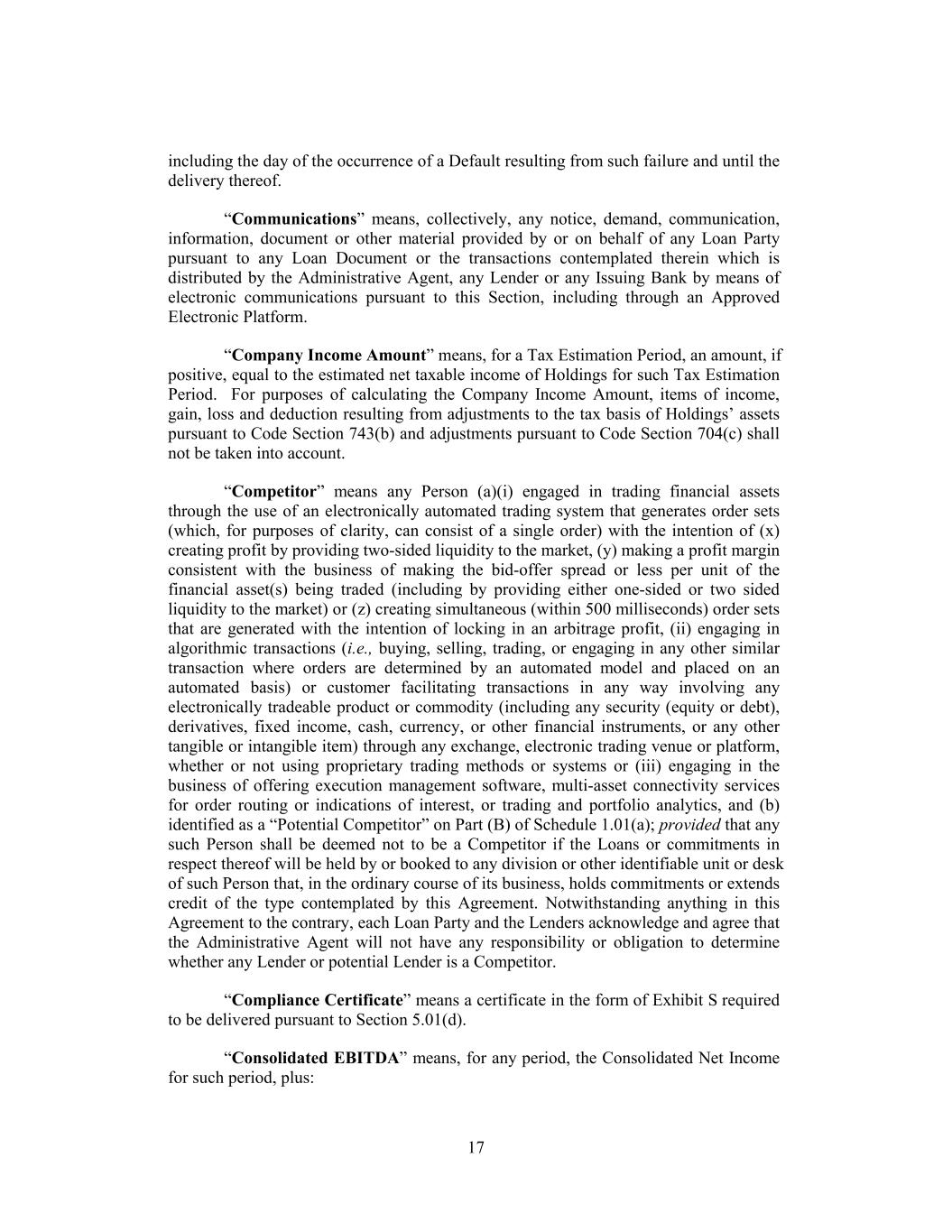 including the day of the occurrence of a Default resulting from such failure and until the delivery thereof. “Communications” means, collectively, any notice, demand, communication, information, document or other material provided by or on behalf of any Loan Party pursuant to any Loan Document or the transactions contemplated therein which is distributed by the Administrative Agent, any Lender or any Issuing Bank by means of electronic communications pursuant to this Section, including through an Approved Electronic Platform. “Company Income Amount” means, for a Tax Estimation Period, an amount, if positive, equal to the estimated net taxable income of Holdings for such Tax Estimation Period. For purposes of calculating the Company Income Amount, items of income, gain, loss and deduction resulting from adjustments to the tax basis of Holdings’ assets pursuant to Code Section 743(b) and adjustments pursuant to Code Section 704(c) shall not be taken into account. “Competitor” means any Person (a)(i) engaged in trading financial assets through the use of an electronically automated trading system that generates order sets (which, for purposes of clarity, can consist of a single order) with the intention of (x) creating profit by providing two-sided liquidity to the market, (y) making a profit margin consistent with the business of making the bid-offer spread or less per unit of the financial asset(s) being traded (including by providing either one-sided or two sided liquidity to the market) or (z) creating simultaneous (within 500 milliseconds) order sets that are generated with the intention of locking in an arbitrage profit, (ii) engaging in algorithmic transactions (i.e., buying, selling, trading, or engaging in any other similar transaction where orders are determined by an automated model and placed on an automated basis) or customer facilitating transactions in any way involving any electronically tradeable product or commodity (including any security (equity or debt), derivatives, fixed income, cash, currency, or other financial instruments, or any other tangible or intangible item) through any exchange, electronic trading venue or platform, whether or not using proprietary trading methods or systems or (iii) engaging in the business of offering execution management software, multi-asset connectivity services for order routing or indications of interest, or trading and portfolio analytics, and (b) identified as a “Potential Competitor” on Part (B) of Schedule 1.01(a); provided that any such Person shall be deemed not to be a Competitor if the Loans or commitments in respect thereof will be held by or booked to any division or other identifiable unit or desk of such Person that, in the ordinary course of its business, holds commitments or extends credit of the type contemplated by this Agreement. Notwithstanding anything in this Agreement to the contrary, each Loan Party and the Lenders acknowledge and agree that the Administrative Agent will not have any responsibility or obligation to determine whether any Lender or potential Lender is a Competitor. “Compliance Certificate” means a certificate in the form of Exhibit S required to be delivered pursuant to Section 5.01(d). “Consolidated EBITDA” means, for any period, the Consolidated Net Income for such period, plus: 17