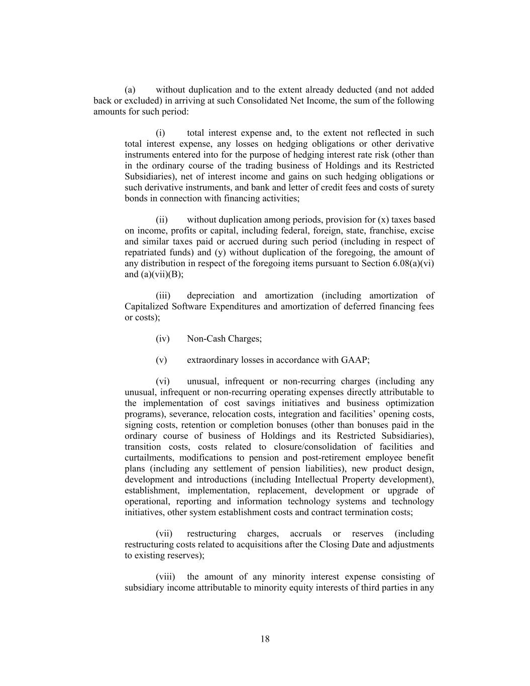 (a) without duplication and to the extent already deducted (and not added back or excluded) in arriving at such Consolidated Net Income, the sum of the following amounts for such period: (i) total interest expense and, to the extent not reflected in such total interest expense, any losses on hedging obligations or other derivative instruments entered into for the purpose of hedging interest rate risk (other than in the ordinary course of the trading business of Holdings and its Restricted Subsidiaries), net of interest income and gains on such hedging obligations or such derivative instruments, and bank and letter of credit fees and costs of surety bonds in connection with financing activities; (ii) without duplication among periods, provision for (x) taxes based on income, profits or capital, including federal, foreign, state, franchise, excise and similar taxes paid or accrued during such period (including in respect of repatriated funds) and (y) without duplication of the foregoing, the amount of any distribution in respect of the foregoing items pursuant to Section 6.08(a)(vi) and (a)(vii)(B); (iii) depreciation and amortization (including amortization of Capitalized Software Expenditures and amortization of deferred financing fees or costs); (iv) Non-Cash Charges; (v) extraordinary losses in accordance with GAAP; (vi) unusual, infrequent or non-recurring charges (including any unusual, infrequent or non-recurring operating expenses directly attributable to the implementation of cost savings initiatives and business optimization programs), severance, relocation costs, integration and facilities’ opening costs, signing costs, retention or completion bonuses (other than bonuses paid in the ordinary course of business of Holdings and its Restricted Subsidiaries), transition costs, costs related to closure/consolidation of facilities and curtailments, modifications to pension and post-retirement employee benefit plans (including any settlement of pension liabilities), new product design, development and introductions (including Intellectual Property development), establishment, implementation, replacement, development or upgrade of operational, reporting and information technology systems and technology initiatives, other system establishment costs and contract termination costs; (vii) restructuring charges, accruals or reserves (including restructuring costs related to acquisitions after the Closing Date and adjustments to existing reserves); (viii) the amount of any minority interest expense consisting of subsidiary income attributable to minority equity interests of third parties in any 18