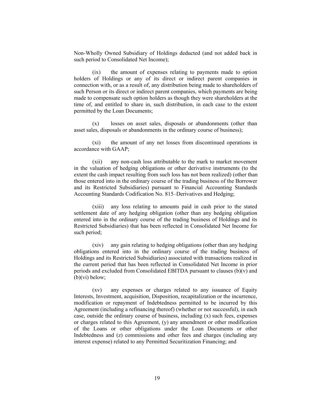 Non-Wholly Owned Subsidiary of Holdings deducted (and not added back in such period to Consolidated Net Income); (ix) the amount of expenses relating to payments made to option holders of Holdings or any of its direct or indirect parent companies in connection with, or as a result of, any distribution being made to shareholders of such Person or its direct or indirect parent companies, which payments are being made to compensate such option holders as though they were shareholders at the time of, and entitled to share in, such distribution, in each case to the extent permitted by the Loan Documents; (x) losses on asset sales, disposals or abandonments (other than asset sales, disposals or abandonments in the ordinary course of business); (xi) the amount of any net losses from discontinued operations in accordance with GAAP; (xii) any non-cash loss attributable to the mark to market movement in the valuation of hedging obligations or other derivative instruments (to the extent the cash impact resulting from such loss has not been realized) (other than those entered into in the ordinary course of the trading business of the Borrower and its Restricted Subsidiaries) pursuant to Financial Accounting Standards Accounting Standards Codification No. 815–Derivatives and Hedging; (xiii) any loss relating to amounts paid in cash prior to the stated settlement date of any hedging obligation (other than any hedging obligation entered into in the ordinary course of the trading business of Holdings and its Restricted Subsidiaries) that has been reflected in Consolidated Net Income for such period; (xiv) any gain relating to hedging obligations (other than any hedging obligations entered into in the ordinary course of the trading business of Holdings and its Restricted Subsidiaries) associated with transactions realized in the current period that has been reflected in Consolidated Net Income in prior periods and excluded from Consolidated EBITDA pursuant to clauses (b)(v) and (b)(vi) below; (xv) any expenses or charges related to any issuance of Equity Interests, Investment, acquisition, Disposition, recapitalization or the incurrence, modification or repayment of Indebtedness permitted to be incurred by this Agreement (including a refinancing thereof) (whether or not successful), in each case, outside the ordinary course of business, including (x) such fees, expenses or charges related to this Agreement, (y) any amendment or other modification of the Loans or other obligations under the Loan Documents or other Indebtedness and (z) commissions and other fees and charges (including any interest expense) related to any Permitted Securitization Financing; and 19