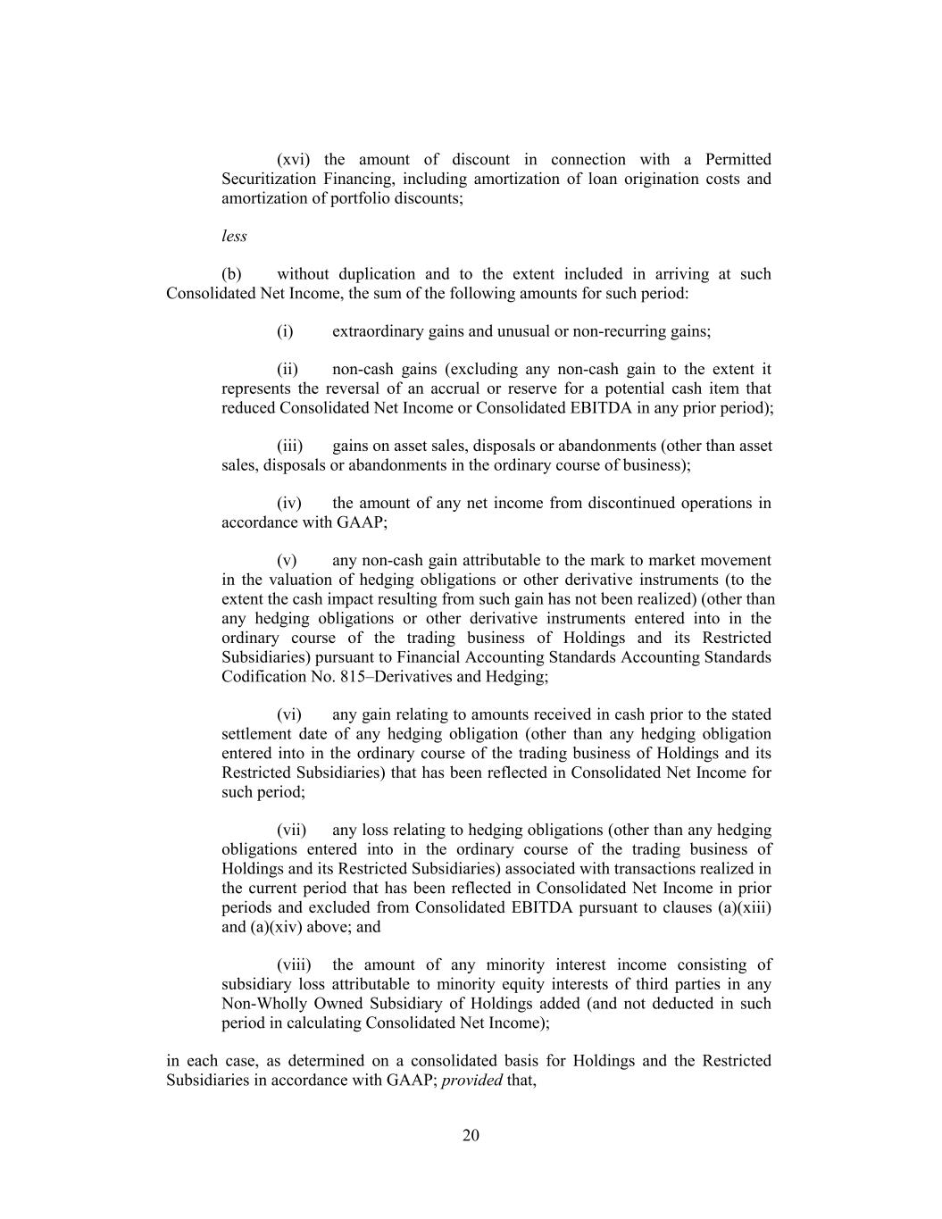 (xvi) the amount of discount in connection with a Permitted Securitization Financing, including amortization of loan origination costs and amortization of portfolio discounts; less (b) without duplication and to the extent included in arriving at such Consolidated Net Income, the sum of the following amounts for such period: (i) extraordinary gains and unusual or non-recurring gains; (ii) non-cash gains (excluding any non-cash gain to the extent it represents the reversal of an accrual or reserve for a potential cash item that reduced Consolidated Net Income or Consolidated EBITDA in any prior period); (iii) gains on asset sales, disposals or abandonments (other than asset sales, disposals or abandonments in the ordinary course of business); (iv) the amount of any net income from discontinued operations in accordance with GAAP; (v) any non-cash gain attributable to the mark to market movement in the valuation of hedging obligations or other derivative instruments (to the extent the cash impact resulting from such gain has not been realized) (other than any hedging obligations or other derivative instruments entered into in the ordinary course of the trading business of Holdings and its Restricted Subsidiaries) pursuant to Financial Accounting Standards Accounting Standards Codification No. 815–Derivatives and Hedging; (vi) any gain relating to amounts received in cash prior to the stated settlement date of any hedging obligation (other than any hedging obligation entered into in the ordinary course of the trading business of Holdings and its Restricted Subsidiaries) that has been reflected in Consolidated Net Income for such period; (vii) any loss relating to hedging obligations (other than any hedging obligations entered into in the ordinary course of the trading business of Holdings and its Restricted Subsidiaries) associated with transactions realized in the current period that has been reflected in Consolidated Net Income in prior periods and excluded from Consolidated EBITDA pursuant to clauses (a)(xiii) and (a)(xiv) above; and (viii) the amount of any minority interest income consisting of subsidiary loss attributable to minority equity interests of third parties in any Non-Wholly Owned Subsidiary of Holdings added (and not deducted in such period in calculating Consolidated Net Income); in each case, as determined on a consolidated basis for Holdings and the Restricted Subsidiaries in accordance with GAAP; provided that, 20