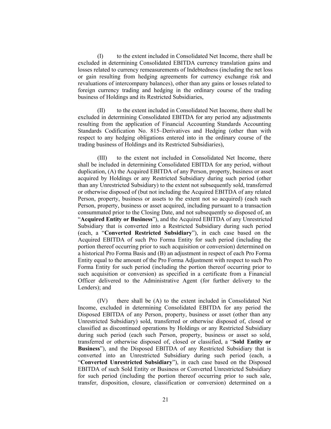 (I) to the extent included in Consolidated Net Income, there shall be excluded in determining Consolidated EBITDA currency translation gains and losses related to currency remeasurements of Indebtedness (including the net loss or gain resulting from hedging agreements for currency exchange risk and revaluations of intercompany balances), other than any gains or losses related to foreign currency trading and hedging in the ordinary course of the trading business of Holdings and its Restricted Subsidiaries, (II) to the extent included in Consolidated Net Income, there shall be excluded in determining Consolidated EBITDA for any period any adjustments resulting from the application of Financial Accounting Standards Accounting Standards Codification No. 815–Derivatives and Hedging (other than with respect to any hedging obligations entered into in the ordinary course of the trading business of Holdings and its Restricted Subsidiaries), (III) to the extent not included in Consolidated Net Income, there shall be included in determining Consolidated EBITDA for any period, without duplication, (A) the Acquired EBITDA of any Person, property, business or asset acquired by Holdings or any Restricted Subsidiary during such period (other than any Unrestricted Subsidiary) to the extent not subsequently sold, transferred or otherwise disposed of (but not including the Acquired EBITDA of any related Person, property, business or assets to the extent not so acquired) (each such Person, property, business or asset acquired, including pursuant to a transaction consummated prior to the Closing Date, and not subsequently so disposed of, an “Acquired Entity or Business”), and the Acquired EBITDA of any Unrestricted Subsidiary that is converted into a Restricted Subsidiary during such period (each, a “Converted Restricted Subsidiary”), in each case based on the Acquired EBITDA of such Pro Forma Entity for such period (including the portion thereof occurring prior to such acquisition or conversion) determined on a historical Pro Forma Basis and (B) an adjustment in respect of each Pro Forma Entity equal to the amount of the Pro Forma Adjustment with respect to such Pro Forma Entity for such period (including the portion thereof occurring prior to such acquisition or conversion) as specified in a certificate from a Financial Officer delivered to the Administrative Agent (for further delivery to the Lenders); and (IV) there shall be (A) to the extent included in Consolidated Net Income, excluded in determining Consolidated EBITDA for any period the Disposed EBITDA of any Person, property, business or asset (other than any Unrestricted Subsidiary) sold, transferred or otherwise disposed of, closed or classified as discontinued operations by Holdings or any Restricted Subsidiary during such period (each such Person, property, business or asset so sold, transferred or otherwise disposed of, closed or classified, a “Sold Entity or Business”), and the Disposed EBITDA of any Restricted Subsidiary that is converted into an Unrestricted Subsidiary during such period (each, a “Converted Unrestricted Subsidiary”), in each case based on the Disposed EBITDA of such Sold Entity or Business or Converted Unrestricted Subsidiary for such period (including the portion thereof occurring prior to such sale, transfer, disposition, closure, classification or conversion) determined on a 21