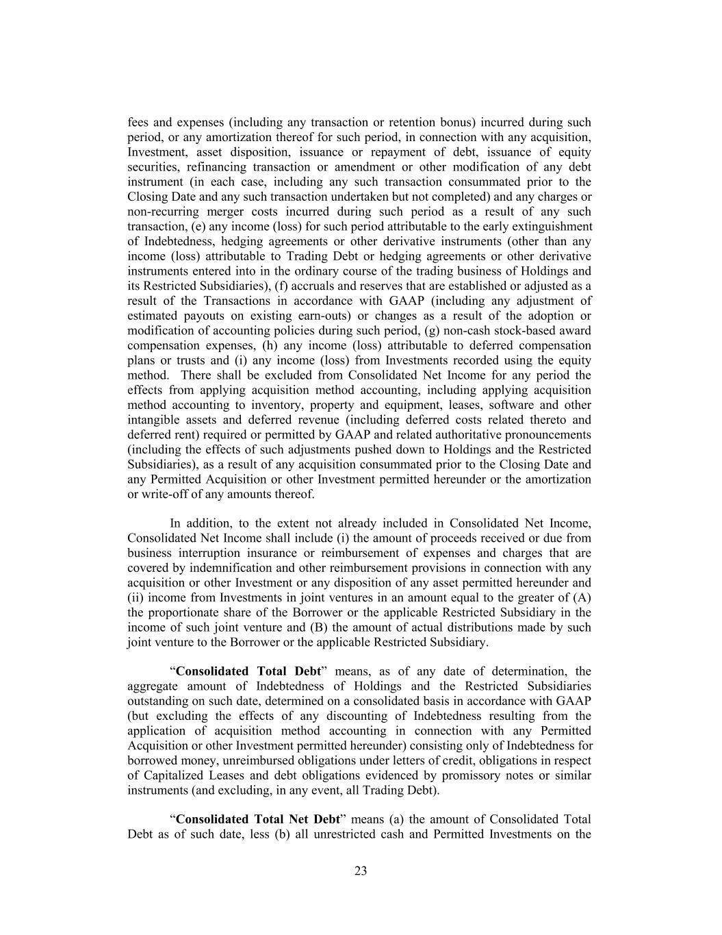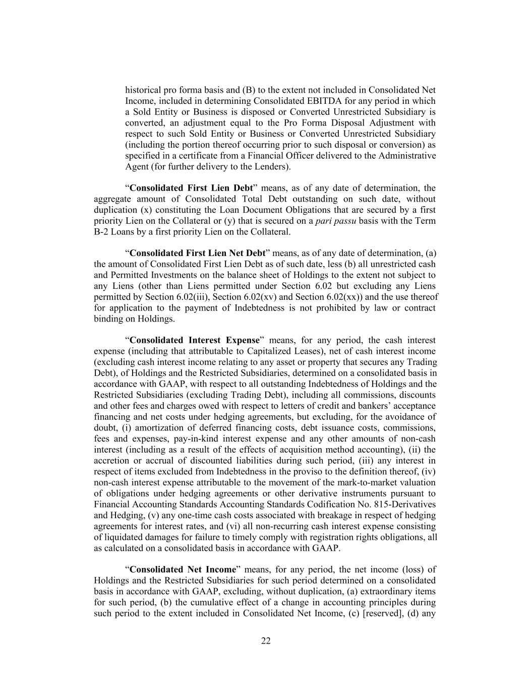 historical pro forma basis and (B) to the extent not included in Consolidated Net Income, included in determining Consolidated EBITDA for any period in which a Sold Entity or Business is disposed or Converted Unrestricted Subsidiary is converted, an adjustment equal to the Pro Forma Disposal Adjustment with respect to such Sold Entity or Business or Converted Unrestricted Subsidiary (including the portion thereof occurring prior to such disposal or conversion) as specified in a certificate from a Financial Officer delivered to the Administrative Agent (for further delivery to the Lenders). “Consolidated First Lien Debt” means, as of any date of determination, the aggregate amount of Consolidated Total Debt outstanding on such date, without duplication (x) constituting the Loan Document Obligations that are secured by a first priority Lien on the Collateral or (y) that is secured on a pari passu basis with the Term B-2 Loans by a first priority Lien on the Collateral. “Consolidated First Lien Net Debt” means, as of any date of determination, (a) the amount of Consolidated First Lien Debt as of such date, less (b) all unrestricted cash and Permitted Investments on the balance sheet of Holdings to the extent not subject to any Liens (other than Liens permitted under Section 6.02 but excluding any Liens permitted by Section 6.02(iii), Section 6.02(xv) and Section 6.02(xx)) and the use thereof for application to the payment of Indebtedness is not prohibited by law or contract binding on Holdings. “Consolidated Interest Expense” means, for any period, the cash interest expense (including that attributable to Capitalized Leases), net of cash interest income (excluding cash interest income relating to any asset or property that secures any Trading Debt), of Holdings and the Restricted Subsidiaries, determined on a consolidated basis in accordance with GAAP, with respect to all outstanding Indebtedness of Holdings and the Restricted Subsidiaries (excluding Trading Debt), including all commissions, discounts and other fees and charges owed with respect to letters of credit and bankers’ acceptance financing and net costs under hedging agreements, but excluding, for the avoidance of doubt, (i) amortization of deferred financing costs, debt issuance costs, commissions, fees and expenses, pay-in-kind interest expense and any other amounts of non-cash interest (including as a result of the effects of acquisition method accounting), (ii) the accretion or accrual of discounted liabilities during such period, (iii) any interest in respect of items excluded from Indebtedness in the proviso to the definition thereof, (iv) non-cash interest expense attributable to the movement of the mark-to-market valuation of obligations under hedging agreements or other derivative instruments pursuant to Financial Accounting Standards Accounting Standards Codification No. 815-Derivatives and Hedging, (v) any one-time cash costs associated with breakage in respect of hedging agreements for interest rates, and (vi) all non-recurring cash interest expense consisting of liquidated damages for failure to timely comply with registration rights obligations, all as calculated on a consolidated basis in accordance with GAAP. “Consolidated Net Income” means, for any period, the net income (loss) of Holdings and the Restricted Subsidiaries for such period determined on a consolidated basis in accordance with GAAP, excluding, without duplication, (a) extraordinary items for such period, (b) the cumulative effect of a change in accounting principles during such period to the extent included in Consolidated Net Income, (c) [reserved], (d) any 22