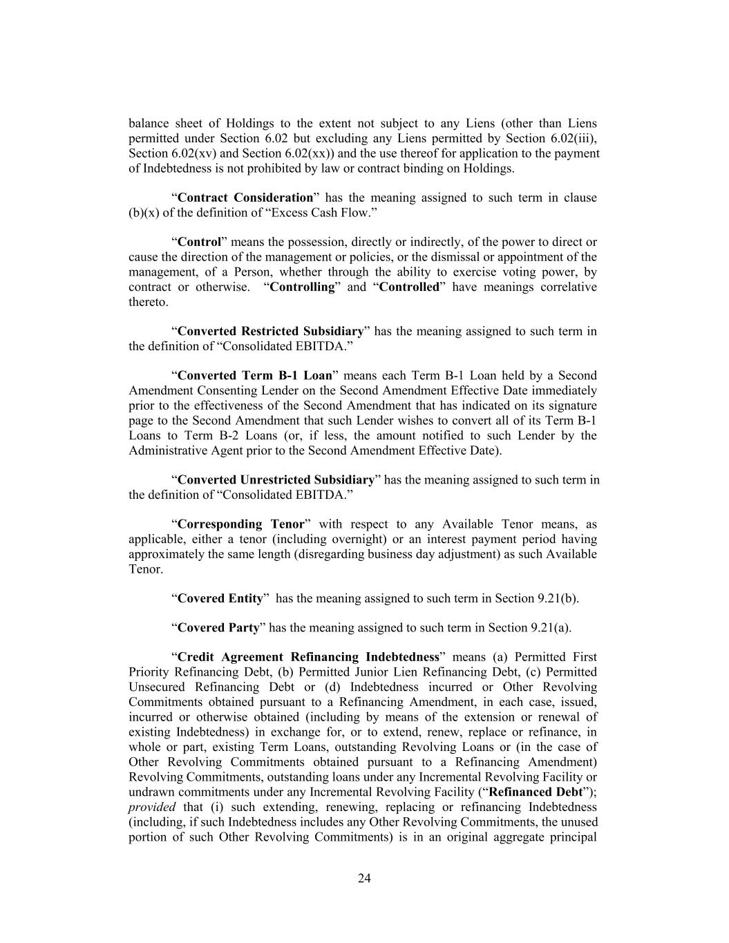 balance sheet of Holdings to the extent not subject to any Liens (other than Liens permitted under Section 6.02 but excluding any Liens permitted by Section 6.02(iii), Section 6.02(xv) and Section 6.02(xx)) and the use thereof for application to the payment of Indebtedness is not prohibited by law or contract binding on Holdings. “Contract Consideration” has the meaning assigned to such term in clause (b)(x) of the definition of “Excess Cash Flow.” “Control” means the possession, directly or indirectly, of the power to direct or cause the direction of the management or policies, or the dismissal or appointment of the management, of a Person, whether through the ability to exercise voting power, by contract or otherwise. “Controlling” and “Controlled” have meanings correlative thereto. “Converted Restricted Subsidiary” has the meaning assigned to such term in the definition of “Consolidated EBITDA.” “Converted Term B-1 Loan” means each Term B-1 Loan held by a Second Amendment Consenting Lender on the Second Amendment Effective Date immediately prior to the effectiveness of the Second Amendment that has indicated on its signature page to the Second Amendment that such Lender wishes to convert all of its Term B-1 Loans to Term B-2 Loans (or, if less, the amount notified to such Lender by the Administrative Agent prior to the Second Amendment Effective Date). “Converted Unrestricted Subsidiary” has the meaning assigned to such term in the definition of “Consolidated EBITDA.” “Corresponding Tenor” with respect to any Available Tenor means, as applicable, either a tenor (including overnight) or an interest payment period having approximately the same length (disregarding business day adjustment) as such Available Tenor. “Covered Entity” has the meaning assigned to such term in Section 9.21(b). “Covered Party” has the meaning assigned to such term in Section 9.21(a). “Credit Agreement Refinancing Indebtedness” means (a) Permitted First Priority Refinancing Debt, (b) Permitted Junior Lien Refinancing Debt, (c) Permitted Unsecured Refinancing Debt or (d) Indebtedness incurred or Other Revolving Commitments obtained pursuant to a Refinancing Amendment, in each case, issued, incurred or otherwise obtained (including by means of the extension or renewal of existing Indebtedness) in exchange for, or to extend, renew, replace or refinance, in whole or part, existing Term Loans, outstanding Revolving Loans or (in the case of Other Revolving Commitments obtained pursuant to a Refinancing Amendment) Revolving Commitments, outstanding loans under any Incremental Revolving Facility or undrawn commitments under any Incremental Revolving Facility (“Refinanced Debt”); provided that (i) such extending, renewing, replacing or refinancing Indebtedness (including, if such Indebtedness includes any Other Revolving Commitments, the unused portion of such Other Revolving Commitments) is in an original aggregate principal 24