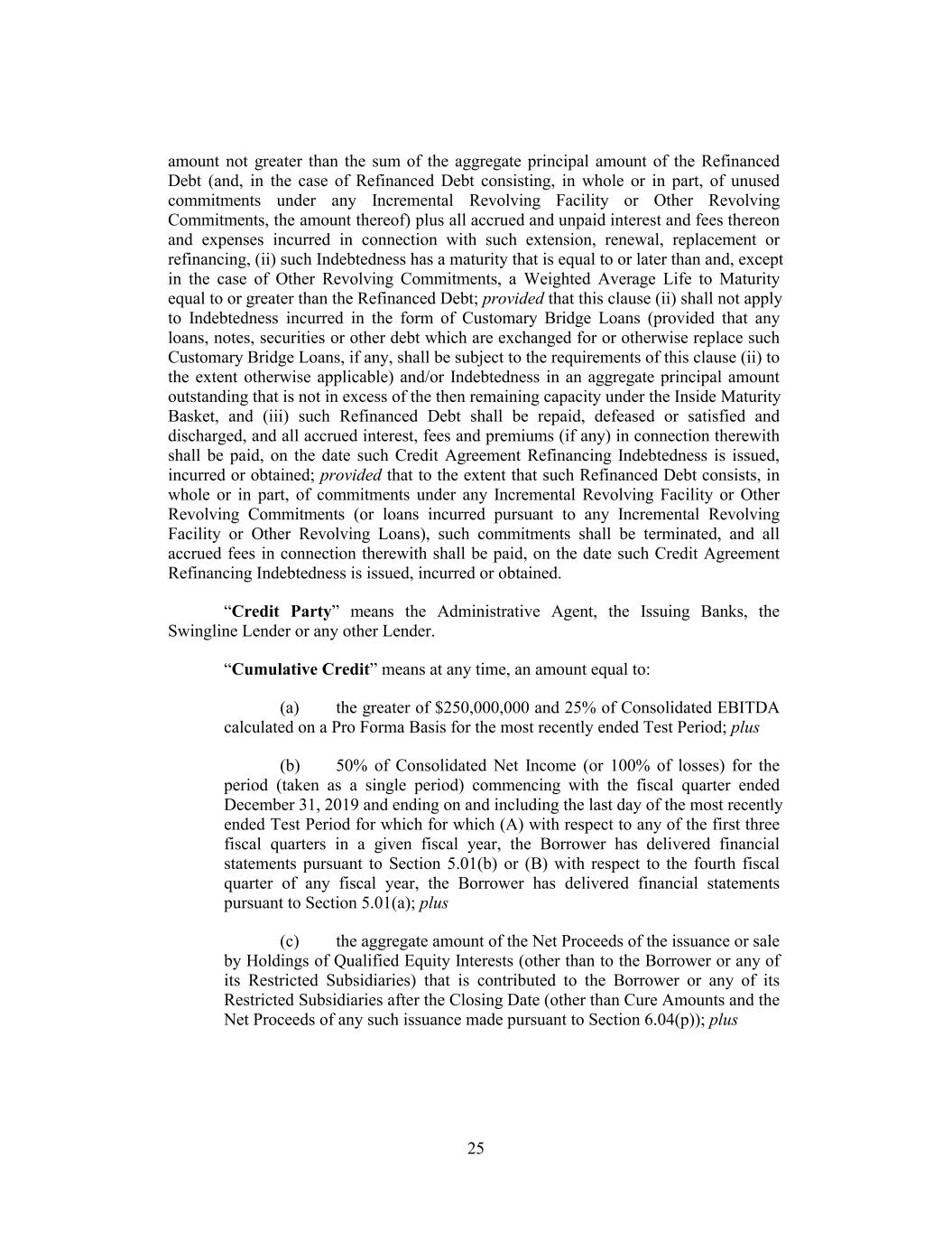 amount not greater than the sum of the aggregate principal amount of the Refinanced Debt (and, in the case of Refinanced Debt consisting, in whole or in part, of unused commitments under any Incremental Revolving Facility or Other Revolving Commitments, the amount thereof) plus all accrued and unpaid interest and fees thereon and expenses incurred in connection with such extension, renewal, replacement or refinancing, (ii) such Indebtedness has a maturity that is equal to or later than and, except in the case of Other Revolving Commitments, a Weighted Average Life to Maturity equal to or greater than the Refinanced Debt; provided that this clause (ii) shall not apply to Indebtedness incurred in the form of Customary Bridge Loans (provided that any loans, notes, securities or other debt which are exchanged for or otherwise replace such Customary Bridge Loans, if any, shall be subject to the requirements of this clause (ii) to the extent otherwise applicable) and/or Indebtedness in an aggregate principal amount outstanding that is not in excess of the then remaining capacity under the Inside Maturity Basket, and (iii) such Refinanced Debt shall be repaid, defeased or satisfied and discharged, and all accrued interest, fees and premiums (if any) in connection therewith shall be paid, on the date such Credit Agreement Refinancing Indebtedness is issued, incurred or obtained; provided that to the extent that such Refinanced Debt consists, in whole or in part, of commitments under any Incremental Revolving Facility or Other Revolving Commitments (or loans incurred pursuant to any Incremental Revolving Facility or Other Revolving Loans), such commitments shall be terminated, and all accrued fees in connection therewith shall be paid, on the date such Credit Agreement Refinancing Indebtedness is issued, incurred or obtained. “Credit Party” means the Administrative Agent, the Issuing Banks, the Swingline Lender or any other Lender. “Cumulative Credit” means at any time, an amount equal to: (a) the greater of $250,000,000 and 25% of Consolidated EBITDA calculated on a Pro Forma Basis for the most recently ended Test Period; plus (b) 50% of Consolidated Net Income (or 100% of losses) for the period (taken as a single period) commencing with the fiscal quarter ended December 31, 2019 and ending on and including the last day of the most recently ended Test Period for which for which (A) with respect to any of the first three fiscal quarters in a given fiscal year, the Borrower has delivered financial statements pursuant to Section 5.01(b) or (B) with respect to the fourth fiscal quarter of any fiscal year, the Borrower has delivered financial statements pursuant to Section 5.01(a); plus (c) the aggregate amount of the Net Proceeds of the issuance or sale by Holdings of Qualified Equity Interests (other than to the Borrower or any of its Restricted Subsidiaries) that is contributed to the Borrower or any of its Restricted Subsidiaries after the Closing Date (other than Cure Amounts and the Net Proceeds of any such issuance made pursuant to Section 6.04(p)); plus 25