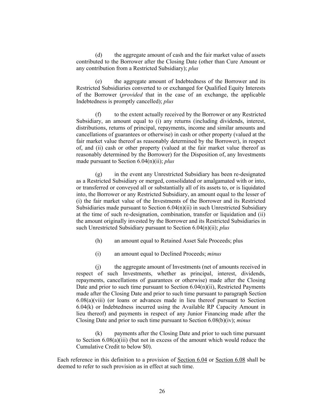 (d) the aggregate amount of cash and the fair market value of assets contributed to the Borrower after the Closing Date (other than Cure Amount or any contribution from a Restricted Subsidiary); plus (e) the aggregate amount of Indebtedness of the Borrower and its Restricted Subsidiaries converted to or exchanged for Qualified Equity Interests of the Borrower (provided that in the case of an exchange, the applicable Indebtedness is promptly cancelled); plus (f) to the extent actually received by the Borrower or any Restricted Subsidiary, an amount equal to (i) any returns (including dividends, interest, distributions, returns of principal, repayments, income and similar amounts and cancellations of guarantees or otherwise) in cash or other property (valued at the fair market value thereof as reasonably determined by the Borrower), in respect of, and (ii) cash or other property (valued at the fair market value thereof as reasonably determined by the Borrower) for the Disposition of, any Investments made pursuant to Section 6.04(n)(ii); plus (g) in the event any Unrestricted Subsidiary has been re-designated as a Restricted Subsidiary or merged, consolidated or amalgamated with or into, or transferred or conveyed all or substantially all of its assets to, or is liquidated into, the Borrower or any Restricted Subsidiary, an amount equal to the lesser of (i) the fair market value of the Investments of the Borrower and its Restricted Subsidiaries made pursuant to Section 6.04(n)(ii) in such Unrestricted Subsidiary at the time of such re-designation, combination, transfer or liquidation and (ii) the amount originally invested by the Borrower and its Restricted Subsidiaries in such Unrestricted Subsidiary pursuant to Section 6.04(n)(ii); plus (h) an amount equal to Retained Asset Sale Proceeds; plus (i) an amount equal to Declined Proceeds; minus (j) the aggregate amount of Investments (net of amounts received in respect of such Investments, whether as principal, interest, dividends, repayments, cancellations of guarantees or otherwise) made after the Closing Date and prior to such time pursuant to Section 6.04(n)(ii), Restricted Payments made after the Closing Date and prior to such time pursuant to paragraph Section 6.08(a)(viii) (or loans or advances made in lieu thereof pursuant to Section 6.04(k) or Indebtedness incurred using the Available RP Capacity Amount in lieu thereof) and payments in respect of any Junior Financing made after the Closing Date and prior to such time pursuant to Section 6.08(b)(iv); minus (k) payments after the Closing Date and prior to such time pursuant to Section 6.08(a)(iii) (but not in excess of the amount which would reduce the Cumulative Credit to below $0). Each reference in this definition to a provision of Section 6.04 or Section 6.08 shall be deemed to refer to such provision as in effect at such time. 26