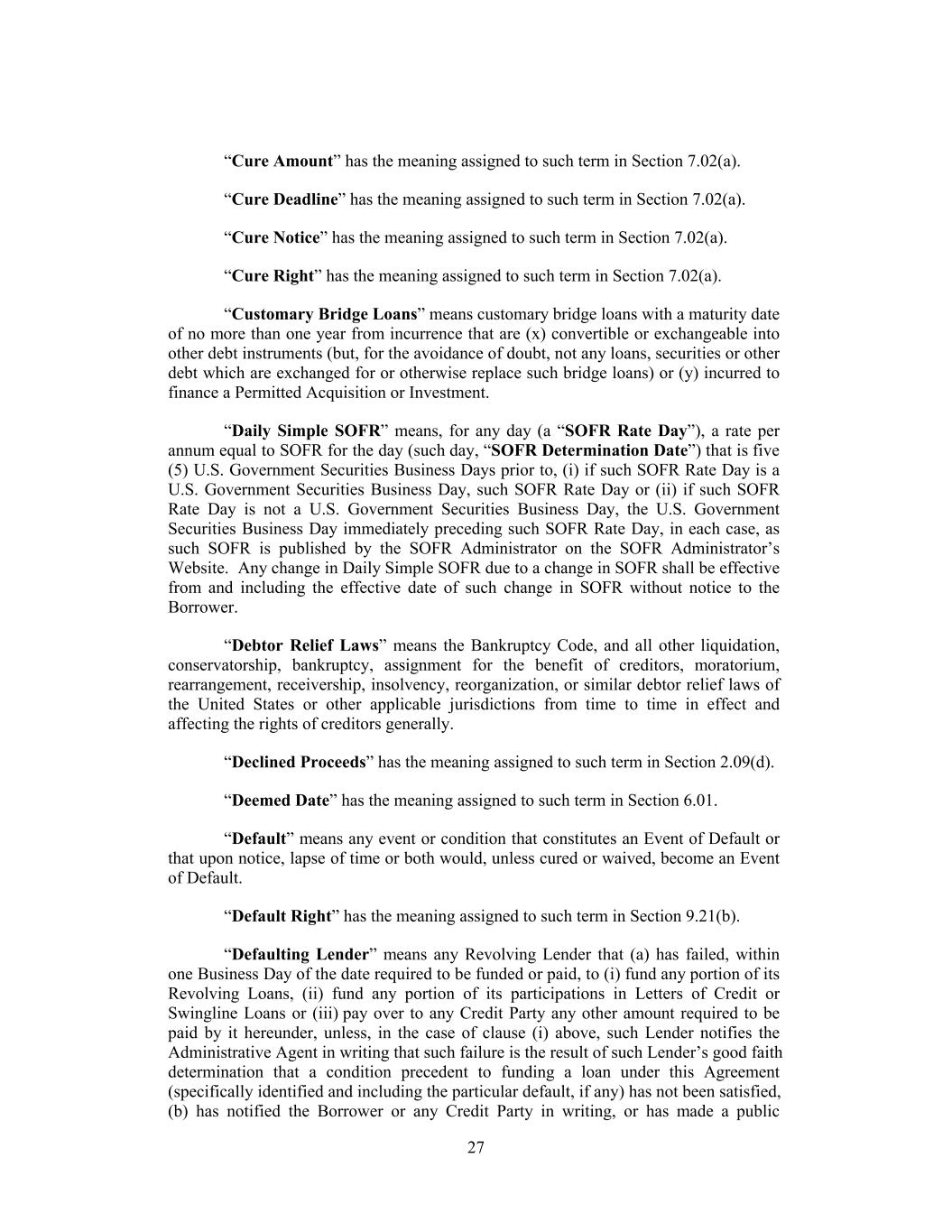 “Cure Amount” has the meaning assigned to such term in Section 7.02(a). “Cure Deadline” has the meaning assigned to such term in Section 7.02(a). “Cure Notice” has the meaning assigned to such term in Section 7.02(a). “Cure Right” has the meaning assigned to such term in Section 7.02(a). “Customary Bridge Loans” means customary bridge loans with a maturity date of no more than one year from incurrence that are (x) convertible or exchangeable into other debt instruments (but, for the avoidance of doubt, not any loans, securities or other debt which are exchanged for or otherwise replace such bridge loans) or (y) incurred to finance a Permitted Acquisition or Investment. “Daily Simple SOFR” means, for any day (a “SOFR Rate Day”), a rate per annum equal to SOFR for the day (such day, “SOFR Determination Date”) that is five (5) U.S. Government Securities Business Days prior to, (i) if such SOFR Rate Day is a U.S. Government Securities Business Day, such SOFR Rate Day or (ii) if such SOFR Rate Day is not a U.S. Government Securities Business Day, the U.S. Government Securities Business Day immediately preceding such SOFR Rate Day, in each case, as such SOFR is published by the SOFR Administrator on the SOFR Administrator’s Website. Any change in Daily Simple SOFR due to a change in SOFR shall be effective from and including the effective date of such change in SOFR without notice to the Borrower. “Debtor Relief Laws” means the Bankruptcy Code, and all other liquidation, conservatorship, bankruptcy, assignment for the benefit of creditors, moratorium, rearrangement, receivership, insolvency, reorganization, or similar debtor relief laws of the United States or other applicable jurisdictions from time to time in effect and affecting the rights of creditors generally. “Declined Proceeds” has the meaning assigned to such term in Section 2.09(d). “Deemed Date” has the meaning assigned to such term in Section 6.01. “Default” means any event or condition that constitutes an Event of Default or that upon notice, lapse of time or both would, unless cured or waived, become an Event of Default. “Default Right” has the meaning assigned to such term in Section 9.21(b). “Defaulting Lender” means any Revolving Lender that (a) has failed, within one Business Day of the date required to be funded or paid, to (i) fund any portion of its Revolving Loans, (ii) fund any portion of its participations in Letters of Credit or Swingline Loans or (iii) pay over to any Credit Party any other amount required to be paid by it hereunder, unless, in the case of clause (i) above, such Lender notifies the Administrative Agent in writing that such failure is the result of such Lender’s good faith determination that a condition precedent to funding a loan under this Agreement (specifically identified and including the particular default, if any) has not been satisfied, (b) has notified the Borrower or any Credit Party in writing, or has made a public 27