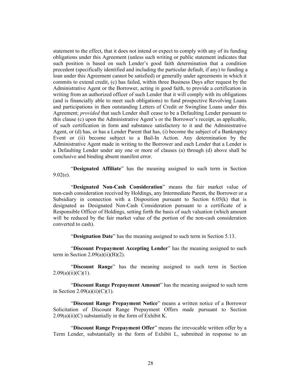 statement to the effect, that it does not intend or expect to comply with any of its funding obligations under this Agreement (unless such writing or public statement indicates that such position is based on such Lender’s good faith determination that a condition precedent (specifically identified and including the particular default, if any) to funding a loan under this Agreement cannot be satisfied) or generally under agreements in which it commits to extend credit, (c) has failed, within three Business Days after request by the Administrative Agent or the Borrower, acting in good faith, to provide a certification in writing from an authorized officer of such Lender that it will comply with its obligations (and is financially able to meet such obligations) to fund prospective Revolving Loans and participations in then outstanding Letters of Credit or Swingline Loans under this Agreement; provided that such Lender shall cease to be a Defaulting Lender pursuant to this clause (c) upon the Administrative Agent’s or the Borrower’s receipt, as applicable, of such certification in form and substance satisfactory to it and the Administrative Agent, or (d) has, or has a Lender Parent that has, (i) become the subject of a Bankruptcy Event or (ii) become subject to a Bail-In Action. Any determination by the Administrative Agent made in writing to the Borrower and each Lender that a Lender is a Defaulting Lender under any one or more of clauses (a) through (d) above shall be conclusive and binding absent manifest error. “Designated Affiliate” has the meaning assigned to such term in Section 9.02(e). “Designated Non-Cash Consideration” means the fair market value of non-cash consideration received by Holdings, any Intermediate Parent, the Borrower or a Subsidiary in connection with a Disposition pursuant to Section 6.05(k) that is designated as Designated Non-Cash Consideration pursuant to a certificate of a Responsible Officer of Holdings, setting forth the basis of such valuation (which amount will be reduced by the fair market value of the portion of the non-cash consideration converted to cash). “Designation Date” has the meaning assigned to such term in Section 5.13. “Discount Prepayment Accepting Lender” has the meaning assigned to such term in Section 2.09(a)(ii)(B)(2). “Discount Range” has the meaning assigned to such term in Section 2.09(a)(ii)(C)(1). “Discount Range Prepayment Amount” has the meaning assigned to such term in Section 2.09(a)(ii)(C)(1). “Discount Range Prepayment Notice” means a written notice of a Borrower Solicitation of Discount Range Prepayment Offers made pursuant to Section 2.09(a)(ii)(C) substantially in the form of Exhibit K. “Discount Range Prepayment Offer” means the irrevocable written offer by a Term Lender, substantially in the form of Exhibit L, submitted in response to an 28