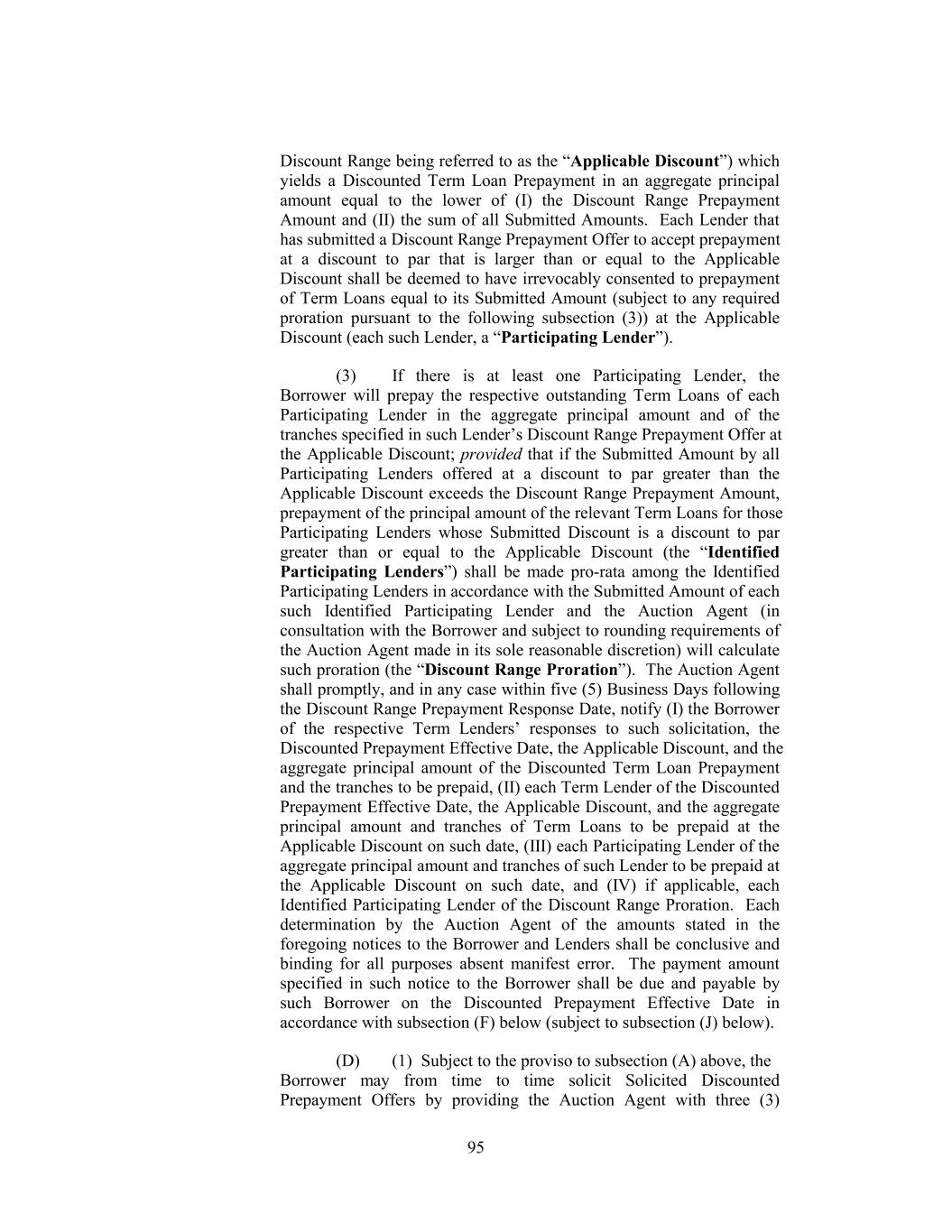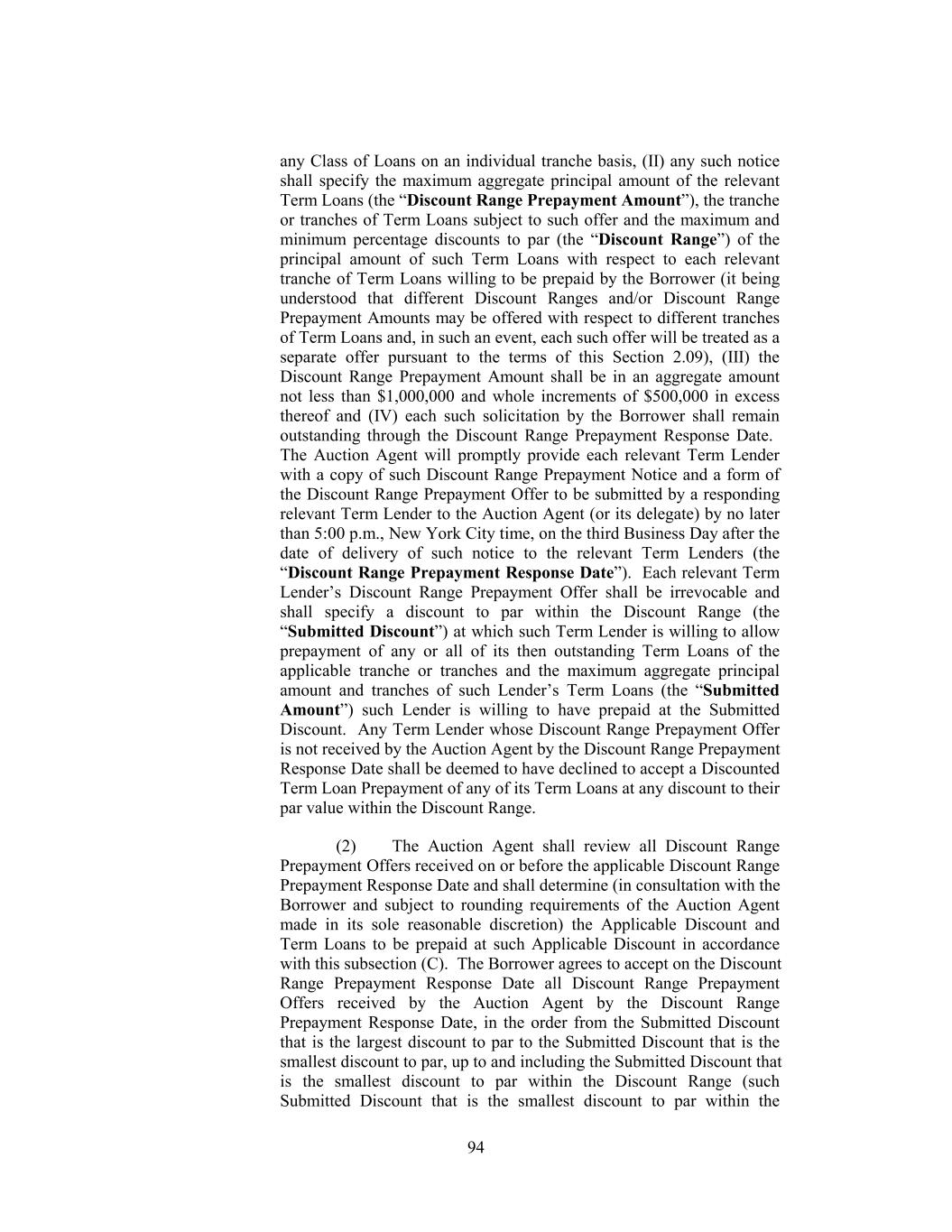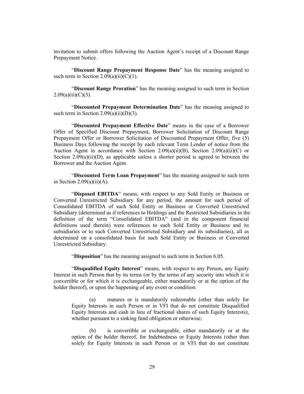 invitation to submit offers following the Auction Agent’s receipt of a Discount Range Prepayment Notice. “Discount Range Prepayment Response Date” has the meaning assigned to such term in Section 2.09(a)(ii)(C)(1). “Discount Range Proration” has the meaning assigned to such term in Section 2.09(a)(ii)(C)(3). “Discounted Prepayment Determination Date” has the meaning assigned to such term in Section 2.09(a)(ii)(D)(3). “Discounted Prepayment Effective Date” means in the case of a Borrower Offer of Specified Discount Prepayment, Borrower Solicitation of Discount Range Prepayment Offer or Borrower Solicitation of Discounted Prepayment Offer, five (5) Business Days following the receipt by each relevant Term Lender of notice from the Auction Agent in accordance with Section 2.09(a)(ii)(B), Section 2.09(a)(ii)(C) or Section 2.09(a)(ii)(D), as applicable unless a shorter period is agreed to between the Borrower and the Auction Agent. “Discounted Term Loan Prepayment” has the meaning assigned to such term in Section 2.09(a)(ii)(A). “Disposed EBITDA” means, with respect to any Sold Entity or Business or Converted Unrestricted Subsidiary for any period, the amount for such period of Consolidated EBITDA of such Sold Entity or Business or Converted Unrestricted Subsidiary (determined as if references to Holdings and the Restricted Subsidiaries in the definition of the term “Consolidated EBITDA” (and in the component financial definitions used therein) were references to such Sold Entity or Business and its subsidiaries or to such Converted Unrestricted Subsidiary and its subsidiaries), all as determined on a consolidated basis for such Sold Entity or Business or Converted Unrestricted Subsidiary. “Disposition” has the meaning assigned to such term in Section 6.05. “Disqualified Equity Interest” means, with respect to any Person, any Equity Interest in such Person that by its terms (or by the terms of any security into which it is convertible or for which it is exchangeable, either mandatorily or at the option of the holder thereof), or upon the happening of any event or condition: (a) matures or is mandatorily redeemable (other than solely for Equity Interests in such Person or in VFI that do not constitute Disqualified Equity Interests and cash in lieu of fractional shares of such Equity Interests), whether pursuant to a sinking fund obligation or otherwise; (b) is convertible or exchangeable, either mandatorily or at the option of the holder thereof, for Indebtedness or Equity Interests (other than solely for Equity Interests in such Person or in VFI that do not constitute 29