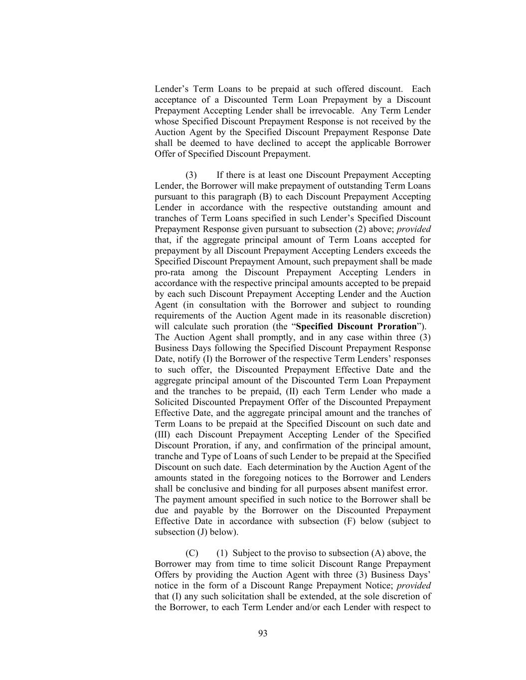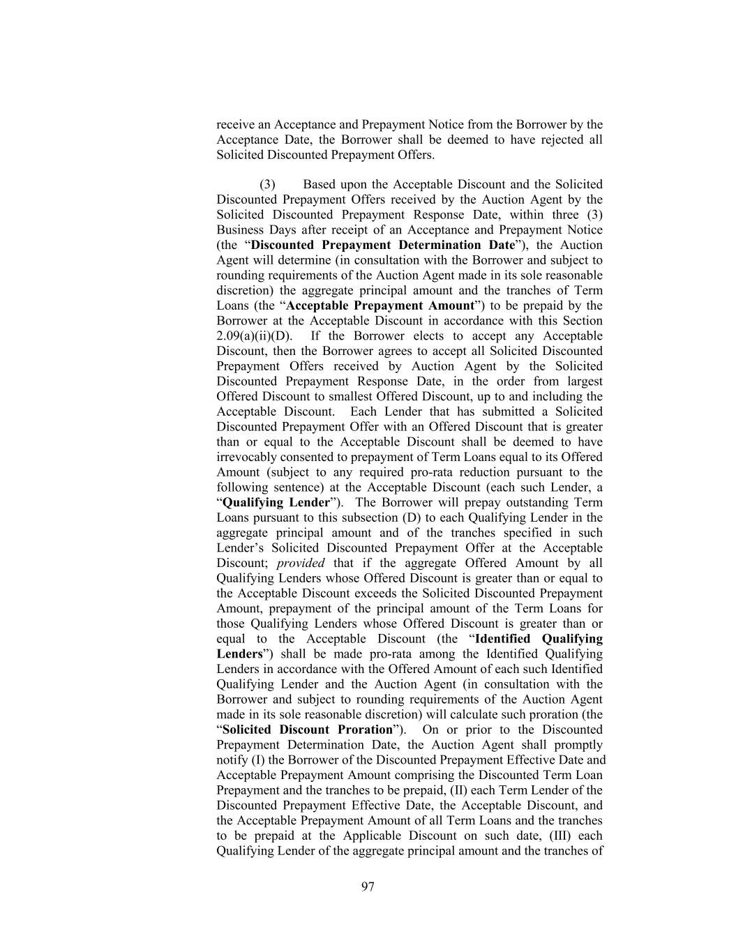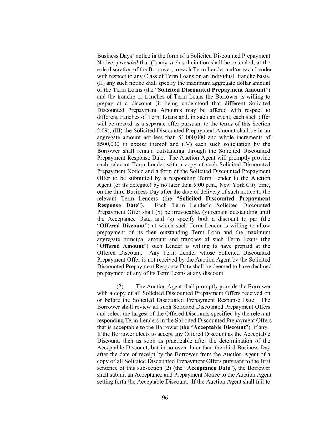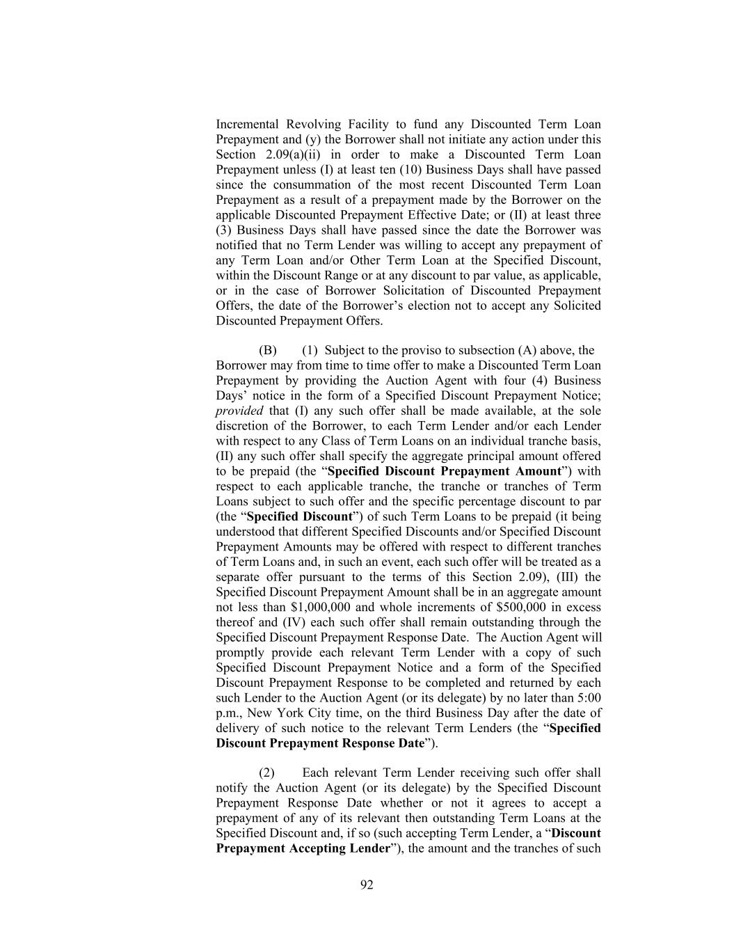invitation to submit offers following the Auction Agent’s receipt of a Discount Range Prepayment Notice. “Discount Range Prepayment Response Date” has the meaning assigned to such term in Section 2.09(a)(ii)(C)(1). “Discount Range Proration” has the meaning assigned to such term in Section 2.09(a)(ii)(C)(3). “Discounted Prepayment Determination Date” has the meaning assigned to such term in Section 2.09(a)(ii)(D)(3). “Discounted Prepayment Effective Date” means in the case of a Borrower Offer of Specified Discount Prepayment, Borrower Solicitation of Discount Range Prepayment Offer or Borrower Solicitation of Discounted Prepayment Offer, five (5) Business Days following the receipt by each relevant Term Lender of notice from the Auction Agent in accordance with Section 2.09(a)(ii)(B), Section 2.09(a)(ii)(C) or Section 2.09(a)(ii)(D), as applicable unless a shorter period is agreed to between the Borrower and the Auction Agent. “Discounted Term Loan Prepayment” has the meaning assigned to such term in Section 2.09(a)(ii)(A). “Disposed EBITDA” means, with respect to any Sold Entity or Business or Converted Unrestricted Subsidiary for any period, the amount for such period of Consolidated EBITDA of such Sold Entity or Business or Converted Unrestricted Subsidiary (determined as if references to Holdings and the Restricted Subsidiaries in the definition of the term “Consolidated EBITDA” (and in the component financial definitions used therein) were references to such Sold Entity or Business and its subsidiaries or to such Converted Unrestricted Subsidiary and its subsidiaries), all as determined on a consolidated basis for such Sold Entity or Business or Converted Unrestricted Subsidiary. “Disposition” has the meaning assigned to such term in Section 6.05. “Disqualified Equity Interest” means, with respect to any Person, any Equity Interest in such Person that by its terms (or by the terms of any security into which it is convertible or for which it is exchangeable, either mandatorily or at the option of the holder thereof), or upon the happening of any event or condition: (a) matures or is mandatorily redeemable (other than solely for Equity Interests in such Person or in VFI that do not constitute Disqualified Equity Interests and cash in lieu of fractional shares of such Equity Interests), whether pursuant to a sinking fund obligation or otherwise; (b) is convertible or exchangeable, either mandatorily or at the option of the holder thereof, for Indebtedness or Equity Interests (other than solely for Equity Interests in such Person or in VFI that do not constitute 29