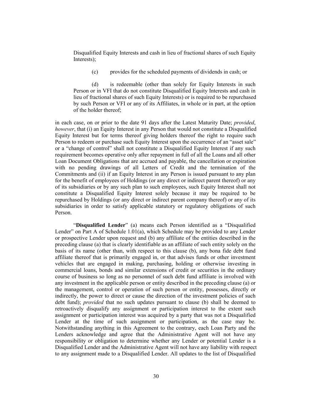 Disqualified Equity Interests and cash in lieu of fractional shares of such Equity Interests); (c) provides for the scheduled payments of dividends in cash; or (d) is redeemable (other than solely for Equity Interests in such Person or in VFI that do not constitute Disqualified Equity Interests and cash in lieu of fractional shares of such Equity Interests) or is required to be repurchased by such Person or VFI or any of its Affiliates, in whole or in part, at the option of the holder thereof; in each case, on or prior to the date 91 days after the Latest Maturity Date; provided, however, that (i) an Equity Interest in any Person that would not constitute a Disqualified Equity Interest but for terms thereof giving holders thereof the right to require such Person to redeem or purchase such Equity Interest upon the occurrence of an “asset sale” or a “change of control” shall not constitute a Disqualified Equity Interest if any such requirement becomes operative only after repayment in full of all the Loans and all other Loan Document Obligations that are accrued and payable, the cancellation or expiration with no pending drawings of all Letters of Credit and the termination of the Commitments and (ii) if an Equity Interest in any Person is issued pursuant to any plan for the benefit of employees of Holdings (or any direct or indirect parent thereof) or any of its subsidiaries or by any such plan to such employees, such Equity Interest shall not constitute a Disqualified Equity Interest solely because it may be required to be repurchased by Holdings (or any direct or indirect parent company thereof) or any of its subsidiaries in order to satisfy applicable statutory or regulatory obligations of such Person. “Disqualified Lender” (a) means each Person identified as a “Disqualified Lender” on Part A of Schedule 1.01(a), which Schedule may be provided to any Lender or prospective Lender upon request and (b) any affiliate of the entities described in the preceding clause (a) that is clearly identifiable as an affiliate of such entity solely on the basis of its name (other than, with respect to this clause (b), any bona fide debt fund affiliate thereof that is primarily engaged in, or that advises funds or other investment vehicles that are engaged in making, purchasing, holding or otherwise investing in commercial loans, bonds and similar extensions of credit or securities in the ordinary course of business so long as no personnel of such debt fund affiliate is involved with any investment in the applicable person or entity described in the preceding clause (a) or the management, control or operation of such person or entity, possesses, directly or indirectly, the power to direct or cause the direction of the investment policies of such debt fund); provided that no such updates pursuant to clause (b) shall be deemed to retroactively disqualify any assignment or participation interest to the extent such assignment or participation interest was acquired by a party that was not a Disqualified Lender at the time of such assignment or participation, as the case may be. Notwithstanding anything in this Agreement to the contrary, each Loan Party and the Lenders acknowledge and agree that the Administrative Agent will not have any responsibility or obligation to determine whether any Lender or potential Lender is a Disqualified Lender and the Administrative Agent will not have any liability with respect to any assignment made to a Disqualified Lender. All updates to the list of Disqualified 30