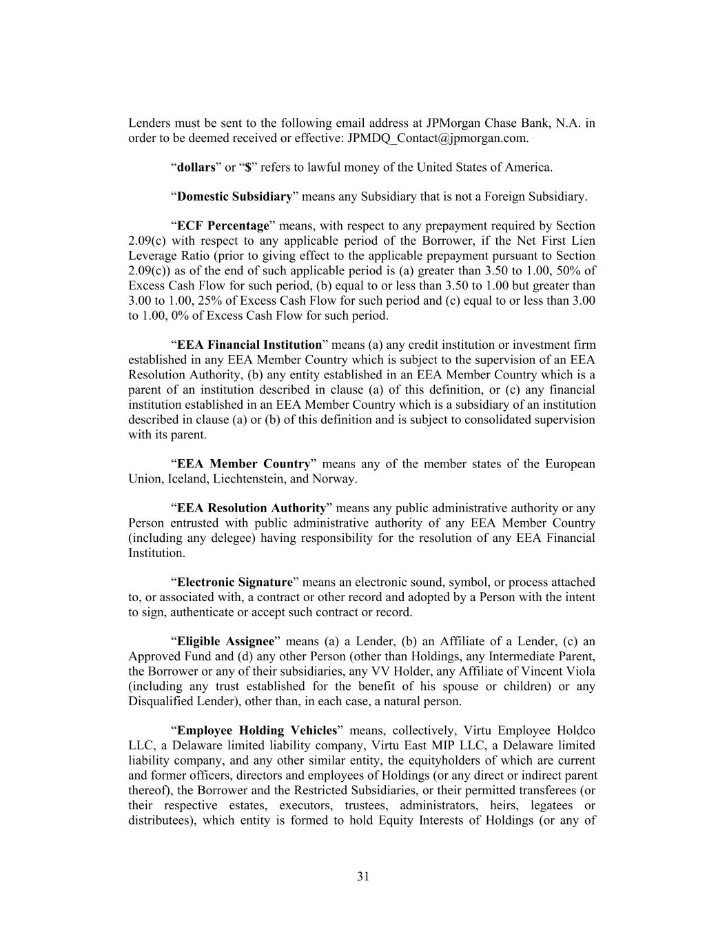 Lenders must be sent to the following email address at JPMorgan Chase Bank, N.A. in order to be deemed received or effective: JPMDQ_Contact@jpmorgan.com. “dollars” or “$” refers to lawful money of the United States of America. “Domestic Subsidiary” means any Subsidiary that is not a Foreign Subsidiary. “ECF Percentage” means, with respect to any prepayment required by Section 2.09(c) with respect to any applicable period of the Borrower, if the Net First Lien Leverage Ratio (prior to giving effect to the applicable prepayment pursuant to Section 2.09(c)) as of the end of such applicable period is (a) greater than 3.50 to 1.00, 50% of Excess Cash Flow for such period, (b) equal to or less than 3.50 to 1.00 but greater than 3.00 to 1.00, 25% of Excess Cash Flow for such period and (c) equal to or less than 3.00 to 1.00, 0% of Excess Cash Flow for such period. “EEA Financial Institution” means (a) any credit institution or investment firm established in any EEA Member Country which is subject to the supervision of an EEA Resolution Authority, (b) any entity established in an EEA Member Country which is a parent of an institution described in clause (a) of this definition, or (c) any financial institution established in an EEA Member Country which is a subsidiary of an institution described in clause (a) or (b) of this definition and is subject to consolidated supervision with its parent. “EEA Member Country” means any of the member states of the European Union, Iceland, Liechtenstein, and Norway. “EEA Resolution Authority” means any public administrative authority or any Person entrusted with public administrative authority of any EEA Member Country (including any delegee) having responsibility for the resolution of any EEA Financial Institution. “Electronic Signature” means an electronic sound, symbol, or process attached to, or associated with, a contract or other record and adopted by a Person with the intent to sign, authenticate or accept such contract or record. “Eligible Assignee” means (a) a Lender, (b) an Affiliate of a Lender, (c) an Approved Fund and (d) any other Person (other than Holdings, any Intermediate Parent, the Borrower or any of their subsidiaries, any VV Holder, any Affiliate of Vincent Viola (including any trust established for the benefit of his spouse or children) or any Disqualified Lender), other than, in each case, a natural person. “Employee Holding Vehicles” means, collectively, Virtu Employee Holdco LLC, a Delaware limited liability company, Virtu East MIP LLC, a Delaware limited liability company, and any other similar entity, the equityholders of which are current and former officers, directors and employees of Holdings (or any direct or indirect parent thereof), the Borrower and the Restricted Subsidiaries, or their permitted transferees (or their respective estates, executors, trustees, administrators, heirs, legatees or distributees), which entity is formed to hold Equity Interests of Holdings (or any of 31