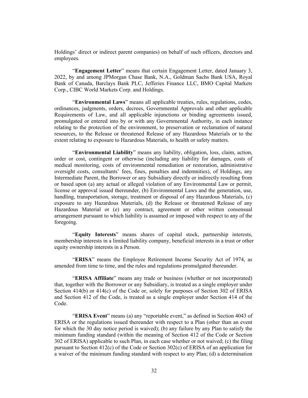 Holdings’ direct or indirect parent companies) on behalf of such officers, directors and employees. “Engagement Letter” means that certain Engagement Letter, dated January 3, 2022, by and among JPMorgan Chase Bank, N.A., Goldman Sachs Bank USA, Royal Bank of Canada, Barclays Bank PLC, Jefferies Finance LLC, BMO Capital Markets Corp., CIBC World Markets Corp. and Holdings. “Environmental Laws” means all applicable treaties, rules, regulations, codes, ordinances, judgments, orders, decrees, Governmental Approvals and other applicable Requirements of Law, and all applicable injunctions or binding agreements issued, promulgated or entered into by or with any Governmental Authority, in each instance relating to the protection of the environment, to preservation or reclamation of natural resources, to the Release or threatened Release of any Hazardous Materials or to the extent relating to exposure to Hazardous Materials, to health or safety matters. “Environmental Liability” means any liability, obligation, loss, claim, action, order or cost, contingent or otherwise (including any liability for damages, costs of medical monitoring, costs of environmental remediation or restoration, administrative oversight costs, consultants’ fees, fines, penalties and indemnities), of Holdings, any Intermediate Parent, the Borrower or any Subsidiary directly or indirectly resulting from or based upon (a) any actual or alleged violation of any Environmental Law or permit, license or approval issued thereunder, (b) Environmental Laws and the generation, use, handling, transportation, storage, treatment or disposal of any Hazardous Materials, (c) exposure to any Hazardous Materials, (d) the Release or threatened Release of any Hazardous Material or (e) any contract, agreement or other written consensual arrangement pursuant to which liability is assumed or imposed with respect to any of the foregoing. “Equity Interests” means shares of capital stock, partnership interests, membership interests in a limited liability company, beneficial interests in a trust or other equity ownership interests in a Person. “ERISA” means the Employee Retirement Income Security Act of 1974, as amended from time to time, and the rules and regulations promulgated thereunder. “ERISA Affiliate” means any trade or business (whether or not incorporated) that, together with the Borrower or any Subsidiary, is treated as a single employer under Section 414(b) or 414(c) of the Code or, solely for purposes of Section 302 of ERISA and Section 412 of the Code, is treated as a single employer under Section 414 of the Code. “ERISA Event” means (a) any “reportable event,” as defined in Section 4043 of ERISA or the regulations issued thereunder with respect to a Plan (other than an event for which the 30 day notice period is waived); (b) any failure by any Plan to satisfy the minimum funding standard (within the meaning of Section 412 of the Code or Section 302 of ERISA) applicable to such Plan, in each case whether or not waived; (c) the filing pursuant to Section 412(c) of the Code or Section 302(c) of ERISA of an application for a waiver of the minimum funding standard with respect to any Plan; (d) a determination 32