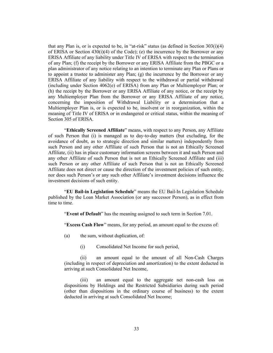 that any Plan is, or is expected to be, in “at-risk” status (as defined in Section 303(i)(4) of ERISA or Section 430(i)(4) of the Code); (e) the incurrence by the Borrower or any ERISA Affiliate of any liability under Title IV of ERISA with respect to the termination of any Plan; (f) the receipt by the Borrower or any ERISA Affiliate from the PBGC or a plan administrator of any notice relating to an intention to terminate any Plan or Plans or to appoint a trustee to administer any Plan; (g) the incurrence by the Borrower or any ERISA Affiliate of any liability with respect to the withdrawal or partial withdrawal (including under Section 4062(e) of ERISA) from any Plan or Multiemployer Plan; or (h) the receipt by the Borrower or any ERISA Affiliate of any notice, or the receipt by any Multiemployer Plan from the Borrower or any ERISA Affiliate of any notice, concerning the imposition of Withdrawal Liability or a determination that a Multiemployer Plan is, or is expected to be, insolvent or in reorganization, within the meaning of Title IV of ERISA or in endangered or critical status, within the meaning of Section 305 of ERISA. “Ethically Screened Affiliate” means, with respect to any Person, any Affiliate of such Person that (i) is managed as to day-to-day matters (but excluding, for the avoidance of doubt, as to strategic direction and similar matters) independently from such Person and any other Affiliate of such Person that is not an Ethically Screened Affiliate, (ii) has in place customary information screens between it and such Person and any other Affiliate of such Person that is not an Ethically Screened Affiliate and (iii) such Person or any other Affiliate of such Person that is not an Ethically Screened Affiliate does not direct or cause the direction of the investment policies of such entity, nor does such Person’s or any such other Affiliate’s investment decisions influence the investment decisions of such entity. “EU Bail-in Legislation Schedule” means the EU Bail-In Legislation Schedule published by the Loan Market Association (or any successor Person), as in effect from time to time. “Event of Default” has the meaning assigned to such term in Section 7.01. “Excess Cash Flow” means, for any period, an amount equal to the excess of: (a) the sum, without duplication, of: (i) Consolidated Net Income for such period, (ii) an amount equal to the amount of all Non-Cash Charges (including in respect of depreciation and amortization) to the extent deducted in arriving at such Consolidated Net Income, (iii) an amount equal to the aggregate net non-cash loss on dispositions by Holdings and the Restricted Subsidiaries during such period (other than dispositions in the ordinary course of business) to the extent deducted in arriving at such Consolidated Net Income; 33