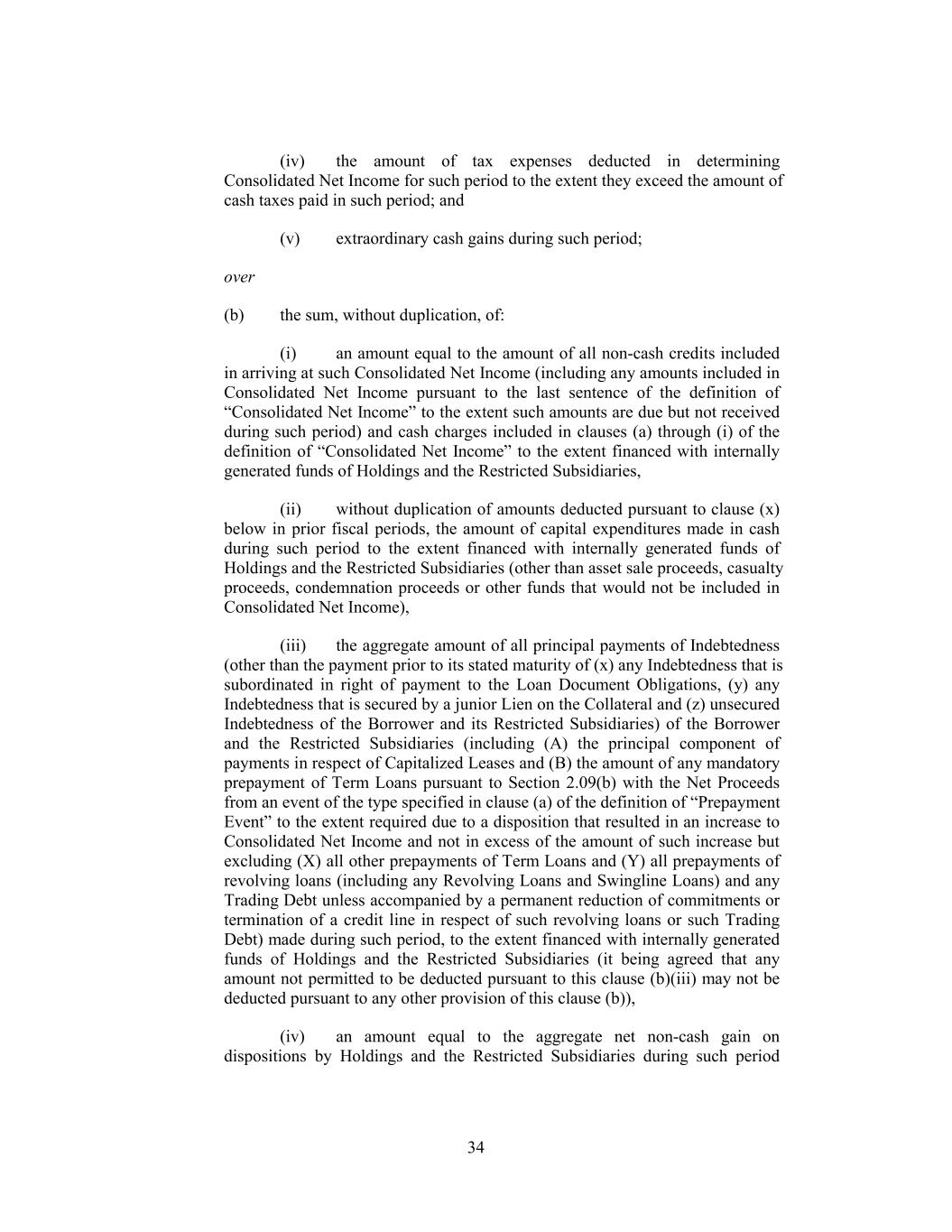 (iv) the amount of tax expenses deducted in determining Consolidated Net Income for such period to the extent they exceed the amount of cash taxes paid in such period; and (v) extraordinary cash gains during such period; over (b) the sum, without duplication, of: (i) an amount equal to the amount of all non-cash credits included in arriving at such Consolidated Net Income (including any amounts included in Consolidated Net Income pursuant to the last sentence of the definition of “Consolidated Net Income” to the extent such amounts are due but not received during such period) and cash charges included in clauses (a) through (i) of the definition of “Consolidated Net Income” to the extent financed with internally generated funds of Holdings and the Restricted Subsidiaries, (ii) without duplication of amounts deducted pursuant to clause (x) below in prior fiscal periods, the amount of capital expenditures made in cash during such period to the extent financed with internally generated funds of Holdings and the Restricted Subsidiaries (other than asset sale proceeds, casualty proceeds, condemnation proceeds or other funds that would not be included in Consolidated Net Income), (iii) the aggregate amount of all principal payments of Indebtedness (other than the payment prior to its stated maturity of (x) any Indebtedness that is subordinated in right of payment to the Loan Document Obligations, (y) any Indebtedness that is secured by a junior Lien on the Collateral and (z) unsecured Indebtedness of the Borrower and its Restricted Subsidiaries) of the Borrower and the Restricted Subsidiaries (including (A) the principal component of payments in respect of Capitalized Leases and (B) the amount of any mandatory prepayment of Term Loans pursuant to Section 2.09(b) with the Net Proceeds from an event of the type specified in clause (a) of the definition of “Prepayment Event” to the extent required due to a disposition that resulted in an increase to Consolidated Net Income and not in excess of the amount of such increase but excluding (X) all other prepayments of Term Loans and (Y) all prepayments of revolving loans (including any Revolving Loans and Swingline Loans) and any Trading Debt unless accompanied by a permanent reduction of commitments or termination of a credit line in respect of such revolving loans or such Trading Debt) made during such period, to the extent financed with internally generated funds of Holdings and the Restricted Subsidiaries (it being agreed that any amount not permitted to be deducted pursuant to this clause (b)(iii) may not be deducted pursuant to any other provision of this clause (b)), (iv) an amount equal to the aggregate net non-cash gain on dispositions by Holdings and the Restricted Subsidiaries during such period 34