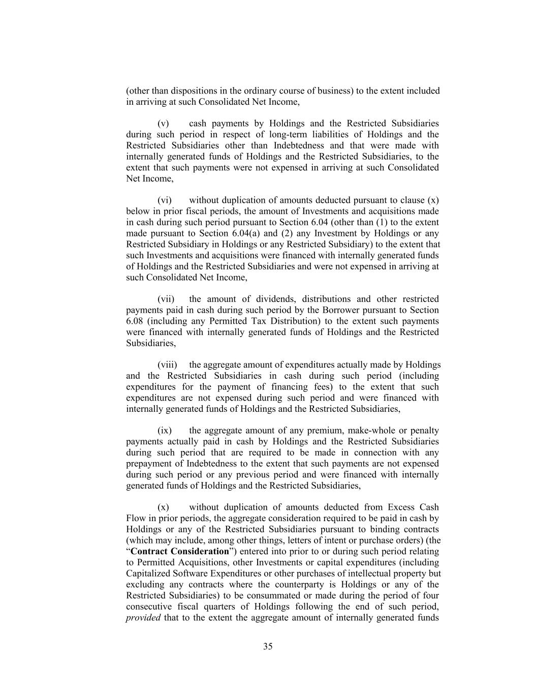 (other than dispositions in the ordinary course of business) to the extent included in arriving at such Consolidated Net Income, (v) cash payments by Holdings and the Restricted Subsidiaries during such period in respect of long-term liabilities of Holdings and the Restricted Subsidiaries other than Indebtedness and that were made with internally generated funds of Holdings and the Restricted Subsidiaries, to the extent that such payments were not expensed in arriving at such Consolidated Net Income, (vi) without duplication of amounts deducted pursuant to clause (x) below in prior fiscal periods, the amount of Investments and acquisitions made in cash during such period pursuant to Section 6.04 (other than (1) to the extent made pursuant to Section 6.04(a) and (2) any Investment by Holdings or any Restricted Subsidiary in Holdings or any Restricted Subsidiary) to the extent that such Investments and acquisitions were financed with internally generated funds of Holdings and the Restricted Subsidiaries and were not expensed in arriving at such Consolidated Net Income, (vii) the amount of dividends, distributions and other restricted payments paid in cash during such period by the Borrower pursuant to Section 6.08 (including any Permitted Tax Distribution) to the extent such payments were financed with internally generated funds of Holdings and the Restricted Subsidiaries, (viii) the aggregate amount of expenditures actually made by Holdings and the Restricted Subsidiaries in cash during such period (including expenditures for the payment of financing fees) to the extent that such expenditures are not expensed during such period and were financed with internally generated funds of Holdings and the Restricted Subsidiaries, (ix) the aggregate amount of any premium, make-whole or penalty payments actually paid in cash by Holdings and the Restricted Subsidiaries during such period that are required to be made in connection with any prepayment of Indebtedness to the extent that such payments are not expensed during such period or any previous period and were financed with internally generated funds of Holdings and the Restricted Subsidiaries, (x) without duplication of amounts deducted from Excess Cash Flow in prior periods, the aggregate consideration required to be paid in cash by Holdings or any of the Restricted Subsidiaries pursuant to binding contracts (which may include, among other things, letters of intent or purchase orders) (the “Contract Consideration”) entered into prior to or during such period relating to Permitted Acquisitions, other Investments or capital expenditures (including Capitalized Software Expenditures or other purchases of intellectual property but excluding any contracts where the counterparty is Holdings or any of the Restricted Subsidiaries) to be consummated or made during the period of four consecutive fiscal quarters of Holdings following the end of such period, provided that to the extent the aggregate amount of internally generated funds 35