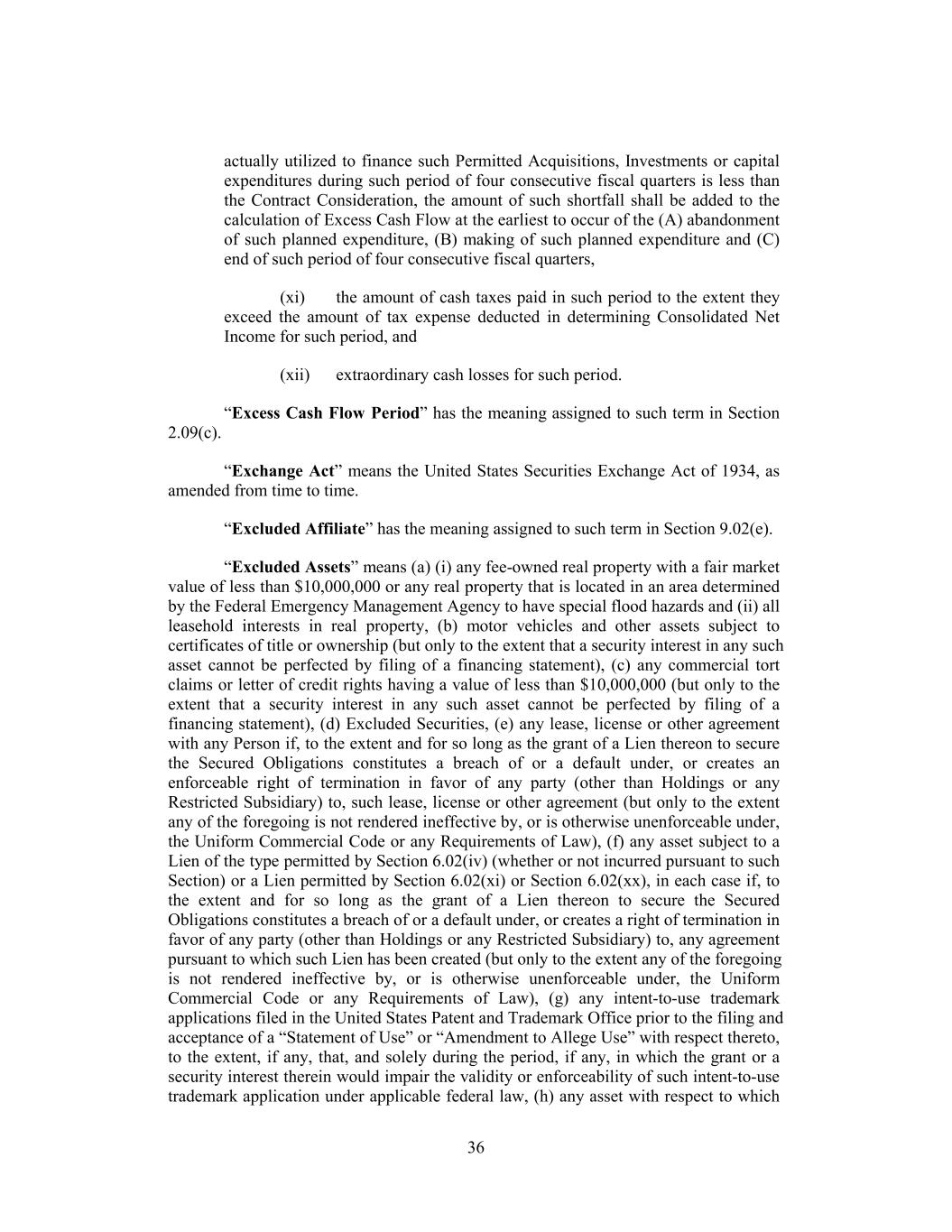 actually utilized to finance such Permitted Acquisitions, Investments or capital expenditures during such period of four consecutive fiscal quarters is less than the Contract Consideration, the amount of such shortfall shall be added to the calculation of Excess Cash Flow at the earliest to occur of the (A) abandonment of such planned expenditure, (B) making of such planned expenditure and (C) end of such period of four consecutive fiscal quarters, (xi) the amount of cash taxes paid in such period to the extent they exceed the amount of tax expense deducted in determining Consolidated Net Income for such period, and (xii) extraordinary cash losses for such period. “Excess Cash Flow Period” has the meaning assigned to such term in Section 2.09(c). “Exchange Act” means the United States Securities Exchange Act of 1934, as amended from time to time. “Excluded Affiliate” has the meaning assigned to such term in Section 9.02(e). “Excluded Assets” means (a) (i) any fee-owned real property with a fair market value of less than $10,000,000 or any real property that is located in an area determined by the Federal Emergency Management Agency to have special flood hazards and (ii) all leasehold interests in real property, (b) motor vehicles and other assets subject to certificates of title or ownership (but only to the extent that a security interest in any such asset cannot be perfected by filing of a financing statement), (c) any commercial tort claims or letter of credit rights having a value of less than $10,000,000 (but only to the extent that a security interest in any such asset cannot be perfected by filing of a financing statement), (d) Excluded Securities, (e) any lease, license or other agreement with any Person if, to the extent and for so long as the grant of a Lien thereon to secure the Secured Obligations constitutes a breach of or a default under, or creates an enforceable right of termination in favor of any party (other than Holdings or any Restricted Subsidiary) to, such lease, license or other agreement (but only to the extent any of the foregoing is not rendered ineffective by, or is otherwise unenforceable under, the Uniform Commercial Code or any Requirements of Law), (f) any asset subject to a Lien of the type permitted by Section 6.02(iv) (whether or not incurred pursuant to such Section) or a Lien permitted by Section 6.02(xi) or Section 6.02(xx), in each case if, to the extent and for so long as the grant of a Lien thereon to secure the Secured Obligations constitutes a breach of or a default under, or creates a right of termination in favor of any party (other than Holdings or any Restricted Subsidiary) to, any agreement pursuant to which such Lien has been created (but only to the extent any of the foregoing is not rendered ineffective by, or is otherwise unenforceable under, the Uniform Commercial Code or any Requirements of Law), (g) any intent-to-use trademark applications filed in the United States Patent and Trademark Office prior to the filing and acceptance of a “Statement of Use” or “Amendment to Allege Use” with respect thereto, to the extent, if any, that, and solely during the period, if any, in which the grant or a security interest therein would impair the validity or enforceability of such intent-to-use trademark application under applicable federal law, (h) any asset with respect to which 36