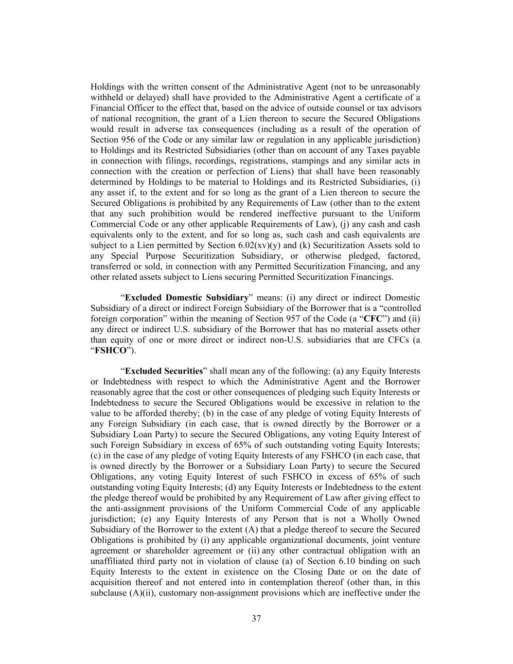 Holdings with the written consent of the Administrative Agent (not to be unreasonably withheld or delayed) shall have provided to the Administrative Agent a certificate of a Financial Officer to the effect that, based on the advice of outside counsel or tax advisors of national recognition, the grant of a Lien thereon to secure the Secured Obligations would result in adverse tax consequences (including as a result of the operation of Section 956 of the Code or any similar law or regulation in any applicable jurisdiction) to Holdings and its Restricted Subsidiaries (other than on account of any Taxes payable in connection with filings, recordings, registrations, stampings and any similar acts in connection with the creation or perfection of Liens) that shall have been reasonably determined by Holdings to be material to Holdings and its Restricted Subsidiaries, (i) any asset if, to the extent and for so long as the grant of a Lien thereon to secure the Secured Obligations is prohibited by any Requirements of Law (other than to the extent that any such prohibition would be rendered ineffective pursuant to the Uniform Commercial Code or any other applicable Requirements of Law), (j) any cash and cash equivalents only to the extent, and for so long as, such cash and cash equivalents are subject to a Lien permitted by Section 6.02(xv)(y) and (k) Securitization Assets sold to any Special Purpose Securitization Subsidiary, or otherwise pledged, factored, transferred or sold, in connection with any Permitted Securitization Financing, and any other related assets subject to Liens securing Permitted Securitization Financings. “Excluded Domestic Subsidiary” means: (i) any direct or indirect Domestic Subsidiary of a direct or indirect Foreign Subsidiary of the Borrower that is a “controlled foreign corporation” within the meaning of Section 957 of the Code (a “CFC”) and (ii) any direct or indirect U.S. subsidiary of the Borrower that has no material assets other than equity of one or more direct or indirect non-U.S. subsidiaries that are CFCs (a “FSHCO”). “Excluded Securities” shall mean any of the following: (a) any Equity Interests or Indebtedness with respect to which the Administrative Agent and the Borrower reasonably agree that the cost or other consequences of pledging such Equity Interests or Indebtedness to secure the Secured Obligations would be excessive in relation to the value to be afforded thereby; (b) in the case of any pledge of voting Equity Interests of any Foreign Subsidiary (in each case, that is owned directly by the Borrower or a Subsidiary Loan Party) to secure the Secured Obligations, any voting Equity Interest of such Foreign Subsidiary in excess of 65% of such outstanding voting Equity Interests; (c) in the case of any pledge of voting Equity Interests of any FSHCO (in each case, that is owned directly by the Borrower or a Subsidiary Loan Party) to secure the Secured Obligations, any voting Equity Interest of such FSHCO in excess of 65% of such outstanding voting Equity Interests; (d) any Equity Interests or Indebtedness to the extent the pledge thereof would be prohibited by any Requirement of Law after giving effect to the anti-assignment provisions of the Uniform Commercial Code of any applicable jurisdiction; (e) any Equity Interests of any Person that is not a Wholly Owned Subsidiary of the Borrower to the extent (A) that a pledge thereof to secure the Secured Obligations is prohibited by (i) any applicable organizational documents, joint venture agreement or shareholder agreement or (ii) any other contractual obligation with an unaffiliated third party not in violation of clause (a) of Section 6.10 binding on such Equity Interests to the extent in existence on the Closing Date or on the date of acquisition thereof and not entered into in contemplation thereof (other than, in this subclause (A)(ii), customary non-assignment provisions which are ineffective under the 37