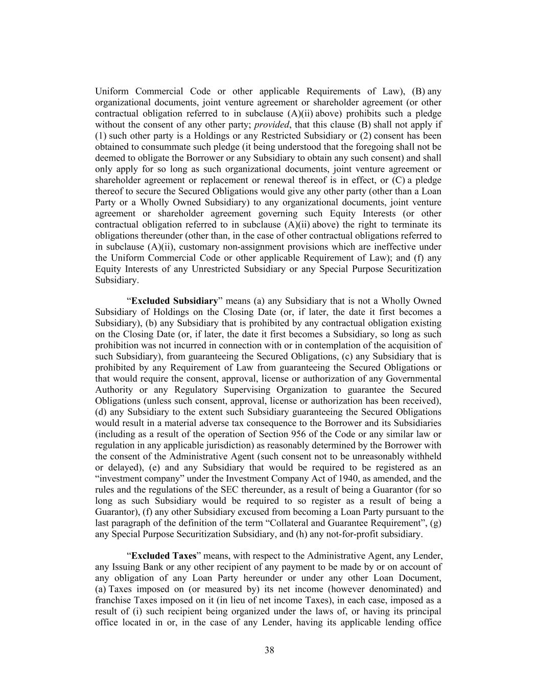 Uniform Commercial Code or other applicable Requirements of Law), (B) any organizational documents, joint venture agreement or shareholder agreement (or other contractual obligation referred to in subclause (A)(ii) above) prohibits such a pledge without the consent of any other party; provided, that this clause (B) shall not apply if (1) such other party is a Holdings or any Restricted Subsidiary or (2) consent has been obtained to consummate such pledge (it being understood that the foregoing shall not be deemed to obligate the Borrower or any Subsidiary to obtain any such consent) and shall only apply for so long as such organizational documents, joint venture agreement or shareholder agreement or replacement or renewal thereof is in effect, or (C) a pledge thereof to secure the Secured Obligations would give any other party (other than a Loan Party or a Wholly Owned Subsidiary) to any organizational documents, joint venture agreement or shareholder agreement governing such Equity Interests (or other contractual obligation referred to in subclause (A)(ii) above) the right to terminate its obligations thereunder (other than, in the case of other contractual obligations referred to in subclause (A)(ii), customary non-assignment provisions which are ineffective under the Uniform Commercial Code or other applicable Requirement of Law); and (f) any Equity Interests of any Unrestricted Subsidiary or any Special Purpose Securitization Subsidiary. “Excluded Subsidiary” means (a) any Subsidiary that is not a Wholly Owned Subsidiary of Holdings on the Closing Date (or, if later, the date it first becomes a Subsidiary), (b) any Subsidiary that is prohibited by any contractual obligation existing on the Closing Date (or, if later, the date it first becomes a Subsidiary, so long as such prohibition was not incurred in connection with or in contemplation of the acquisition of such Subsidiary), from guaranteeing the Secured Obligations, (c) any Subsidiary that is prohibited by any Requirement of Law from guaranteeing the Secured Obligations or that would require the consent, approval, license or authorization of any Governmental Authority or any Regulatory Supervising Organization to guarantee the Secured Obligations (unless such consent, approval, license or authorization has been received), (d) any Subsidiary to the extent such Subsidiary guaranteeing the Secured Obligations would result in a material adverse tax consequence to the Borrower and its Subsidiaries (including as a result of the operation of Section 956 of the Code or any similar law or regulation in any applicable jurisdiction) as reasonably determined by the Borrower with the consent of the Administrative Agent (such consent not to be unreasonably withheld or delayed), (e) and any Subsidiary that would be required to be registered as an “investment company” under the Investment Company Act of 1940, as amended, and the rules and the regulations of the SEC thereunder, as a result of being a Guarantor (for so long as such Subsidiary would be required to so register as a result of being a Guarantor), (f) any other Subsidiary excused from becoming a Loan Party pursuant to the last paragraph of the definition of the term “Collateral and Guarantee Requirement”, (g) any Special Purpose Securitization Subsidiary, and (h) any not-for-profit subsidiary. “Excluded Taxes” means, with respect to the Administrative Agent, any Lender, any Issuing Bank or any other recipient of any payment to be made by or on account of any obligation of any Loan Party hereunder or under any other Loan Document, (a) Taxes imposed on (or measured by) its net income (however denominated) and franchise Taxes imposed on it (in lieu of net income Taxes), in each case, imposed as a result of (i) such recipient being organized under the laws of, or having its principal office located in or, in the case of any Lender, having its applicable lending office 38