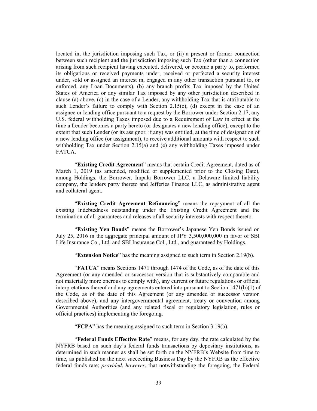 located in, the jurisdiction imposing such Tax, or (ii) a present or former connection between such recipient and the jurisdiction imposing such Tax (other than a connection arising from such recipient having executed, delivered, or become a party to, performed its obligations or received payments under, received or perfected a security interest under, sold or assigned an interest in, engaged in any other transaction pursuant to, or enforced, any Loan Documents), (b) any branch profits Tax imposed by the United States of America or any similar Tax imposed by any other jurisdiction described in clause (a) above, (c) in the case of a Lender, any withholding Tax that is attributable to such Lender’s failure to comply with Section 2.15(e), (d) except in the case of an assignee or lending office pursuant to a request by the Borrower under Section 2.17, any U.S. federal withholding Taxes imposed due to a Requirement of Law in effect at the time a Lender becomes a party hereto (or designates a new lending office), except to the extent that such Lender (or its assignor, if any) was entitled, at the time of designation of a new lending office (or assignment), to receive additional amounts with respect to such withholding Tax under Section 2.15(a) and (e) any withholding Taxes imposed under FATCA. “Existing Credit Agreement” means that certain Credit Agreement, dated as of March 1, 2019 (as amended, modified or supplemented prior to the Closing Date), among Holdings, the Borrower, Impala Borrower LLC, a Delaware limited liability company, the lenders party thereto and Jefferies Finance LLC, as administrative agent and collateral agent. “Existing Credit Agreement Refinancing” means the repayment of all the existing Indebtedness outstanding under the Existing Credit Agreement and the termination of all guarantees and releases of all security interests with respect thereto. “Existing Yen Bonds” means the Borrower’s Japanese Yen Bonds issued on July 25, 2016 in the aggregate principal amount of JPY 3,500,000,000 in favor of SBI Life Insurance Co., Ltd. and SBI Insurance Col., Ltd., and guaranteed by Holdings. “Extension Notice” has the meaning assigned to such term in Section 2.19(b). “FATCA” means Sections 1471 through 1474 of the Code, as of the date of this Agreement (or any amended or successor version that is substantively comparable and not materially more onerous to comply with), any current or future regulations or official interpretations thereof and any agreements entered into pursuant to Section 1471(b)(1) of the Code, as of the date of this Agreement (or any amended or successor version described above), and any intergovernmental agreement, treaty or convention among Governmental Authorities (and any related fiscal or regulatory legislation, rules or official practices) implementing the foregoing. “FCPA” has the meaning assigned to such term in Section 3.19(b). “Federal Funds Effective Rate” means, for any day, the rate calculated by the NYFRB based on such day’s federal funds transactions by depositary institutions, as determined in such manner as shall be set forth on the NYFRB’s Website from time to time, as published on the next succeeding Business Day by the NYFRB as the effective federal funds rate; provided, however, that notwithstanding the foregoing, the Federal 39
