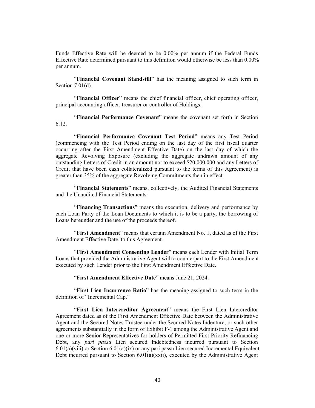 Funds Effective Rate will be deemed to be 0.00% per annum if the Federal Funds Effective Rate determined pursuant to this definition would otherwise be less than 0.00% per annum. “Financial Covenant Standstill” has the meaning assigned to such term in Section 7.01(d). “Financial Officer” means the chief financial officer, chief operating officer, principal accounting officer, treasurer or controller of Holdings. “Financial Performance Covenant” means the covenant set forth in Section 6.12. “Financial Performance Covenant Test Period” means any Test Period (commencing with the Test Period ending on the last day of the first fiscal quarter occurring after the First Amendment Effective Date) on the last day of which the aggregate Revolving Exposure (excluding the aggregate undrawn amount of any outstanding Letters of Credit in an amount not to exceed $20,000,000 and any Letters of Credit that have been cash collateralized pursuant to the terms of this Agreement) is greater than 35% of the aggregate Revolving Commitments then in effect. “Financial Statements” means, collectively, the Audited Financial Statements and the Unaudited Financial Statements. “Financing Transactions” means the execution, delivery and performance by each Loan Party of the Loan Documents to which it is to be a party, the borrowing of Loans hereunder and the use of the proceeds thereof. “First Amendment” means that certain Amendment No. 1, dated as of the First Amendment Effective Date, to this Agreement. “First Amendment Consenting Lender” means each Lender with Initial Term Loans that provided the Administrative Agent with a counterpart to the First Amendment executed by such Lender prior to the First Amendment Effective Date. “First Amendment Effective Date” means June 21, 2024. “First Lien Incurrence Ratio” has the meaning assigned to such term in the definition of “Incremental Cap.” “First Lien Intercreditor Agreement” means the First Lien Intercreditor Agreement dated as of the First Amendment Effective Date between the Administrative Agent and the Secured Notes Trustee under the Secured Notes Indenture, or such other agreements substantially in the form of Exhibit F-1 among the Administrative Agent and one or more Senior Representatives for holders of Permitted First Priority Refinancing Debt, any pari passu Lien secured Indebtedness incurred pursuant to Section 6.01(a)(viii) or Section 6.01(a)(ix) or any pari passu Lien secured Incremental Equivalent Debt incurred pursuant to Section 6.01(a)(xxii), executed by the Administrative Agent 40