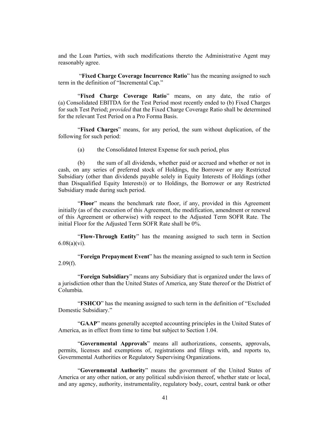 and the Loan Parties, with such modifications thereto the Administrative Agent may reasonably agree. “Fixed Charge Coverage Incurrence Ratio” has the meaning assigned to such term in the definition of “Incremental Cap.” “Fixed Charge Coverage Ratio” means, on any date, the ratio of (a) Consolidated EBITDA for the Test Period most recently ended to (b) Fixed Charges for such Test Period; provided that the Fixed Charge Coverage Ratio shall be determined for the relevant Test Period on a Pro Forma Basis. “Fixed Charges” means, for any period, the sum without duplication, of the following for such period: (a) the Consolidated Interest Expense for such period, plus (b) the sum of all dividends, whether paid or accrued and whether or not in cash, on any series of preferred stock of Holdings, the Borrower or any Restricted Subsidiary (other than dividends payable solely in Equity Interests of Holdings (other than Disqualified Equity Interests)) or to Holdings, the Borrower or any Restricted Subsidiary made during such period. “Floor” means the benchmark rate floor, if any, provided in this Agreement initially (as of the execution of this Agreement, the modification, amendment or renewal of this Agreement or otherwise) with respect to the Adjusted Term SOFR Rate. The initial Floor for the Adjusted Term SOFR Rate shall be 0%. “Flow-Through Entity” has the meaning assigned to such term in Section 6.08(a)(vi). “Foreign Prepayment Event” has the meaning assigned to such term in Section 2.09(f). “Foreign Subsidiary” means any Subsidiary that is organized under the laws of a jurisdiction other than the United States of America, any State thereof or the District of Columbia. “FSHCO” has the meaning assigned to such term in the definition of “Excluded Domestic Subsidiary.” “GAAP” means generally accepted accounting principles in the United States of America, as in effect from time to time but subject to Section 1.04. “Governmental Approvals” means all authorizations, consents, approvals, permits, licenses and exemptions of, registrations and filings with, and reports to, Governmental Authorities or Regulatory Supervising Organizations. “Governmental Authority” means the government of the United States of America or any other nation, or any political subdivision thereof, whether state or local, and any agency, authority, instrumentality, regulatory body, court, central bank or other 41
