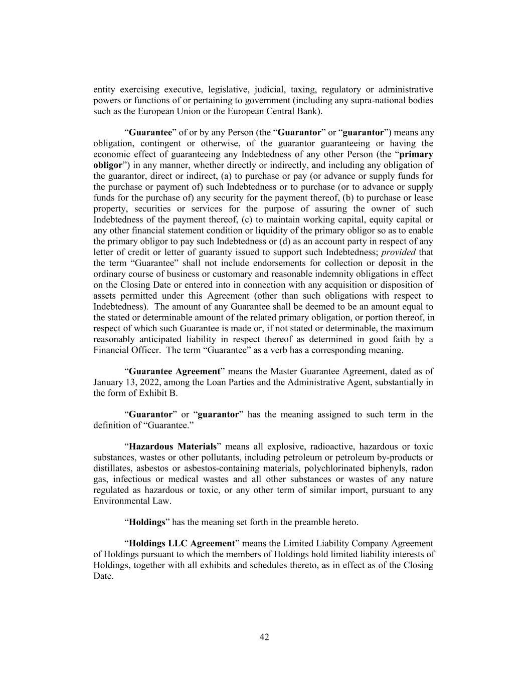 entity exercising executive, legislative, judicial, taxing, regulatory or administrative powers or functions of or pertaining to government (including any supra-national bodies such as the European Union or the European Central Bank). “Guarantee” of or by any Person (the “Guarantor” or “guarantor”) means any obligation, contingent or otherwise, of the guarantor guaranteeing or having the economic effect of guaranteeing any Indebtedness of any other Person (the “primary obligor”) in any manner, whether directly or indirectly, and including any obligation of the guarantor, direct or indirect, (a) to purchase or pay (or advance or supply funds for the purchase or payment of) such Indebtedness or to purchase (or to advance or supply funds for the purchase of) any security for the payment thereof, (b) to purchase or lease property, securities or services for the purpose of assuring the owner of such Indebtedness of the payment thereof, (c) to maintain working capital, equity capital or any other financial statement condition or liquidity of the primary obligor so as to enable the primary obligor to pay such Indebtedness or (d) as an account party in respect of any letter of credit or letter of guaranty issued to support such Indebtedness; provided that the term “Guarantee” shall not include endorsements for collection or deposit in the ordinary course of business or customary and reasonable indemnity obligations in effect on the Closing Date or entered into in connection with any acquisition or disposition of assets permitted under this Agreement (other than such obligations with respect to Indebtedness). The amount of any Guarantee shall be deemed to be an amount equal to the stated or determinable amount of the related primary obligation, or portion thereof, in respect of which such Guarantee is made or, if not stated or determinable, the maximum reasonably anticipated liability in respect thereof as determined in good faith by a Financial Officer. The term “Guarantee” as a verb has a corresponding meaning. “Guarantee Agreement” means the Master Guarantee Agreement, dated as of January 13, 2022, among the Loan Parties and the Administrative Agent, substantially in the form of Exhibit B. “Guarantor” or “guarantor” has the meaning assigned to such term in the definition of “Guarantee.” “Hazardous Materials” means all explosive, radioactive, hazardous or toxic substances, wastes or other pollutants, including petroleum or petroleum by-products or distillates, asbestos or asbestos-containing materials, polychlorinated biphenyls, radon gas, infectious or medical wastes and all other substances or wastes of any nature regulated as hazardous or toxic, or any other term of similar import, pursuant to any Environmental Law. “Holdings” has the meaning set forth in the preamble hereto. “Holdings LLC Agreement” means the Limited Liability Company Agreement of Holdings pursuant to which the members of Holdings hold limited liability interests of Holdings, together with all exhibits and schedules thereto, as in effect as of the Closing Date. 42