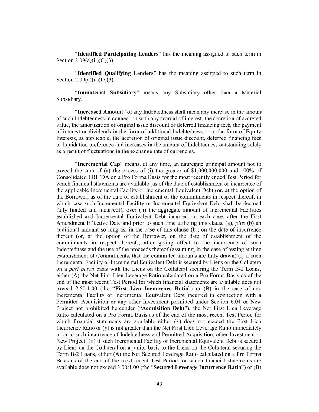 “Identified Participating Lenders” has the meaning assigned to such term in Section 2.09(a)(ii)(C)(3). “Identified Qualifying Lenders” has the meaning assigned to such term in Section 2.09(a)(ii)(D)(3). “Immaterial Subsidiary” means any Subsidiary other than a Material Subsidiary. “Increased Amount” of any Indebtedness shall mean any increase in the amount of such Indebtedness in connection with any accrual of interest, the accretion of accreted value, the amortization of original issue discount or deferred financing fees, the payment of interest or dividends in the form of additional Indebtedness or in the form of Equity Interests, as applicable, the accretion of original issue discount, deferred financing fees or liquidation preference and increases in the amount of Indebtedness outstanding solely as a result of fluctuations in the exchange rate of currencies. “Incremental Cap” means, at any time, an aggregate principal amount not to exceed the sum of (a) the excess of (i) the greater of $1,000,000,000 and 100% of Consolidated EBITDA on a Pro Forma Basis for the most recently ended Test Period for which financial statements are available (as of the date of establishment or incurrence of the applicable Incremental Facility or Incremental Equivalent Debt (or, at the option of the Borrower, as of the date of establishment of the commitments in respect thereof, in which case such Incremental Facility or Incremental Equivalent Debt shall be deemed fully funded and incurred)), over (ii) the aggregate amount of Incremental Facilities established and Incremental Equivalent Debt incurred, in each case, after the First Amendment Effective Date and prior to such time utilizing this clause (a), plus (b) an additional amount so long as, in the case of this clause (b), on the date of incurrence thereof (or, at the option of the Borrower, on the date of establishment of the commitments in respect thereof), after giving effect to the incurrence of such Indebtedness and the use of the proceeds thereof (assuming, in the case of testing at time establishment of Commitments, that the committed amounts are fully drawn) (i) if such Incremental Facility or Incremental Equivalent Debt is secured by Liens on the Collateral on a pari passu basis with the Liens on the Collateral securing the Term B-2 Loans, either (A) the Net First Lien Leverage Ratio calculated on a Pro Forma Basis as of the end of the most recent Test Period for which financial statements are available does not exceed 2.50:1.00 (the “First Lien Incurrence Ratio”) or (B) in the case of any Incremental Facility or Incremental Equivalent Debt incurred in connection with a Permitted Acquisition or any other Investment permitted under Section 6.04 or New Project not prohibited hereunder (“Acquisition Debt”), the Net First Lien Leverage Ratio calculated on a Pro Forma Basis as of the end of the most recent Test Period for which financial statements are available either (x) does not exceed the First Lien Incurrence Ratio or (y) is not greater than the Net First Lien Leverage Ratio immediately prior to such incurrence of Indebtedness and Permitted Acquisition, other Investment or New Project, (ii) if such Incremental Facility or Incremental Equivalent Debt is secured by Liens on the Collateral on a junior basis to the Liens on the Collateral securing the Term B-2 Loans, either (A) the Net Secured Leverage Ratio calculated on a Pro Forma Basis as of the end of the most recent Test Period for which financial statements are available does not exceed 3.00:1.00 (the “Secured Leverage Incurrence Ratio”) or (B) 43