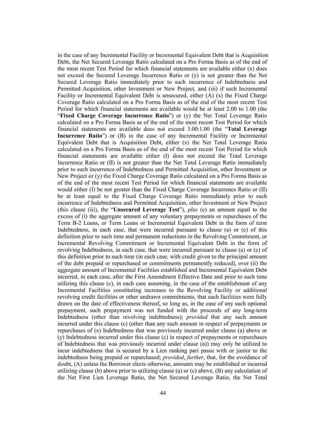 in the case of any Incremental Facility or Incremental Equivalent Debt that is Acquisition Debt, the Net Secured Leverage Ratio calculated on a Pro Forma Basis as of the end of the most recent Test Period for which financial statements are available either (x) does not exceed the Secured Leverage Incurrence Ratio or (y) is not greater than the Net Secured Leverage Ratio immediately prior to such incurrence of Indebtedness and Permitted Acquisition, other Investment or New Project, and (iii) if such Incremental Facility or Incremental Equivalent Debt is unsecured, either (A) (x) the Fixed Charge Coverage Ratio calculated on a Pro Forma Basis as of the end of the most recent Test Period for which financial statements are available would be at least 2.00 to 1.00 (the “Fixed Charge Coverage Incurrence Ratio”) or (y) the Net Total Leverage Ratio calculated on a Pro Forma Basis as of the end of the most recent Test Period for which financial statements are available does not exceed 3.00:1.00 (the “Total Leverage Incurrence Ratio”) or (B) in the case of any Incremental Facility or Incremental Equivalent Debt that is Acquisition Debt, either (x) the Net Total Leverage Ratio calculated on a Pro Forma Basis as of the end of the most recent Test Period for which financial statements are available either (I) does not exceed the Total Leverage Incurrence Ratio or (II) is not greater than the Net Total Leverage Ratio immediately prior to such incurrence of Indebtedness and Permitted Acquisition, other Investment or New Project or (y) the Fixed Charge Coverage Ratio calculated on a Pro Forma Basis as of the end of the most recent Test Period for which financial statements are available would either (I) be not greater than the Fixed Charge Coverage Incurrence Ratio or (II) be at least equal to the Fixed Charge Coverage Ratio immediately prior to such incurrence of Indebtedness and Permitted Acquisition, other Investment or New Project (this clause (iii), the “Unsecured Leverage Test”), plus (c) an amount equal to the excess of (i) the aggregate amount of any voluntary prepayments or repurchases of the Term B-2 Loans, or Term Loans or Incremental Equivalent Debt in the form of term Indebtedness, in each case, that were incurred pursuant to clause (a) or (c) of this definition prior to such time and permanent reductions in the Revolving Commitment, or Incremental Revolving Commitment or Incremental Equivalent Debt in the form of revolving Indebtedness, in each case, that were incurred pursuant to clause (a) or (c) of this definition prior to such time (in each case, with credit given to the principal amount of the debt prepaid or repurchased or commitments permanently reduced), over (ii) the aggregate amount of Incremental Facilities established and Incremental Equivalent Debt incurred, in each case, after the First Amendment Effective Date and prior to such time utilizing this clause (c), in each case assuming, in the case of the establishment of any Incremental Facilities constituting increases to the Revolving Facility or additional revolving credit facilities or other undrawn commitments, that such facilities were fully drawn on the date of effectiveness thereof, so long as, in the case of any such optional prepayment, such prepayment was not funded with the proceeds of any long-term Indebtedness (other than revolving indebtedness); provided that any such amount incurred under this clause (c) (other than any such amount in respect of prepayments or repurchases of (x) Indebtedness that was previously incurred under clause (a) above or (y) Indebtedness incurred under this clause (c) in respect of prepayments or repurchases of Indebtedness that was previously incurred under clause (a)) may only be utilized to incur indebtedness that is secured by a Lien ranking pari passu with or junior to the indebtedness being prepaid or repurchased; provided, further, that, for the avoidance of doubt, (A) unless the Borrower elects otherwise, amounts may be established or incurred utilizing clause (b) above prior to utilizing clause (a) or (c) above, (B) any calculation of the Net First Lien Leverage Ratio, the Net Secured Leverage Ratio, the Net Total 44