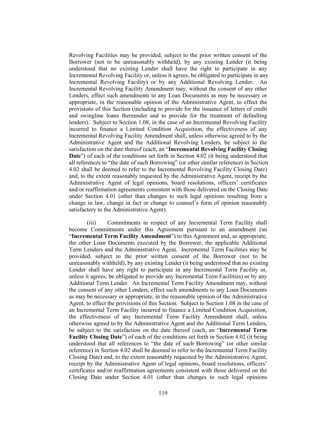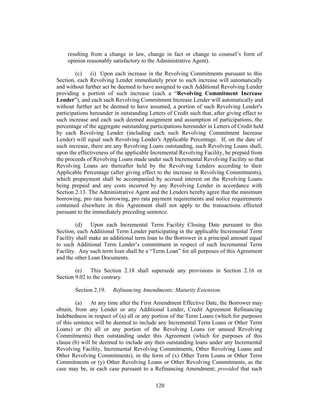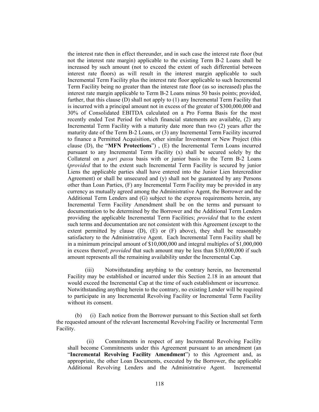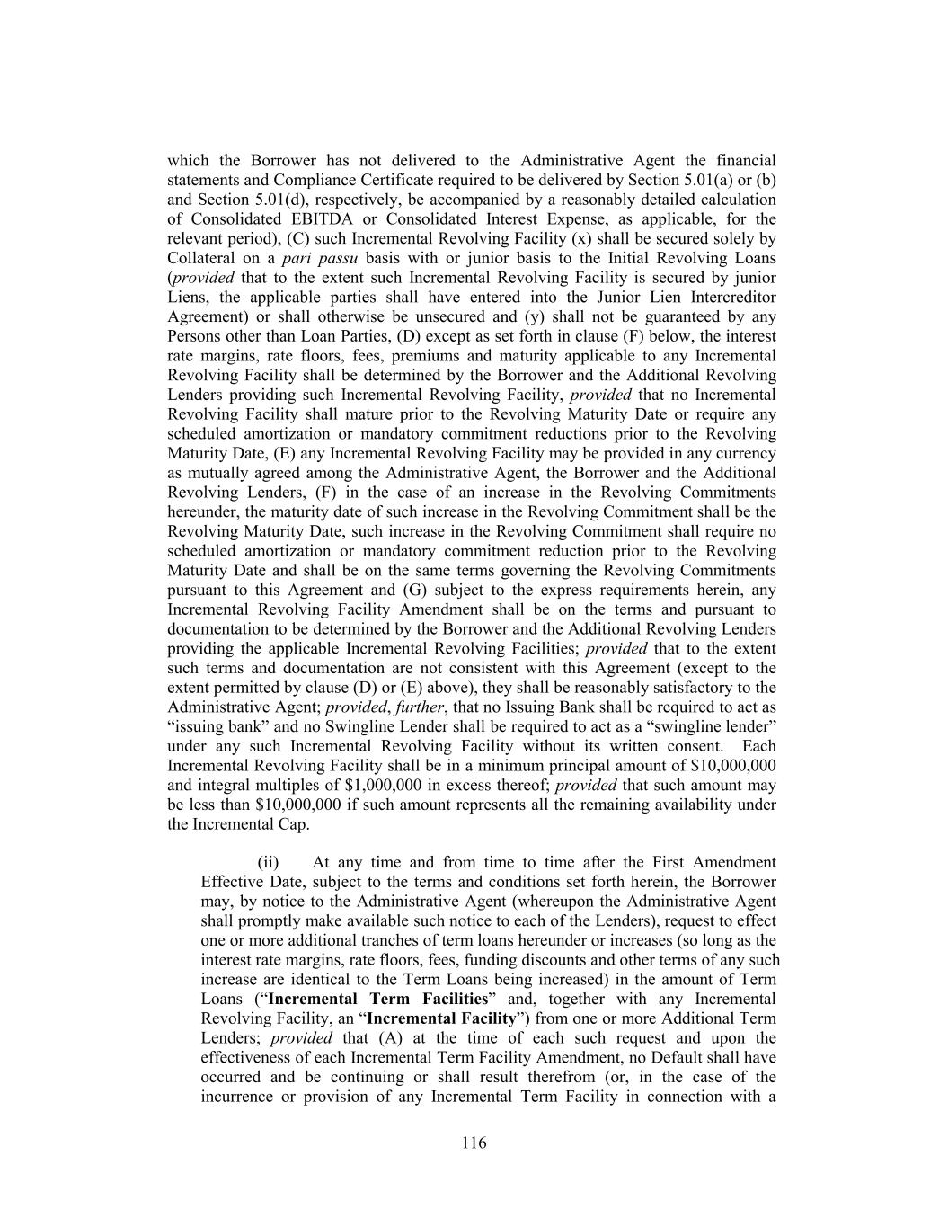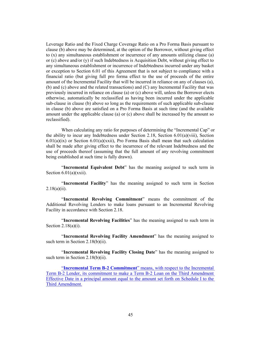 Leverage Ratio and the Fixed Charge Coverage Ratio on a Pro Forma Basis pursuant to clause (b) above may be determined, at the option of the Borrower, without giving effect to (x) any simultaneous establishment or incurrence of any amounts utilizing clause (a) or (c) above and/or (y) if such Indebtedness is Acquisition Debt, without giving effect to any simultaneous establishment or incurrence of Indebtedness incurred under any basket or exception to Section 6.01 of this Agreement that is not subject to compliance with a financial ratio (but giving full pro forma effect to the use of proceeds of the entire amount of the Incremental Facility that will be incurred in reliance on any of clauses (a), (b) and (c) above and the related transactions) and (C) any Incremental Facility that was previously incurred in reliance on clause (a) or (c) above will, unless the Borrower elects otherwise, automatically be reclassified as having been incurred under the applicable sub-clause in clause (b) above so long as the requirements of such applicable sub-clause in clause (b) above are satisfied on a Pro Forma Basis at such time (and the available amount under the applicable clause (a) or (c) above shall be increased by the amount so reclassified). When calculating any ratio for purposes of determining the “Incremental Cap” or the ability to incur any Indebtedness under Section 2.18, Section 6.01(a)(viii), Section 6.01(a)(ix) or Section 6.01(a)(xxii), Pro Forma Basis shall mean that such calculation shall be made after giving effect to the incurrence of the relevant Indebtedness and the use of proceeds thereof (assuming that the full amount of any revolving commitment being established at such time is fully drawn). “Incremental Equivalent Debt” has the meaning assigned to such term in Section 6.01(a)(xxii). “Incremental Facility” has the meaning assigned to such term in Section 2.18(a)(ii). “Incremental Revolving Commitment” means the commitment of the Additional Revolving Lenders to make loans pursuant to an Incremental Revolving Facility in accordance with Section 2.18. “Incremental Revolving Facilities” has the meaning assigned to such term in Section 2.18(a)(i). “Incremental Revolving Facility Amendment” has the meaning assigned to such term in Section 2.18(b)(ii). “Incremental Revolving Facility Closing Date” has the meaning assigned to such term in Section 2.18(b)(ii). “Incremental Term B-2 Commitment” means, with respect to the Incremental Term B-2 Lender, its commitment to make a Term B-2 Loan on the Third Amendment Effective Date in a principal amount equal to the amount set forth on Schedule I to the Third Amendment. 45