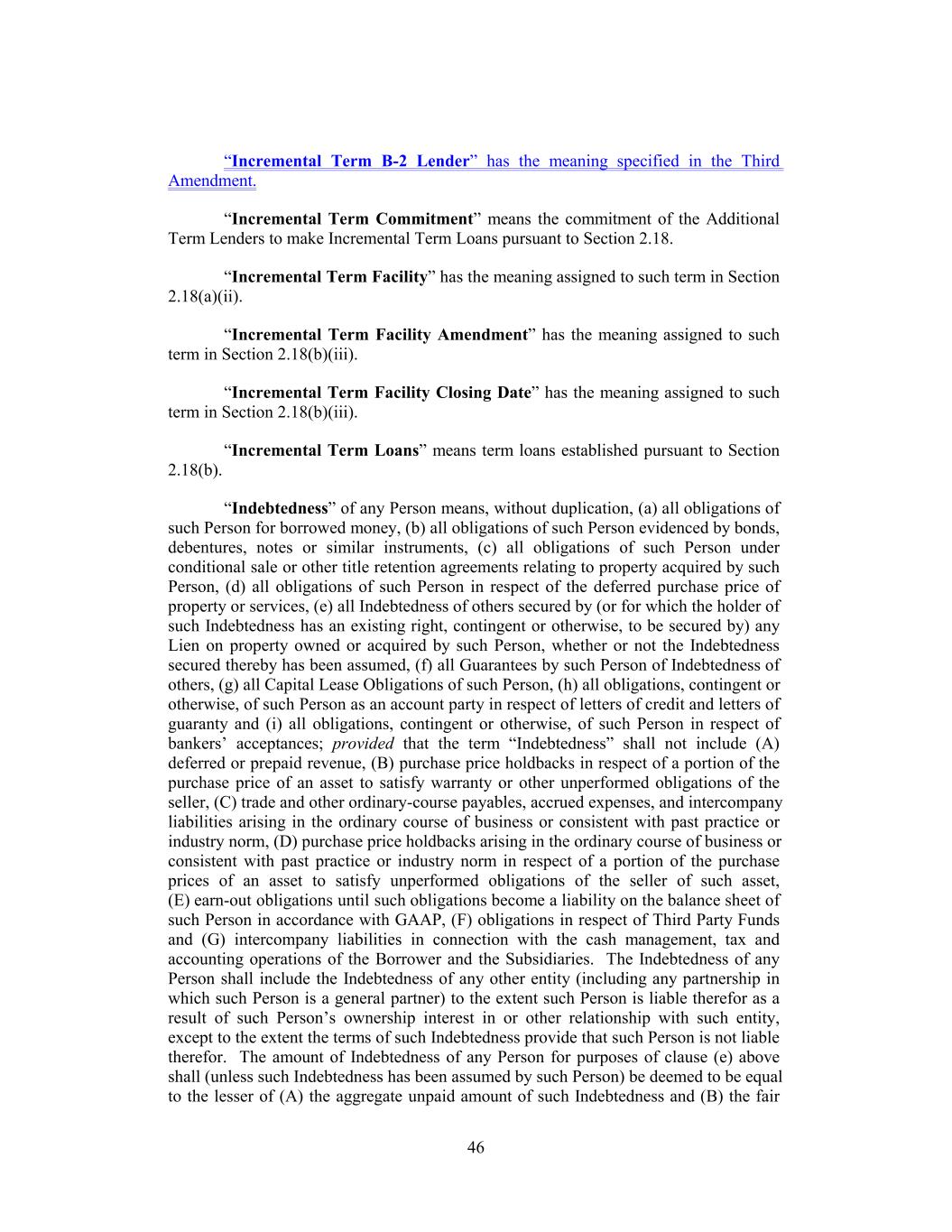 “Incremental Term B-2 Lender” has the meaning specified in the Third Amendment. “Incremental Term Commitment” means the commitment of the Additional Term Lenders to make Incremental Term Loans pursuant to Section 2.18. “Incremental Term Facility” has the meaning assigned to such term in Section 2.18(a)(ii). “Incremental Term Facility Amendment” has the meaning assigned to such term in Section 2.18(b)(iii). “Incremental Term Facility Closing Date” has the meaning assigned to such term in Section 2.18(b)(iii). “Incremental Term Loans” means term loans established pursuant to Section 2.18(b). “Indebtedness” of any Person means, without duplication, (a) all obligations of such Person for borrowed money, (b) all obligations of such Person evidenced by bonds, debentures, notes or similar instruments, (c) all obligations of such Person under conditional sale or other title retention agreements relating to property acquired by such Person, (d) all obligations of such Person in respect of the deferred purchase price of property or services, (e) all Indebtedness of others secured by (or for which the holder of such Indebtedness has an existing right, contingent or otherwise, to be secured by) any Lien on property owned or acquired by such Person, whether or not the Indebtedness secured thereby has been assumed, (f) all Guarantees by such Person of Indebtedness of others, (g) all Capital Lease Obligations of such Person, (h) all obligations, contingent or otherwise, of such Person as an account party in respect of letters of credit and letters of guaranty and (i) all obligations, contingent or otherwise, of such Person in respect of bankers’ acceptances; provided that the term “Indebtedness” shall not include (A) deferred or prepaid revenue, (B) purchase price holdbacks in respect of a portion of the purchase price of an asset to satisfy warranty or other unperformed obligations of the seller, (C) trade and other ordinary-course payables, accrued expenses, and intercompany liabilities arising in the ordinary course of business or consistent with past practice or industry norm, (D) purchase price holdbacks arising in the ordinary course of business or consistent with past practice or industry norm in respect of a portion of the purchase prices of an asset to satisfy unperformed obligations of the seller of such asset, (E) earn-out obligations until such obligations become a liability on the balance sheet of such Person in accordance with GAAP, (F) obligations in respect of Third Party Funds and (G) intercompany liabilities in connection with the cash management, tax and accounting operations of the Borrower and the Subsidiaries. The Indebtedness of any Person shall include the Indebtedness of any other entity (including any partnership in which such Person is a general partner) to the extent such Person is liable therefor as a result of such Person’s ownership interest in or other relationship with such entity, except to the extent the terms of such Indebtedness provide that such Person is not liable therefor. The amount of Indebtedness of any Person for purposes of clause (e) above shall (unless such Indebtedness has been assumed by such Person) be deemed to be equal to the lesser of (A) the aggregate unpaid amount of such Indebtedness and (B) the fair 46
