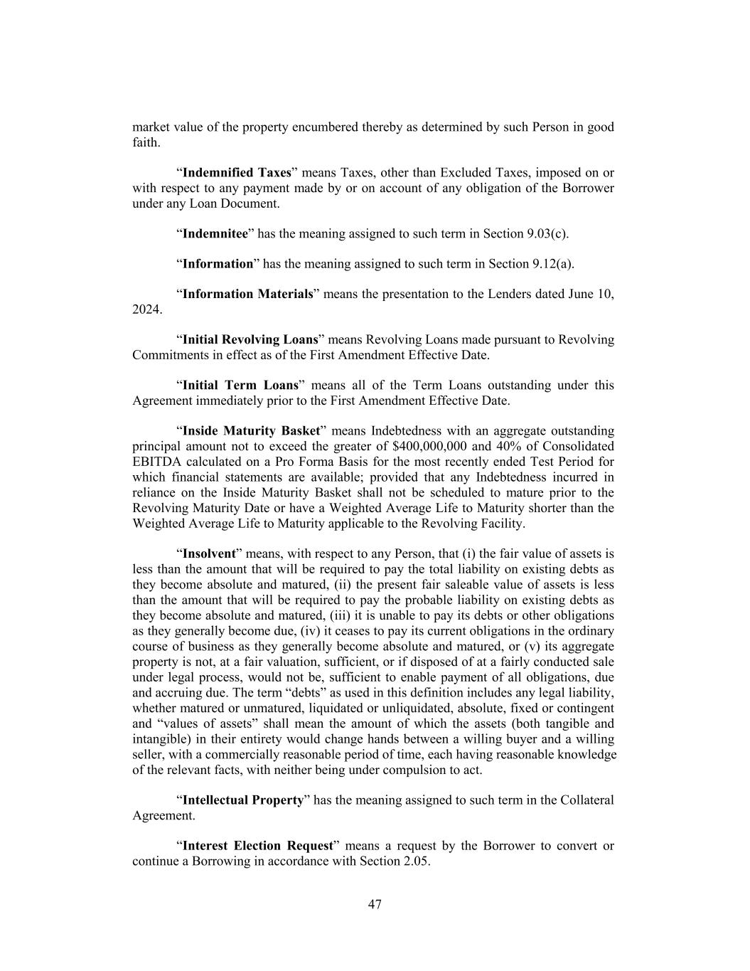 market value of the property encumbered thereby as determined by such Person in good faith. “Indemnified Taxes” means Taxes, other than Excluded Taxes, imposed on or with respect to any payment made by or on account of any obligation of the Borrower under any Loan Document. “Indemnitee” has the meaning assigned to such term in Section 9.03(c). “Information” has the meaning assigned to such term in Section 9.12(a). “Information Materials” means the presentation to the Lenders dated June 10, 2024. “Initial Revolving Loans” means Revolving Loans made pursuant to Revolving Commitments in effect as of the First Amendment Effective Date. “Initial Term Loans” means all of the Term Loans outstanding under this Agreement immediately prior to the First Amendment Effective Date. “Inside Maturity Basket” means Indebtedness with an aggregate outstanding principal amount not to exceed the greater of $400,000,000 and 40% of Consolidated EBITDA calculated on a Pro Forma Basis for the most recently ended Test Period for which financial statements are available; provided that any Indebtedness incurred in reliance on the Inside Maturity Basket shall not be scheduled to mature prior to the Revolving Maturity Date or have a Weighted Average Life to Maturity shorter than the Weighted Average Life to Maturity applicable to the Revolving Facility. “Insolvent” means, with respect to any Person, that (i) the fair value of assets is less than the amount that will be required to pay the total liability on existing debts as they become absolute and matured, (ii) the present fair saleable value of assets is less than the amount that will be required to pay the probable liability on existing debts as they become absolute and matured, (iii) it is unable to pay its debts or other obligations as they generally become due, (iv) it ceases to pay its current obligations in the ordinary course of business as they generally become absolute and matured, or (v) its aggregate property is not, at a fair valuation, sufficient, or if disposed of at a fairly conducted sale under legal process, would not be, sufficient to enable payment of all obligations, due and accruing due. The term “debts” as used in this definition includes any legal liability, whether matured or unmatured, liquidated or unliquidated, absolute, fixed or contingent and “values of assets” shall mean the amount of which the assets (both tangible and intangible) in their entirety would change hands between a willing buyer and a willing seller, with a commercially reasonable period of time, each having reasonable knowledge of the relevant facts, with neither being under compulsion to act. “Intellectual Property” has the meaning assigned to such term in the Collateral Agreement. “Interest Election Request” means a request by the Borrower to convert or continue a Borrowing in accordance with Section 2.05. 47