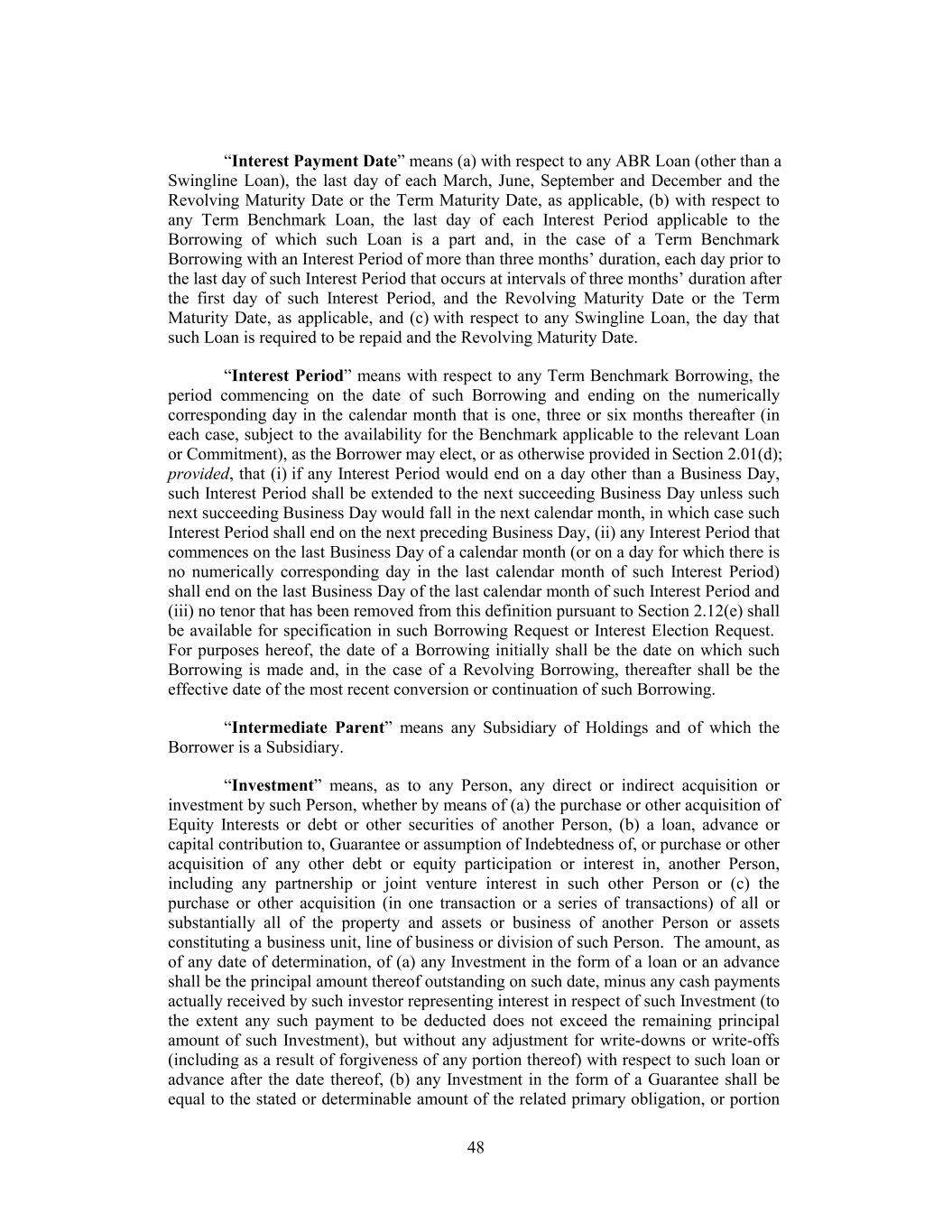 “Interest Payment Date” means (a) with respect to any ABR Loan (other than a Swingline Loan), the last day of each March, June, September and December and the Revolving Maturity Date or the Term Maturity Date, as applicable, (b) with respect to any Term Benchmark Loan, the last day of each Interest Period applicable to the Borrowing of which such Loan is a part and, in the case of a Term Benchmark Borrowing with an Interest Period of more than three months’ duration, each day prior to the last day of such Interest Period that occurs at intervals of three months’ duration after the first day of such Interest Period, and the Revolving Maturity Date or the Term Maturity Date, as applicable, and (c) with respect to any Swingline Loan, the day that such Loan is required to be repaid and the Revolving Maturity Date. “Interest Period” means with respect to any Term Benchmark Borrowing, the period commencing on the date of such Borrowing and ending on the numerically corresponding day in the calendar month that is one, three or six months thereafter (in each case, subject to the availability for the Benchmark applicable to the relevant Loan or Commitment), as the Borrower may elect, or as otherwise provided in Section 2.01(d); provided, that (i) if any Interest Period would end on a day other than a Business Day, such Interest Period shall be extended to the next succeeding Business Day unless such next succeeding Business Day would fall in the next calendar month, in which case such Interest Period shall end on the next preceding Business Day, (ii) any Interest Period that commences on the last Business Day of a calendar month (or on a day for which there is no numerically corresponding day in the last calendar month of such Interest Period) shall end on the last Business Day of the last calendar month of such Interest Period and (iii) no tenor that has been removed from this definition pursuant to Section 2.12(e) shall be available for specification in such Borrowing Request or Interest Election Request. For purposes hereof, the date of a Borrowing initially shall be the date on which such Borrowing is made and, in the case of a Revolving Borrowing, thereafter shall be the effective date of the most recent conversion or continuation of such Borrowing. “Intermediate Parent” means any Subsidiary of Holdings and of which the Borrower is a Subsidiary. “Investment” means, as to any Person, any direct or indirect acquisition or investment by such Person, whether by means of (a) the purchase or other acquisition of Equity Interests or debt or other securities of another Person, (b) a loan, advance or capital contribution to, Guarantee or assumption of Indebtedness of, or purchase or other acquisition of any other debt or equity participation or interest in, another Person, including any partnership or joint venture interest in such other Person or (c) the purchase or other acquisition (in one transaction or a series of transactions) of all or substantially all of the property and assets or business of another Person or assets constituting a business unit, line of business or division of such Person. The amount, as of any date of determination, of (a) any Investment in the form of a loan or an advance shall be the principal amount thereof outstanding on such date, minus any cash payments actually received by such investor representing interest in respect of such Investment (to the extent any such payment to be deducted does not exceed the remaining principal amount of such Investment), but without any adjustment for write-downs or write-offs (including as a result of forgiveness of any portion thereof) with respect to such loan or advance after the date thereof, (b) any Investment in the form of a Guarantee shall be equal to the stated or determinable amount of the related primary obligation, or portion 48