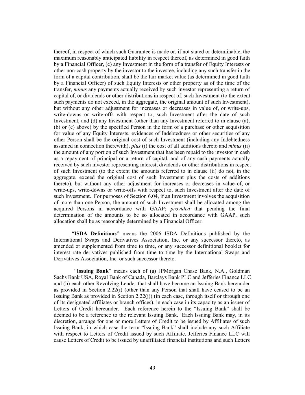 thereof, in respect of which such Guarantee is made or, if not stated or determinable, the maximum reasonably anticipated liability in respect thereof, as determined in good faith by a Financial Officer, (c) any Investment in the form of a transfer of Equity Interests or other non-cash property by the investor to the investee, including any such transfer in the form of a capital contribution, shall be the fair market value (as determined in good faith by a Financial Officer) of such Equity Interests or other property as of the time of the transfer, minus any payments actually received by such investor representing a return of capital of, or dividends or other distributions in respect of, such Investment (to the extent such payments do not exceed, in the aggregate, the original amount of such Investment), but without any other adjustment for increases or decreases in value of, or write-ups, write-downs or write-offs with respect to, such Investment after the date of such Investment, and (d) any Investment (other than any Investment referred to in clause (a), (b) or (c) above) by the specified Person in the form of a purchase or other acquisition for value of any Equity Interests, evidences of Indebtedness or other securities of any other Person shall be the original cost of such Investment (including any Indebtedness assumed in connection therewith), plus (i) the cost of all additions thereto and minus (ii) the amount of any portion of such Investment that has been repaid to the investor in cash as a repayment of principal or a return of capital, and of any cash payments actually received by such investor representing interest, dividends or other distributions in respect of such Investment (to the extent the amounts referred to in clause (ii) do not, in the aggregate, exceed the original cost of such Investment plus the costs of additions thereto), but without any other adjustment for increases or decreases in value of, or write-ups, write-downs or write-offs with respect to, such Investment after the date of such Investment. For purposes of Section 6.04, if an Investment involves the acquisition of more than one Person, the amount of such Investment shall be allocated among the acquired Persons in accordance with GAAP; provided that pending the final determination of the amounts to be so allocated in accordance with GAAP, such allocation shall be as reasonably determined by a Financial Officer. “ISDA Definitions” means the 2006 ISDA Definitions published by the International Swaps and Derivatives Association, Inc. or any successor thereto, as amended or supplemented from time to time, or any successor definitional booklet for interest rate derivatives published from time to time by the International Swaps and Derivatives Association, Inc. or such successor thereto. “Issuing Bank” means each of (a) JPMorgan Chase Bank, N.A., Goldman Sachs Bank USA, Royal Bank of Canada, Barclays Bank PLC and Jefferies Finance LLC and (b) each other Revolving Lender that shall have become an Issuing Bank hereunder as provided in Section 2.22(i) (other than any Person that shall have ceased to be an Issuing Bank as provided in Section 2.22(j)) (in each case, through itself or through one of its designated affiliates or branch offices), in each case in its capacity as an issuer of Letters of Credit hereunder. Each reference herein to the “Issuing Bank” shall be deemed to be a reference to the relevant Issuing Bank. Each Issuing Bank may, in its discretion, arrange for one or more Letters of Credit to be issued by Affiliates of such Issuing Bank, in which case the term “Issuing Bank” shall include any such Affiliate with respect to Letters of Credit issued by such Affiliate. Jefferies Finance LLC will cause Letters of Credit to be issued by unaffiliated financial institutions and such Letters 49