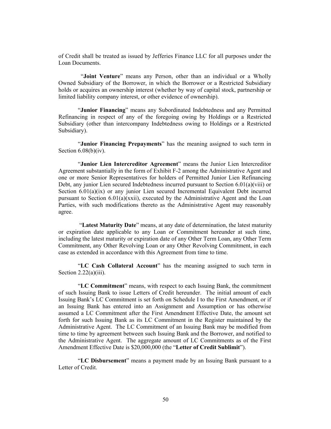 of Credit shall be treated as issued by Jefferies Finance LLC for all purposes under the Loan Documents. “Joint Venture” means any Person, other than an individual or a Wholly Owned Subsidiary of the Borrower, in which the Borrower or a Restricted Subsidiary holds or acquires an ownership interest (whether by way of capital stock, partnership or limited liability company interest, or other evidence of ownership). “Junior Financing” means any Subordinated Indebtedness and any Permitted Refinancing in respect of any of the foregoing owing by Holdings or a Restricted Subsidiary (other than intercompany Indebtedness owing to Holdings or a Restricted Subsidiary). “Junior Financing Prepayments” has the meaning assigned to such term in Section 6.08(b)(iv). “Junior Lien Intercreditor Agreement” means the Junior Lien Intercreditor Agreement substantially in the form of Exhibit F-2 among the Administrative Agent and one or more Senior Representatives for holders of Permitted Junior Lien Refinancing Debt, any junior Lien secured Indebtedness incurred pursuant to Section 6.01(a)(viii) or Section 6.01(a)(ix) or any junior Lien secured Incremental Equivalent Debt incurred pursuant to Section 6.01(a)(xxii), executed by the Administrative Agent and the Loan Parties, with such modifications thereto as the Administrative Agent may reasonably agree. “Latest Maturity Date” means, at any date of determination, the latest maturity or expiration date applicable to any Loan or Commitment hereunder at such time, including the latest maturity or expiration date of any Other Term Loan, any Other Term Commitment, any Other Revolving Loan or any Other Revolving Commitment, in each case as extended in accordance with this Agreement from time to time. “LC Cash Collateral Account” has the meaning assigned to such term in Section 2.22(a)(iii). “LC Commitment” means, with respect to each Issuing Bank, the commitment of such Issuing Bank to issue Letters of Credit hereunder. The initial amount of each Issuing Bank’s LC Commitment is set forth on Schedule I to the First Amendment, or if an Issuing Bank has entered into an Assignment and Assumption or has otherwise assumed a LC Commitment after the First Amendment Effective Date, the amount set forth for such Issuing Bank as its LC Commitment in the Register maintained by the Administrative Agent. The LC Commitment of an Issuing Bank may be modified from time to time by agreement between such Issuing Bank and the Borrower, and notified to the Administrative Agent. The aggregate amount of LC Commitments as of the First Amendment Effective Date is $20,000,000 (the “Letter of Credit Sublimit”). “LC Disbursement” means a payment made by an Issuing Bank pursuant to a Letter of Credit. 50