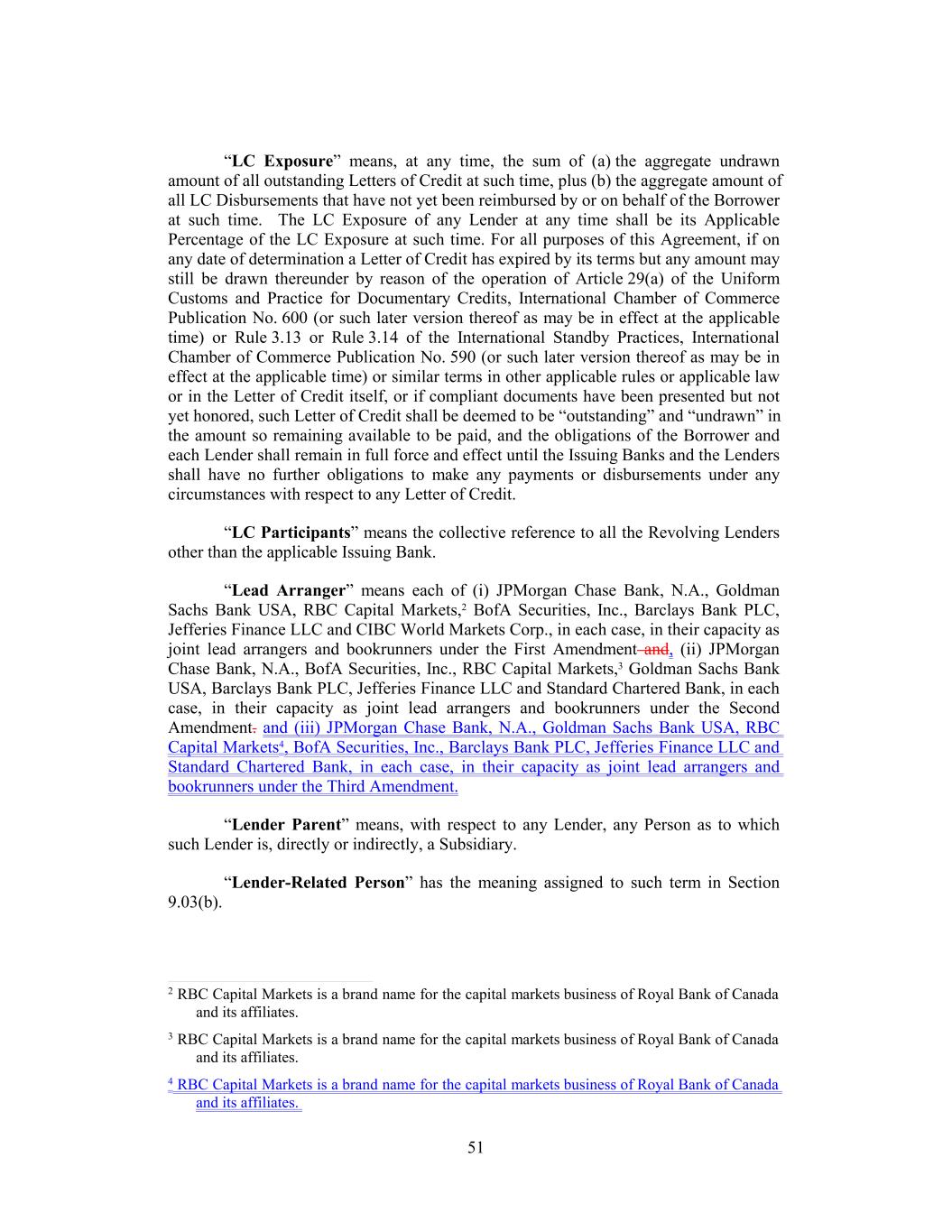 51 “LC Exposure” means, at any time, the sum of (a) the aggregate undrawn amount of all outstanding Letters of Credit at such time, plus (b) the aggregate amount of all LC Disbursements that have not yet been reimbursed by or on behalf of the Borrower at such time. The LC Exposure of any Lender at any time shall be its Applicable Percentage of the LC Exposure at such time. For all purposes of this Agreement, if on any date of determination a Letter of Credit has expired by its terms but any amount may still be drawn thereunder by reason of the operation of Article 29(a) of the Uniform Customs and Practice for Documentary Credits, International Chamber of Commerce Publication No. 600 (or such later version thereof as may be in effect at the applicable time) or Rule 3.13 or Rule 3.14 of the International Standby Practices, International Chamber of Commerce Publication No. 590 (or such later version thereof as may be in effect at the applicable time) or similar terms in other applicable rules or applicable law or in the Letter of Credit itself, or if compliant documents have been presented but not yet honored, such Letter of Credit shall be deemed to be “outstanding” and “undrawn” in the amount so remaining available to be paid, and the obligations of the Borrower and each Lender shall remain in full force and effect until the Issuing Banks and the Lenders shall have no further obligations to make any payments or disbursements under any circumstances with respect to any Letter of Credit. “LC Participants” means the collective reference to all the Revolving Lenders other than the applicable Issuing Bank. “Lead Arranger” means each of (i) JPMorgan Chase Bank, N.A., Goldman Sachs Bank USA, RBC Capital Markets,2 BofA Securities, Inc., Barclays Bank PLC, Jefferies Finance LLC and CIBC World Markets Corp., in each case, in their capacity as joint lead arrangers and bookrunners under the First Amendment and, (ii) JPMorgan Chase Bank, N.A., BofA Securities, Inc., RBC Capital Markets,3 Goldman Sachs Bank USA, Barclays Bank PLC, Jefferies Finance LLC and Standard Chartered Bank, in each case, in their capacity as joint lead arrangers and bookrunners under the Second Amendment. and (iii) JPMorgan Chase Bank, N.A., Goldman Sachs Bank USA, RBC Capital Markets4, BofA Securities, Inc., Barclays Bank PLC, Jefferies Finance LLC and Standard Chartered Bank, in each case, in their capacity as joint lead arrangers and bookrunners under the Third Amendment. “Lender Parent” means, with respect to any Lender, any Person as to which such Lender is, directly or indirectly, a Subsidiary. “Lender-Related Person” has the meaning assigned to such term in Section 9.03(b). 2 RBC Capital Markets is a brand name for the capital markets business of Royal Bank of Canada and its affiliates. 3 RBC Capital Markets is a brand name for the capital markets business of Royal Bank of Canada and its affiliates. 4 RBC Capital Markets is a brand name for the capital markets business of Royal Bank of Canada and its affiliates.