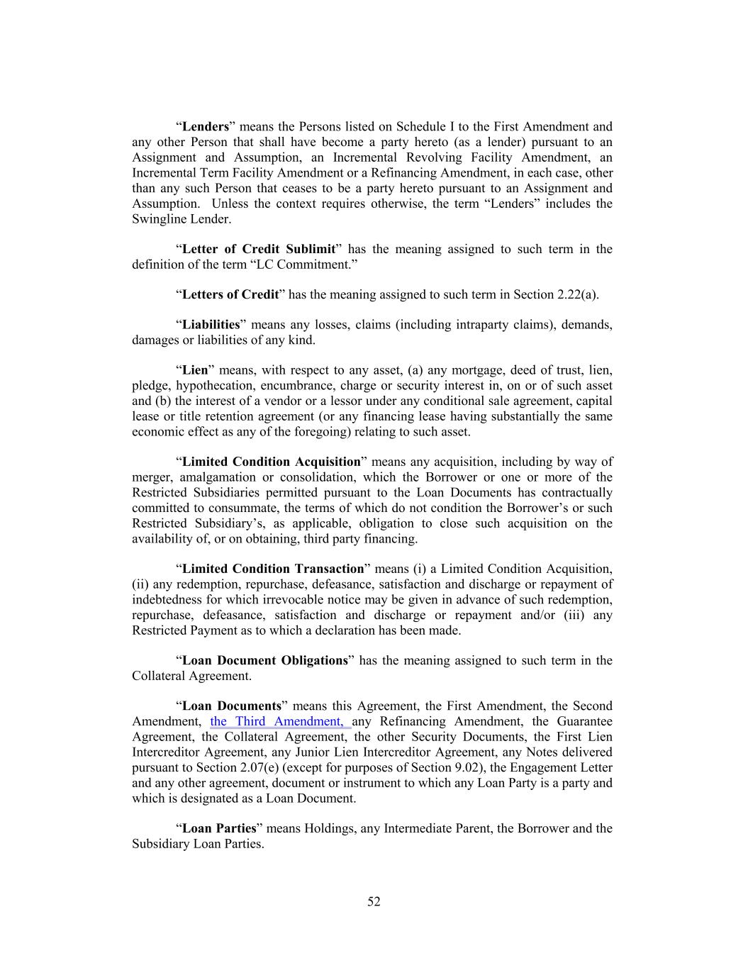 “Lenders” means the Persons listed on Schedule I to the First Amendment and any other Person that shall have become a party hereto (as a lender) pursuant to an Assignment and Assumption, an Incremental Revolving Facility Amendment, an Incremental Term Facility Amendment or a Refinancing Amendment, in each case, other than any such Person that ceases to be a party hereto pursuant to an Assignment and Assumption. Unless the context requires otherwise, the term “Lenders” includes the Swingline Lender. “Letter of Credit Sublimit” has the meaning assigned to such term in the definition of the term “LC Commitment.” “Letters of Credit” has the meaning assigned to such term in Section 2.22(a). “Liabilities” means any losses, claims (including intraparty claims), demands, damages or liabilities of any kind. “Lien” means, with respect to any asset, (a) any mortgage, deed of trust, lien, pledge, hypothecation, encumbrance, charge or security interest in, on or of such asset and (b) the interest of a vendor or a lessor under any conditional sale agreement, capital lease or title retention agreement (or any financing lease having substantially the same economic effect as any of the foregoing) relating to such asset. “Limited Condition Acquisition” means any acquisition, including by way of merger, amalgamation or consolidation, which the Borrower or one or more of the Restricted Subsidiaries permitted pursuant to the Loan Documents has contractually committed to consummate, the terms of which do not condition the Borrower’s or such Restricted Subsidiary’s, as applicable, obligation to close such acquisition on the availability of, or on obtaining, third party financing. “Limited Condition Transaction” means (i) a Limited Condition Acquisition, (ii) any redemption, repurchase, defeasance, satisfaction and discharge or repayment of indebtedness for which irrevocable notice may be given in advance of such redemption, repurchase, defeasance, satisfaction and discharge or repayment and/or (iii) any Restricted Payment as to which a declaration has been made. “Loan Document Obligations” has the meaning assigned to such term in the Collateral Agreement. “Loan Documents” means this Agreement, the First Amendment, the Second Amendment, the Third Amendment, any Refinancing Amendment, the Guarantee Agreement, the Collateral Agreement, the other Security Documents, the First Lien Intercreditor Agreement, any Junior Lien Intercreditor Agreement, any Notes delivered pursuant to Section 2.07(e) (except for purposes of Section 9.02), the Engagement Letter and any other agreement, document or instrument to which any Loan Party is a party and which is designated as a Loan Document. “Loan Parties” means Holdings, any Intermediate Parent, the Borrower and the Subsidiary Loan Parties. 52
