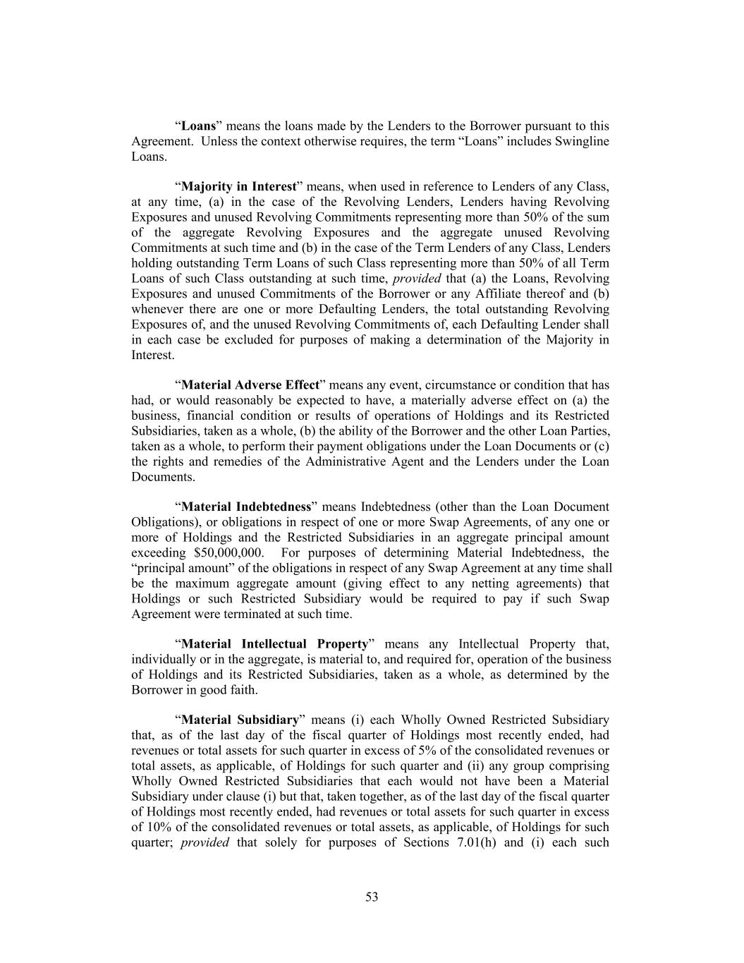 “Loans” means the loans made by the Lenders to the Borrower pursuant to this Agreement. Unless the context otherwise requires, the term “Loans” includes Swingline Loans. “Majority in Interest” means, when used in reference to Lenders of any Class, at any time, (a) in the case of the Revolving Lenders, Lenders having Revolving Exposures and unused Revolving Commitments representing more than 50% of the sum of the aggregate Revolving Exposures and the aggregate unused Revolving Commitments at such time and (b) in the case of the Term Lenders of any Class, Lenders holding outstanding Term Loans of such Class representing more than 50% of all Term Loans of such Class outstanding at such time, provided that (a) the Loans, Revolving Exposures and unused Commitments of the Borrower or any Affiliate thereof and (b) whenever there are one or more Defaulting Lenders, the total outstanding Revolving Exposures of, and the unused Revolving Commitments of, each Defaulting Lender shall in each case be excluded for purposes of making a determination of the Majority in Interest. “Material Adverse Effect” means any event, circumstance or condition that has had, or would reasonably be expected to have, a materially adverse effect on (a) the business, financial condition or results of operations of Holdings and its Restricted Subsidiaries, taken as a whole, (b) the ability of the Borrower and the other Loan Parties, taken as a whole, to perform their payment obligations under the Loan Documents or (c) the rights and remedies of the Administrative Agent and the Lenders under the Loan Documents. “Material Indebtedness” means Indebtedness (other than the Loan Document Obligations), or obligations in respect of one or more Swap Agreements, of any one or more of Holdings and the Restricted Subsidiaries in an aggregate principal amount exceeding $50,000,000. For purposes of determining Material Indebtedness, the “principal amount” of the obligations in respect of any Swap Agreement at any time shall be the maximum aggregate amount (giving effect to any netting agreements) that Holdings or such Restricted Subsidiary would be required to pay if such Swap Agreement were terminated at such time. “Material Intellectual Property” means any Intellectual Property that, individually or in the aggregate, is material to, and required for, operation of the business of Holdings and its Restricted Subsidiaries, taken as a whole, as determined by the Borrower in good faith. “Material Subsidiary” means (i) each Wholly Owned Restricted Subsidiary that, as of the last day of the fiscal quarter of Holdings most recently ended, had revenues or total assets for such quarter in excess of 5% of the consolidated revenues or total assets, as applicable, of Holdings for such quarter and (ii) any group comprising Wholly Owned Restricted Subsidiaries that each would not have been a Material Subsidiary under clause (i) but that, taken together, as of the last day of the fiscal quarter of Holdings most recently ended, had revenues or total assets for such quarter in excess of 10% of the consolidated revenues or total assets, as applicable, of Holdings for such quarter; provided that solely for purposes of Sections 7.01(h) and (i) each such 53