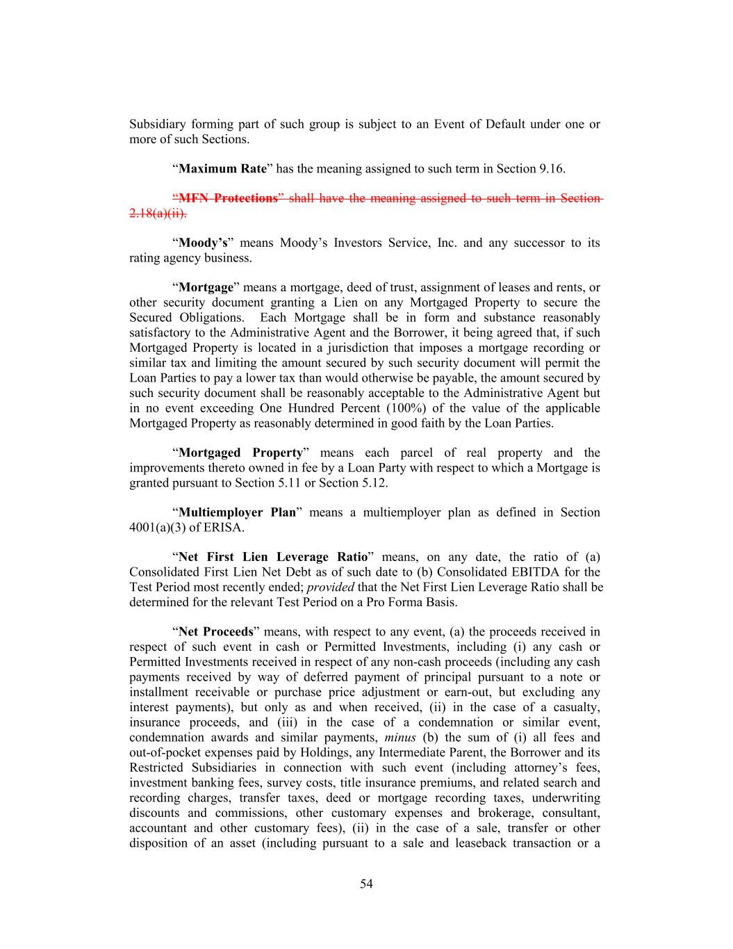 Subsidiary forming part of such group is subject to an Event of Default under one or more of such Sections. “Maximum Rate” has the meaning assigned to such term in Section 9.16. “MFN Protections” shall have the meaning assigned to such term in Section 2.18(a)(ii). “Moody’s” means Moody’s Investors Service, Inc. and any successor to its rating agency business. “Mortgage” means a mortgage, deed of trust, assignment of leases and rents, or other security document granting a Lien on any Mortgaged Property to secure the Secured Obligations. Each Mortgage shall be in form and substance reasonably satisfactory to the Administrative Agent and the Borrower, it being agreed that, if such Mortgaged Property is located in a jurisdiction that imposes a mortgage recording or similar tax and limiting the amount secured by such security document will permit the Loan Parties to pay a lower tax than would otherwise be payable, the amount secured by such security document shall be reasonably acceptable to the Administrative Agent but in no event exceeding One Hundred Percent (100%) of the value of the applicable Mortgaged Property as reasonably determined in good faith by the Loan Parties. “Mortgaged Property” means each parcel of real property and the improvements thereto owned in fee by a Loan Party with respect to which a Mortgage is granted pursuant to Section 5.11 or Section 5.12. “Multiemployer Plan” means a multiemployer plan as defined in Section 4001(a)(3) of ERISA. “Net First Lien Leverage Ratio” means, on any date, the ratio of (a) Consolidated First Lien Net Debt as of such date to (b) Consolidated EBITDA for the Test Period most recently ended; provided that the Net First Lien Leverage Ratio shall be determined for the relevant Test Period on a Pro Forma Basis. “Net Proceeds” means, with respect to any event, (a) the proceeds received in respect of such event in cash or Permitted Investments, including (i) any cash or Permitted Investments received in respect of any non-cash proceeds (including any cash payments received by way of deferred payment of principal pursuant to a note or installment receivable or purchase price adjustment or earn-out, but excluding any interest payments), but only as and when received, (ii) in the case of a casualty, insurance proceeds, and (iii) in the case of a condemnation or similar event, condemnation awards and similar payments, minus (b) the sum of (i) all fees and out-of-pocket expenses paid by Holdings, any Intermediate Parent, the Borrower and its Restricted Subsidiaries in connection with such event (including attorney’s fees, investment banking fees, survey costs, title insurance premiums, and related search and recording charges, transfer taxes, deed or mortgage recording taxes, underwriting discounts and commissions, other customary expenses and brokerage, consultant, accountant and other customary fees), (ii) in the case of a sale, transfer or other disposition of an asset (including pursuant to a sale and leaseback transaction or a 54