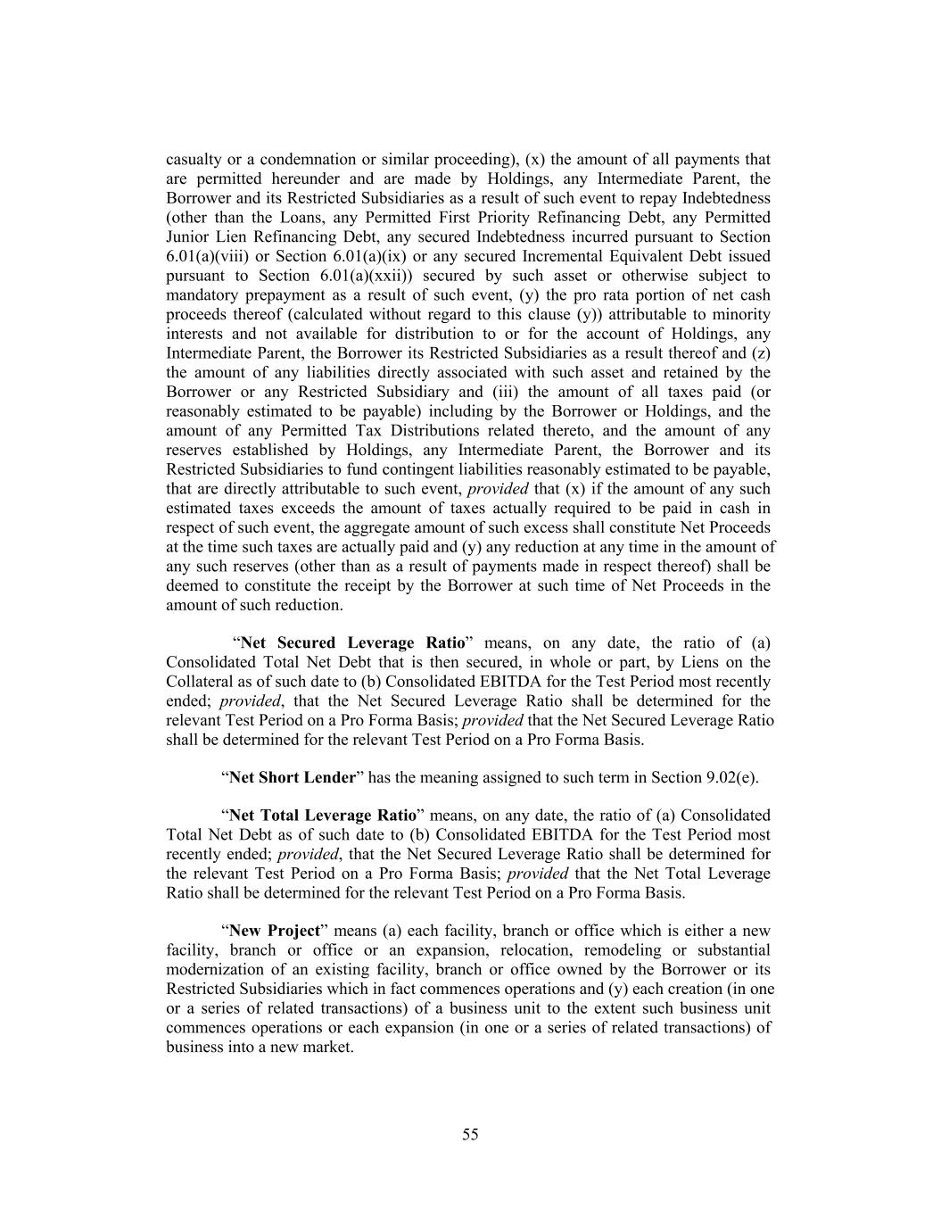 casualty or a condemnation or similar proceeding), (x) the amount of all payments that are permitted hereunder and are made by Holdings, any Intermediate Parent, the Borrower and its Restricted Subsidiaries as a result of such event to repay Indebtedness (other than the Loans, any Permitted First Priority Refinancing Debt, any Permitted Junior Lien Refinancing Debt, any secured Indebtedness incurred pursuant to Section 6.01(a)(viii) or Section 6.01(a)(ix) or any secured Incremental Equivalent Debt issued pursuant to Section 6.01(a)(xxii)) secured by such asset or otherwise subject to mandatory prepayment as a result of such event, (y) the pro rata portion of net cash proceeds thereof (calculated without regard to this clause (y)) attributable to minority interests and not available for distribution to or for the account of Holdings, any Intermediate Parent, the Borrower its Restricted Subsidiaries as a result thereof and (z) the amount of any liabilities directly associated with such asset and retained by the Borrower or any Restricted Subsidiary and (iii) the amount of all taxes paid (or reasonably estimated to be payable) including by the Borrower or Holdings, and the amount of any Permitted Tax Distributions related thereto, and the amount of any reserves established by Holdings, any Intermediate Parent, the Borrower and its Restricted Subsidiaries to fund contingent liabilities reasonably estimated to be payable, that are directly attributable to such event, provided that (x) if the amount of any such estimated taxes exceeds the amount of taxes actually required to be paid in cash in respect of such event, the aggregate amount of such excess shall constitute Net Proceeds at the time such taxes are actually paid and (y) any reduction at any time in the amount of any such reserves (other than as a result of payments made in respect thereof) shall be deemed to constitute the receipt by the Borrower at such time of Net Proceeds in the amount of such reduction. “Net Secured Leverage Ratio” means, on any date, the ratio of (a) Consolidated Total Net Debt that is then secured, in whole or part, by Liens on the Collateral as of such date to (b) Consolidated EBITDA for the Test Period most recently ended; provided, that the Net Secured Leverage Ratio shall be determined for the relevant Test Period on a Pro Forma Basis; provided that the Net Secured Leverage Ratio shall be determined for the relevant Test Period on a Pro Forma Basis. “Net Short Lender” has the meaning assigned to such term in Section 9.02(e). “Net Total Leverage Ratio” means, on any date, the ratio of (a) Consolidated Total Net Debt as of such date to (b) Consolidated EBITDA for the Test Period most recently ended; provided, that the Net Secured Leverage Ratio shall be determined for the relevant Test Period on a Pro Forma Basis; provided that the Net Total Leverage Ratio shall be determined for the relevant Test Period on a Pro Forma Basis. “New Project” means (a) each facility, branch or office which is either a new facility, branch or office or an expansion, relocation, remodeling or substantial modernization of an existing facility, branch or office owned by the Borrower or its Restricted Subsidiaries which in fact commences operations and (y) each creation (in one or a series of related transactions) of a business unit to the extent such business unit commences operations or each expansion (in one or a series of related transactions) of business into a new market. 55