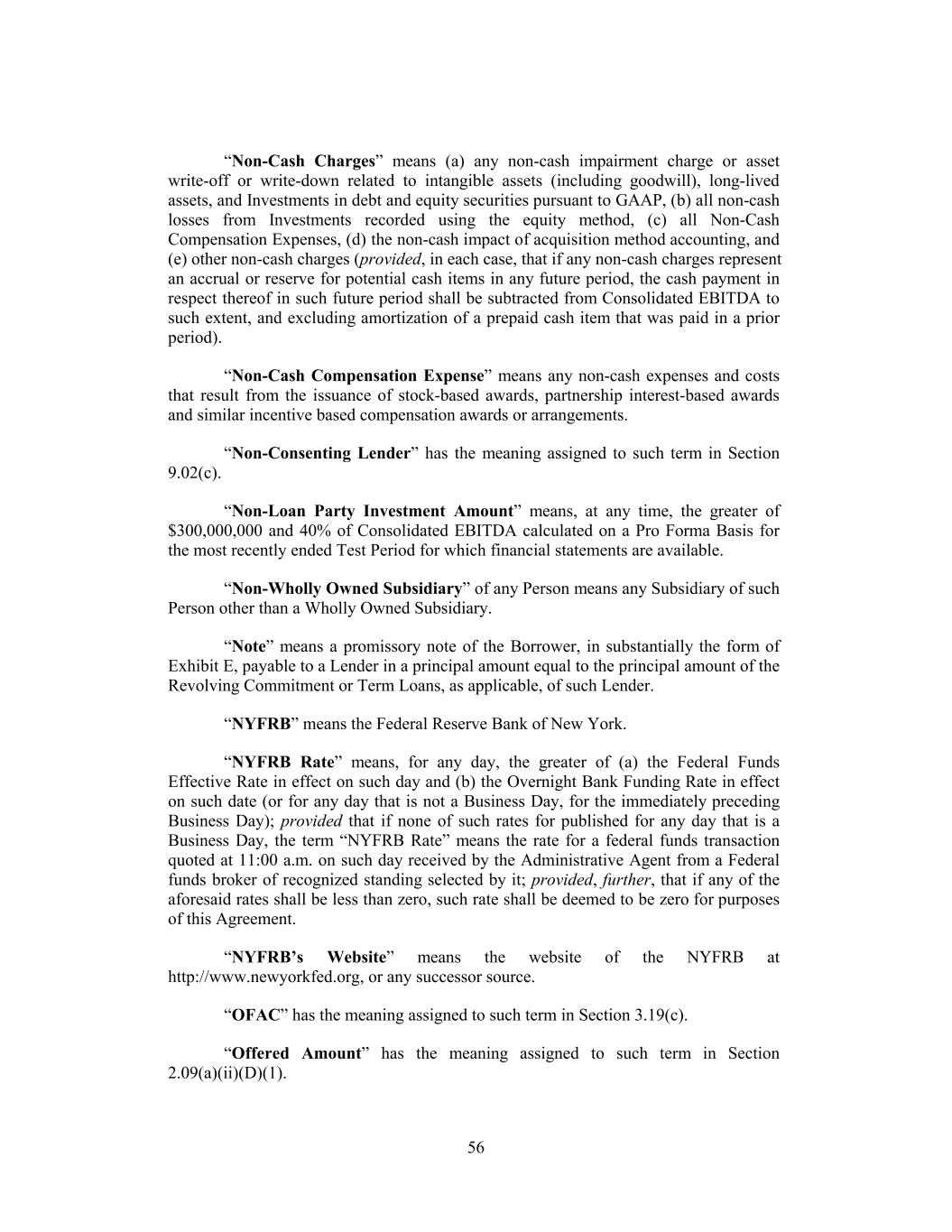 “Non-Cash Charges” means (a) any non-cash impairment charge or asset write-off or write-down related to intangible assets (including goodwill), long-lived assets, and Investments in debt and equity securities pursuant to GAAP, (b) all non-cash losses from Investments recorded using the equity method, (c) all Non-Cash Compensation Expenses, (d) the non-cash impact of acquisition method accounting, and (e) other non-cash charges (provided, in each case, that if any non-cash charges represent an accrual or reserve for potential cash items in any future period, the cash payment in respect thereof in such future period shall be subtracted from Consolidated EBITDA to such extent, and excluding amortization of a prepaid cash item that was paid in a prior period). “Non-Cash Compensation Expense” means any non-cash expenses and costs that result from the issuance of stock-based awards, partnership interest-based awards and similar incentive based compensation awards or arrangements. “Non-Consenting Lender” has the meaning assigned to such term in Section 9.02(c). “Non-Loan Party Investment Amount” means, at any time, the greater of $300,000,000 and 40% of Consolidated EBITDA calculated on a Pro Forma Basis for the most recently ended Test Period for which financial statements are available. “Non-Wholly Owned Subsidiary” of any Person means any Subsidiary of such Person other than a Wholly Owned Subsidiary. “Note” means a promissory note of the Borrower, in substantially the form of Exhibit E, payable to a Lender in a principal amount equal to the principal amount of the Revolving Commitment or Term Loans, as applicable, of such Lender. “NYFRB” means the Federal Reserve Bank of New York. “NYFRB Rate” means, for any day, the greater of (a) the Federal Funds Effective Rate in effect on such day and (b) the Overnight Bank Funding Rate in effect on such date (or for any day that is not a Business Day, for the immediately preceding Business Day); provided that if none of such rates for published for any day that is a Business Day, the term “NYFRB Rate” means the rate for a federal funds transaction quoted at 11:00 a.m. on such day received by the Administrative Agent from a Federal funds broker of recognized standing selected by it; provided, further, that if any of the aforesaid rates shall be less than zero, such rate shall be deemed to be zero for purposes of this Agreement. “NYFRB’s Website” means the website of the NYFRB at http://www.newyorkfed.org, or any successor source. “OFAC” has the meaning assigned to such term in Section 3.19(c). “Offered Amount” has the meaning assigned to such term in Section 2.09(a)(ii)(D)(1). 56