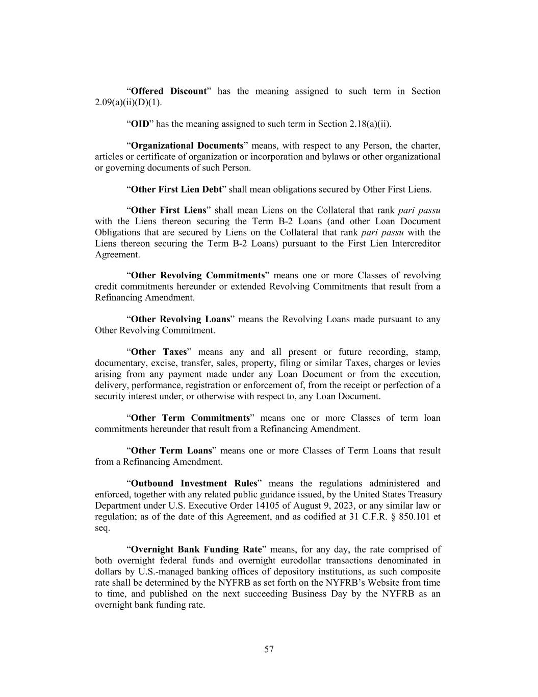 “Offered Discount” has the meaning assigned to such term in Section 2.09(a)(ii)(D)(1). “OID” has the meaning assigned to such term in Section 2.18(a)(ii). “Organizational Documents” means, with respect to any Person, the charter, articles or certificate of organization or incorporation and bylaws or other organizational or governing documents of such Person. “Other First Lien Debt” shall mean obligations secured by Other First Liens. “Other First Liens” shall mean Liens on the Collateral that rank pari passu with the Liens thereon securing the Term B-2 Loans (and other Loan Document Obligations that are secured by Liens on the Collateral that rank pari passu with the Liens thereon securing the Term B-2 Loans) pursuant to the First Lien Intercreditor Agreement. “Other Revolving Commitments” means one or more Classes of revolving credit commitments hereunder or extended Revolving Commitments that result from a Refinancing Amendment. “Other Revolving Loans” means the Revolving Loans made pursuant to any Other Revolving Commitment. “Other Taxes” means any and all present or future recording, stamp, documentary, excise, transfer, sales, property, filing or similar Taxes, charges or levies arising from any payment made under any Loan Document or from the execution, delivery, performance, registration or enforcement of, from the receipt or perfection of a security interest under, or otherwise with respect to, any Loan Document. “Other Term Commitments” means one or more Classes of term loan commitments hereunder that result from a Refinancing Amendment. “Other Term Loans” means one or more Classes of Term Loans that result from a Refinancing Amendment. “Outbound Investment Rules” means the regulations administered and enforced, together with any related public guidance issued, by the United States Treasury Department under U.S. Executive Order 14105 of August 9, 2023, or any similar law or regulation; as of the date of this Agreement, and as codified at 31 C.F.R. § 850.101 et seq. “Overnight Bank Funding Rate” means, for any day, the rate comprised of both overnight federal funds and overnight eurodollar transactions denominated in dollars by U.S.-managed banking offices of depository institutions, as such composite rate shall be determined by the NYFRB as set forth on the NYFRB’s Website from time to time, and published on the next succeeding Business Day by the NYFRB as an overnight bank funding rate. 57