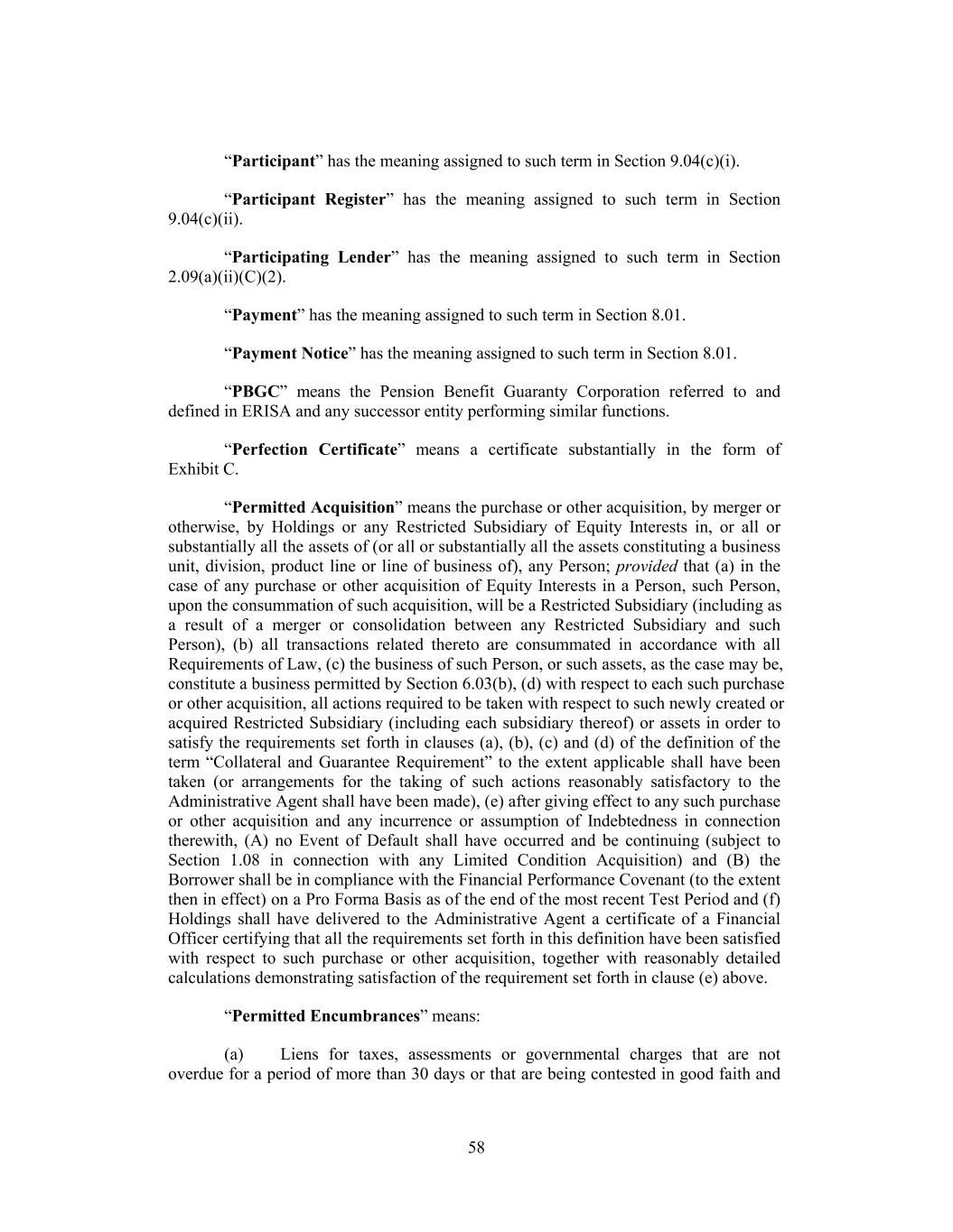 “Participant” has the meaning assigned to such term in Section 9.04(c)(i). “Participant Register” has the meaning assigned to such term in Section 9.04(c)(ii). “Participating Lender” has the meaning assigned to such term in Section 2.09(a)(ii)(C)(2). “Payment” has the meaning assigned to such term in Section 8.01. “Payment Notice” has the meaning assigned to such term in Section 8.01. “PBGC” means the Pension Benefit Guaranty Corporation referred to and defined in ERISA and any successor entity performing similar functions. “Perfection Certificate” means a certificate substantially in the form of Exhibit C. “Permitted Acquisition” means the purchase or other acquisition, by merger or otherwise, by Holdings or any Restricted Subsidiary of Equity Interests in, or all or substantially all the assets of (or all or substantially all the assets constituting a business unit, division, product line or line of business of), any Person; provided that (a) in the case of any purchase or other acquisition of Equity Interests in a Person, such Person, upon the consummation of such acquisition, will be a Restricted Subsidiary (including as a result of a merger or consolidation between any Restricted Subsidiary and such Person), (b) all transactions related thereto are consummated in accordance with all Requirements of Law, (c) the business of such Person, or such assets, as the case may be, constitute a business permitted by Section 6.03(b), (d) with respect to each such purchase or other acquisition, all actions required to be taken with respect to such newly created or acquired Restricted Subsidiary (including each subsidiary thereof) or assets in order to satisfy the requirements set forth in clauses (a), (b), (c) and (d) of the definition of the term “Collateral and Guarantee Requirement” to the extent applicable shall have been taken (or arrangements for the taking of such actions reasonably satisfactory to the Administrative Agent shall have been made), (e) after giving effect to any such purchase or other acquisition and any incurrence or assumption of Indebtedness in connection therewith, (A) no Event of Default shall have occurred and be continuing (subject to Section 1.08 in connection with any Limited Condition Acquisition) and (B) the Borrower shall be in compliance with the Financial Performance Covenant (to the extent then in effect) on a Pro Forma Basis as of the end of the most recent Test Period and (f) Holdings shall have delivered to the Administrative Agent a certificate of a Financial Officer certifying that all the requirements set forth in this definition have been satisfied with respect to such purchase or other acquisition, together with reasonably detailed calculations demonstrating satisfaction of the requirement set forth in clause (e) above. “Permitted Encumbrances” means: (a) Liens for taxes, assessments or governmental charges that are not overdue for a period of more than 30 days or that are being contested in good faith and 58