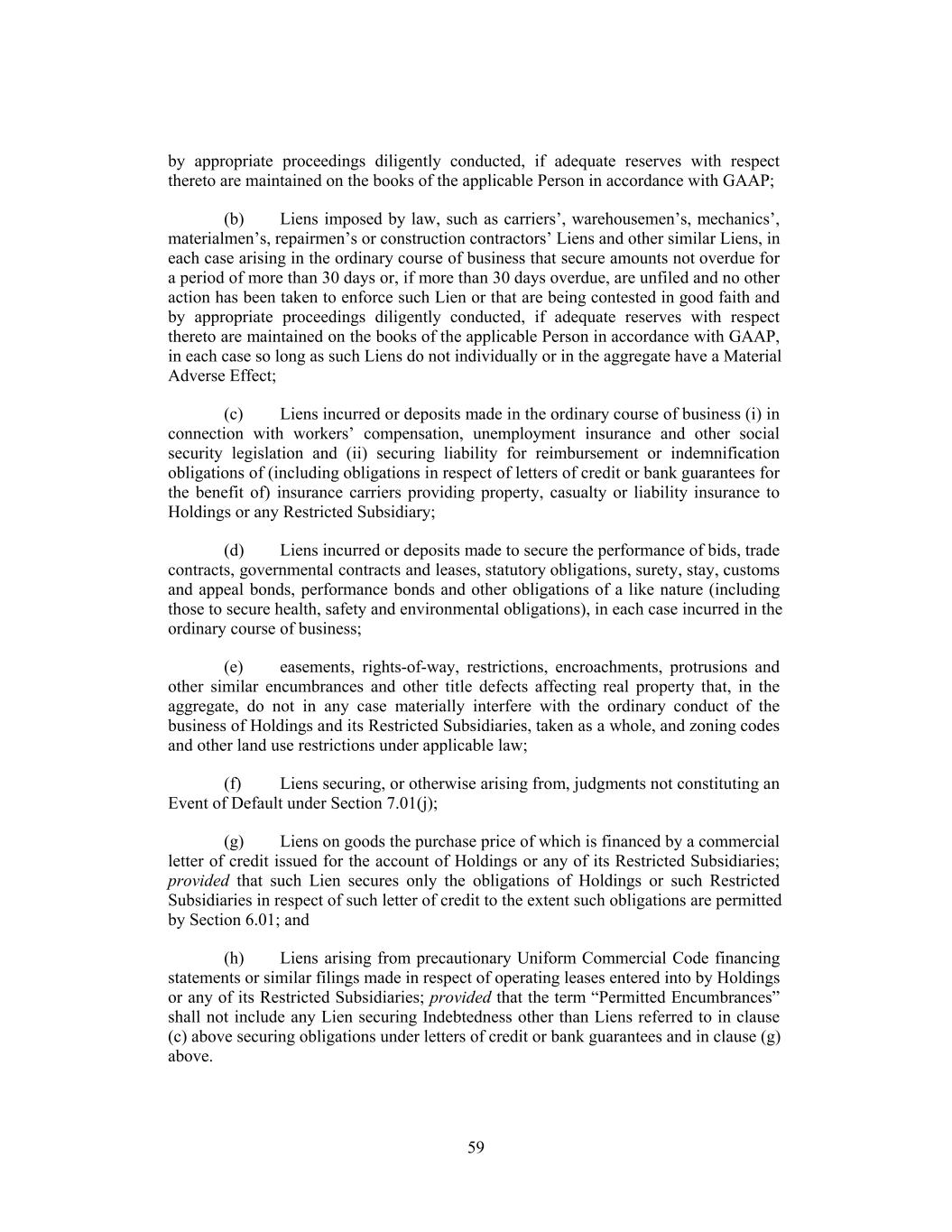 by appropriate proceedings diligently conducted, if adequate reserves with respect thereto are maintained on the books of the applicable Person in accordance with GAAP; (b) Liens imposed by law, such as carriers’, warehousemen’s, mechanics’, materialmen’s, repairmen’s or construction contractors’ Liens and other similar Liens, in each case arising in the ordinary course of business that secure amounts not overdue for a period of more than 30 days or, if more than 30 days overdue, are unfiled and no other action has been taken to enforce such Lien or that are being contested in good faith and by appropriate proceedings diligently conducted, if adequate reserves with respect thereto are maintained on the books of the applicable Person in accordance with GAAP, in each case so long as such Liens do not individually or in the aggregate have a Material Adverse Effect; (c) Liens incurred or deposits made in the ordinary course of business (i) in connection with workers’ compensation, unemployment insurance and other social security legislation and (ii) securing liability for reimbursement or indemnification obligations of (including obligations in respect of letters of credit or bank guarantees for the benefit of) insurance carriers providing property, casualty or liability insurance to Holdings or any Restricted Subsidiary; (d) Liens incurred or deposits made to secure the performance of bids, trade contracts, governmental contracts and leases, statutory obligations, surety, stay, customs and appeal bonds, performance bonds and other obligations of a like nature (including those to secure health, safety and environmental obligations), in each case incurred in the ordinary course of business; (e) easements, rights-of-way, restrictions, encroachments, protrusions and other similar encumbrances and other title defects affecting real property that, in the aggregate, do not in any case materially interfere with the ordinary conduct of the business of Holdings and its Restricted Subsidiaries, taken as a whole, and zoning codes and other land use restrictions under applicable law; (f) Liens securing, or otherwise arising from, judgments not constituting an Event of Default under Section 7.01(j); (g) Liens on goods the purchase price of which is financed by a commercial letter of credit issued for the account of Holdings or any of its Restricted Subsidiaries; provided that such Lien secures only the obligations of Holdings or such Restricted Subsidiaries in respect of such letter of credit to the extent such obligations are permitted by Section 6.01; and (h) Liens arising from precautionary Uniform Commercial Code financing statements or similar filings made in respect of operating leases entered into by Holdings or any of its Restricted Subsidiaries; provided that the term “Permitted Encumbrances” shall not include any Lien securing Indebtedness other than Liens referred to in clause (c) above securing obligations under letters of credit or bank guarantees and in clause (g) above. 59