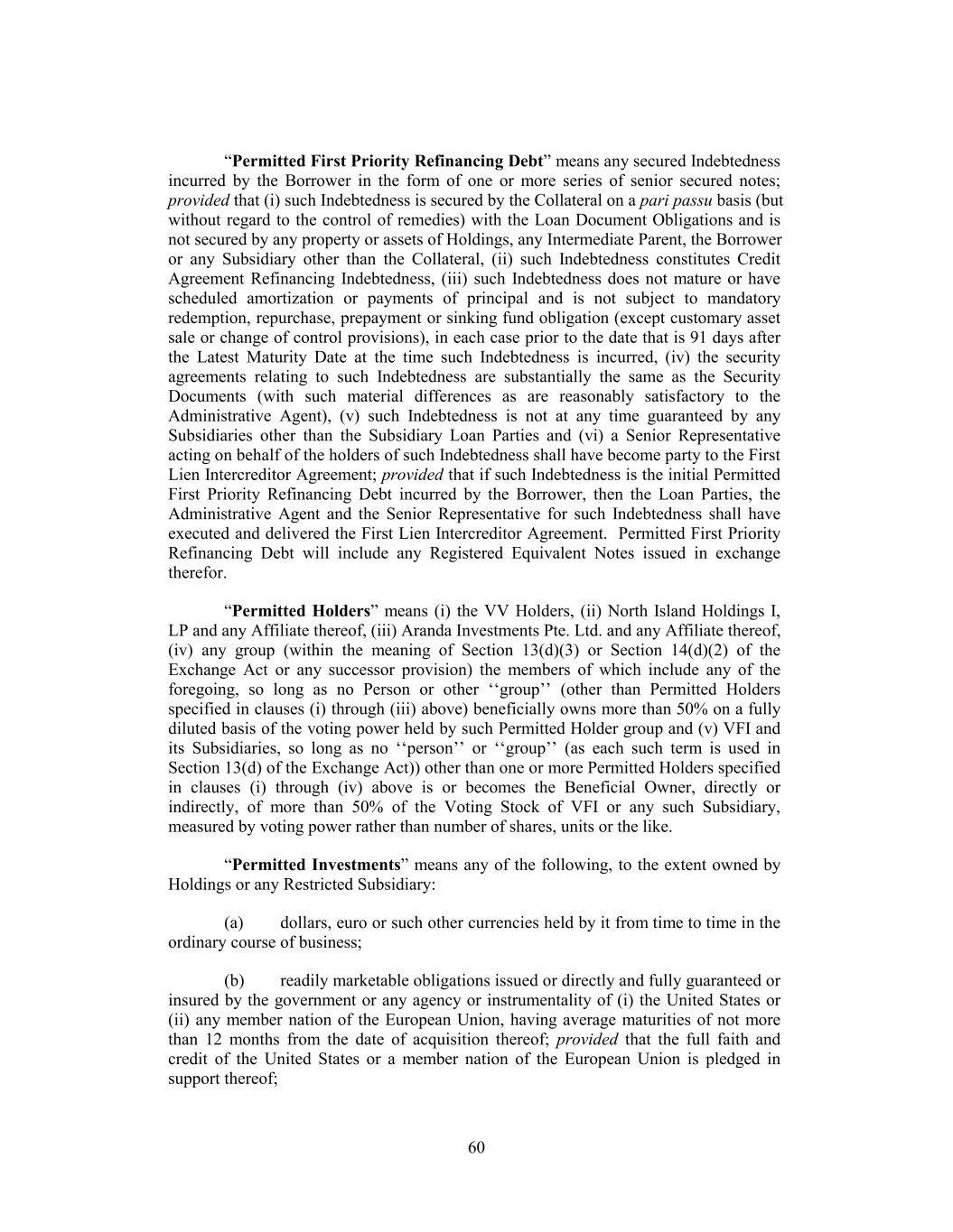 “Permitted First Priority Refinancing Debt” means any secured Indebtedness incurred by the Borrower in the form of one or more series of senior secured notes; provided that (i) such Indebtedness is secured by the Collateral on a pari passu basis (but without regard to the control of remedies) with the Loan Document Obligations and is not secured by any property or assets of Holdings, any Intermediate Parent, the Borrower or any Subsidiary other than the Collateral, (ii) such Indebtedness constitutes Credit Agreement Refinancing Indebtedness, (iii) such Indebtedness does not mature or have scheduled amortization or payments of principal and is not subject to mandatory redemption, repurchase, prepayment or sinking fund obligation (except customary asset sale or change of control provisions), in each case prior to the date that is 91 days after the Latest Maturity Date at the time such Indebtedness is incurred, (iv) the security agreements relating to such Indebtedness are substantially the same as the Security Documents (with such material differences as are reasonably satisfactory to the Administrative Agent), (v) such Indebtedness is not at any time guaranteed by any Subsidiaries other than the Subsidiary Loan Parties and (vi) a Senior Representative acting on behalf of the holders of such Indebtedness shall have become party to the First Lien Intercreditor Agreement; provided that if such Indebtedness is the initial Permitted First Priority Refinancing Debt incurred by the Borrower, then the Loan Parties, the Administrative Agent and the Senior Representative for such Indebtedness shall have executed and delivered the First Lien Intercreditor Agreement. Permitted First Priority Refinancing Debt will include any Registered Equivalent Notes issued in exchange therefor. “Permitted Holders” means (i) the VV Holders, (ii) North Island Holdings I, LP and any Affiliate thereof, (iii) Aranda Investments Pte. Ltd. and any Affiliate thereof, (iv) any group (within the meaning of Section 13(d)(3) or Section 14(d)(2) of the Exchange Act or any successor provision) the members of which include any of the foregoing, so long as no Person or other ‘‘group’’ (other than Permitted Holders specified in clauses (i) through (iii) above) beneficially owns more than 50% on a fully diluted basis of the voting power held by such Permitted Holder group and (v) VFI and its Subsidiaries, so long as no ‘‘person’’ or ‘‘group’’ (as each such term is used in Section 13(d) of the Exchange Act)) other than one or more Permitted Holders specified in clauses (i) through (iv) above is or becomes the Beneficial Owner, directly or indirectly, of more than 50% of the Voting Stock of VFI or any such Subsidiary, measured by voting power rather than number of shares, units or the like. “Permitted Investments” means any of the following, to the extent owned by Holdings or any Restricted Subsidiary: (a) dollars, euro or such other currencies held by it from time to time in the ordinary course of business; (b) readily marketable obligations issued or directly and fully guaranteed or insured by the government or any agency or instrumentality of (i) the United States or (ii) any member nation of the European Union, having average maturities of not more than 12 months from the date of acquisition thereof; provided that the full faith and credit of the United States or a member nation of the European Union is pledged in support thereof; 60