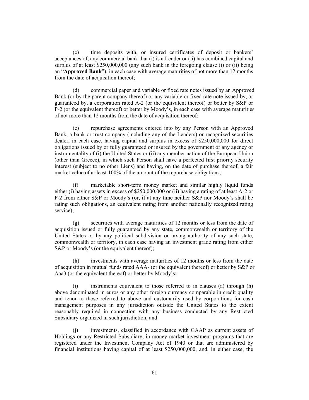 (c) time deposits with, or insured certificates of deposit or bankers’ acceptances of, any commercial bank that (i) is a Lender or (ii) has combined capital and surplus of at least $250,000,000 (any such bank in the foregoing clause (i) or (ii) being an “Approved Bank”), in each case with average maturities of not more than 12 months from the date of acquisition thereof; (d) commercial paper and variable or fixed rate notes issued by an Approved Bank (or by the parent company thereof) or any variable or fixed rate note issued by, or guaranteed by, a corporation rated A-2 (or the equivalent thereof) or better by S&P or P-2 (or the equivalent thereof) or better by Moody’s, in each case with average maturities of not more than 12 months from the date of acquisition thereof; (e) repurchase agreements entered into by any Person with an Approved Bank, a bank or trust company (including any of the Lenders) or recognized securities dealer, in each case, having capital and surplus in excess of $250,000,000 for direct obligations issued by or fully guaranteed or insured by the government or any agency or instrumentality of (i) the United States or (ii) any member nation of the European Union (other than Greece), in which such Person shall have a perfected first priority security interest (subject to no other Liens) and having, on the date of purchase thereof, a fair market value of at least 100% of the amount of the repurchase obligations; (f) marketable short-term money market and similar highly liquid funds either (i) having assets in excess of $250,000,000 or (ii) having a rating of at least A-2 or P-2 from either S&P or Moody’s (or, if at any time neither S&P nor Moody’s shall be rating such obligations, an equivalent rating from another nationally recognized rating service); (g) securities with average maturities of 12 months or less from the date of acquisition issued or fully guaranteed by any state, commonwealth or territory of the United States or by any political subdivision or taxing authority of any such state, commonwealth or territory, in each case having an investment grade rating from either S&P or Moody’s (or the equivalent thereof); (h) investments with average maturities of 12 months or less from the date of acquisition in mutual funds rated AAA- (or the equivalent thereof) or better by S&P or Aaa3 (or the equivalent thereof) or better by Moody’s; (i) instruments equivalent to those referred to in clauses (a) through (h) above denominated in euros or any other foreign currency comparable in credit quality and tenor to those referred to above and customarily used by corporations for cash management purposes in any jurisdiction outside the United States to the extent reasonably required in connection with any business conducted by any Restricted Subsidiary organized in such jurisdiction; and (j) investments, classified in accordance with GAAP as current assets of Holdings or any Restricted Subsidiary, in money market investment programs that are registered under the Investment Company Act of 1940 or that are administered by financial institutions having capital of at least $250,000,000, and, in either case, the 61