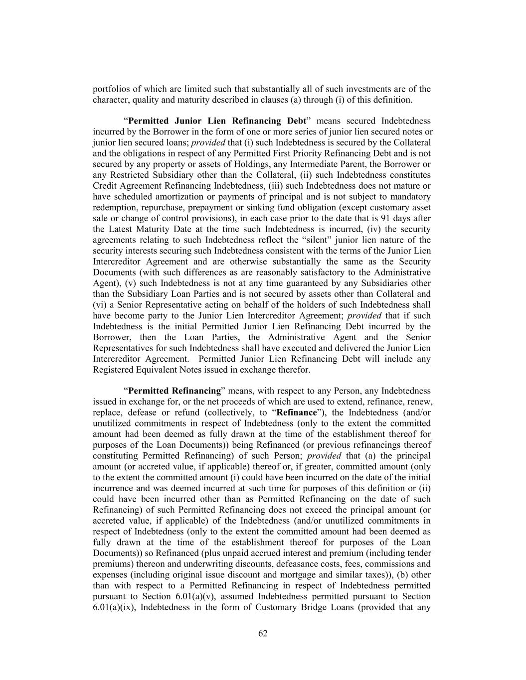 portfolios of which are limited such that substantially all of such investments are of the character, quality and maturity described in clauses (a) through (i) of this definition. “Permitted Junior Lien Refinancing Debt” means secured Indebtedness incurred by the Borrower in the form of one or more series of junior lien secured notes or junior lien secured loans; provided that (i) such Indebtedness is secured by the Collateral and the obligations in respect of any Permitted First Priority Refinancing Debt and is not secured by any property or assets of Holdings, any Intermediate Parent, the Borrower or any Restricted Subsidiary other than the Collateral, (ii) such Indebtedness constitutes Credit Agreement Refinancing Indebtedness, (iii) such Indebtedness does not mature or have scheduled amortization or payments of principal and is not subject to mandatory redemption, repurchase, prepayment or sinking fund obligation (except customary asset sale or change of control provisions), in each case prior to the date that is 91 days after the Latest Maturity Date at the time such Indebtedness is incurred, (iv) the security agreements relating to such Indebtedness reflect the “silent” junior lien nature of the security interests securing such Indebtedness consistent with the terms of the Junior Lien Intercreditor Agreement and are otherwise substantially the same as the Security Documents (with such differences as are reasonably satisfactory to the Administrative Agent), (v) such Indebtedness is not at any time guaranteed by any Subsidiaries other than the Subsidiary Loan Parties and is not secured by assets other than Collateral and (vi) a Senior Representative acting on behalf of the holders of such Indebtedness shall have become party to the Junior Lien Intercreditor Agreement; provided that if such Indebtedness is the initial Permitted Junior Lien Refinancing Debt incurred by the Borrower, then the Loan Parties, the Administrative Agent and the Senior Representatives for such Indebtedness shall have executed and delivered the Junior Lien Intercreditor Agreement. Permitted Junior Lien Refinancing Debt will include any Registered Equivalent Notes issued in exchange therefor. “Permitted Refinancing” means, with respect to any Person, any Indebtedness issued in exchange for, or the net proceeds of which are used to extend, refinance, renew, replace, defease or refund (collectively, to “Refinance”), the Indebtedness (and/or unutilized commitments in respect of Indebtedness (only to the extent the committed amount had been deemed as fully drawn at the time of the establishment thereof for purposes of the Loan Documents)) being Refinanced (or previous refinancings thereof constituting Permitted Refinancing) of such Person; provided that (a) the principal amount (or accreted value, if applicable) thereof or, if greater, committed amount (only to the extent the committed amount (i) could have been incurred on the date of the initial incurrence and was deemed incurred at such time for purposes of this definition or (ii) could have been incurred other than as Permitted Refinancing on the date of such Refinancing) of such Permitted Refinancing does not exceed the principal amount (or accreted value, if applicable) of the Indebtedness (and/or unutilized commitments in respect of Indebtedness (only to the extent the committed amount had been deemed as fully drawn at the time of the establishment thereof for purposes of the Loan Documents)) so Refinanced (plus unpaid accrued interest and premium (including tender premiums) thereon and underwriting discounts, defeasance costs, fees, commissions and expenses (including original issue discount and mortgage and similar taxes)), (b) other than with respect to a Permitted Refinancing in respect of Indebtedness permitted pursuant to Section 6.01(a)(v), assumed Indebtedness permitted pursuant to Section 6.01(a)(ix), Indebtedness in the form of Customary Bridge Loans (provided that any 62