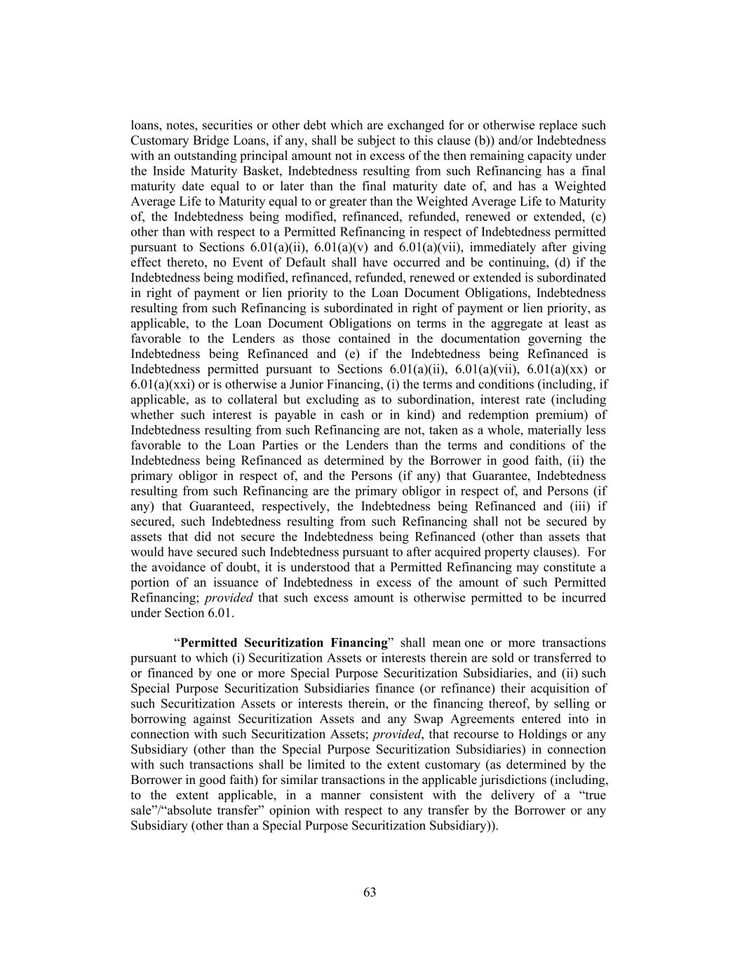 loans, notes, securities or other debt which are exchanged for or otherwise replace such Customary Bridge Loans, if any, shall be subject to this clause (b)) and/or Indebtedness with an outstanding principal amount not in excess of the then remaining capacity under the Inside Maturity Basket, Indebtedness resulting from such Refinancing has a final maturity date equal to or later than the final maturity date of, and has a Weighted Average Life to Maturity equal to or greater than the Weighted Average Life to Maturity of, the Indebtedness being modified, refinanced, refunded, renewed or extended, (c) other than with respect to a Permitted Refinancing in respect of Indebtedness permitted pursuant to Sections 6.01(a)(ii), 6.01(a)(v) and 6.01(a)(vii), immediately after giving effect thereto, no Event of Default shall have occurred and be continuing, (d) if the Indebtedness being modified, refinanced, refunded, renewed or extended is subordinated in right of payment or lien priority to the Loan Document Obligations, Indebtedness resulting from such Refinancing is subordinated in right of payment or lien priority, as applicable, to the Loan Document Obligations on terms in the aggregate at least as favorable to the Lenders as those contained in the documentation governing the Indebtedness being Refinanced and (e) if the Indebtedness being Refinanced is Indebtedness permitted pursuant to Sections 6.01(a)(ii), 6.01(a)(vii), 6.01(a)(xx) or 6.01(a)(xxi) or is otherwise a Junior Financing, (i) the terms and conditions (including, if applicable, as to collateral but excluding as to subordination, interest rate (including whether such interest is payable in cash or in kind) and redemption premium) of Indebtedness resulting from such Refinancing are not, taken as a whole, materially less favorable to the Loan Parties or the Lenders than the terms and conditions of the Indebtedness being Refinanced as determined by the Borrower in good faith, (ii) the primary obligor in respect of, and the Persons (if any) that Guarantee, Indebtedness resulting from such Refinancing are the primary obligor in respect of, and Persons (if any) that Guaranteed, respectively, the Indebtedness being Refinanced and (iii) if secured, such Indebtedness resulting from such Refinancing shall not be secured by assets that did not secure the Indebtedness being Refinanced (other than assets that would have secured such Indebtedness pursuant to after acquired property clauses). For the avoidance of doubt, it is understood that a Permitted Refinancing may constitute a portion of an issuance of Indebtedness in excess of the amount of such Permitted Refinancing; provided that such excess amount is otherwise permitted to be incurred under Section 6.01. “Permitted Securitization Financing” shall mean one or more transactions pursuant to which (i) Securitization Assets or interests therein are sold or transferred to or financed by one or more Special Purpose Securitization Subsidiaries, and (ii) such Special Purpose Securitization Subsidiaries finance (or refinance) their acquisition of such Securitization Assets or interests therein, or the financing thereof, by selling or borrowing against Securitization Assets and any Swap Agreements entered into in connection with such Securitization Assets; provided, that recourse to Holdings or any Subsidiary (other than the Special Purpose Securitization Subsidiaries) in connection with such transactions shall be limited to the extent customary (as determined by the Borrower in good faith) for similar transactions in the applicable jurisdictions (including, to the extent applicable, in a manner consistent with the delivery of a “true sale”/“absolute transfer” opinion with respect to any transfer by the Borrower or any Subsidiary (other than a Special Purpose Securitization Subsidiary)). 63