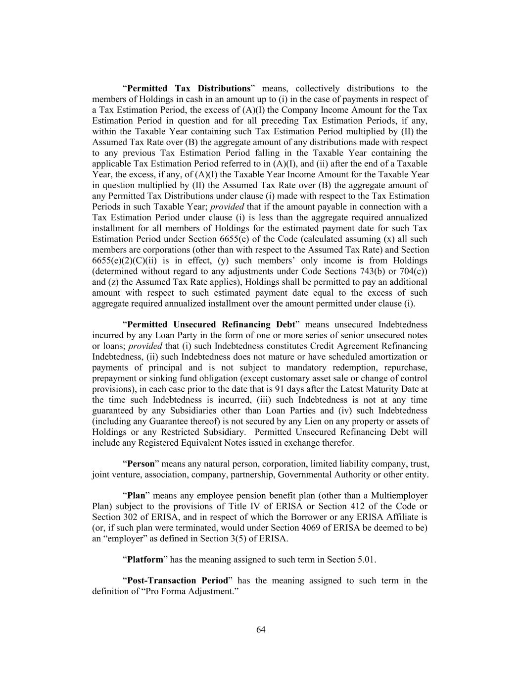 “Permitted Tax Distributions” means, collectively distributions to the members of Holdings in cash in an amount up to (i) in the case of payments in respect of a Tax Estimation Period, the excess of (A)(I) the Company Income Amount for the Tax Estimation Period in question and for all preceding Tax Estimation Periods, if any, within the Taxable Year containing such Tax Estimation Period multiplied by (II) the Assumed Tax Rate over (B) the aggregate amount of any distributions made with respect to any previous Tax Estimation Period falling in the Taxable Year containing the applicable Tax Estimation Period referred to in (A)(I), and (ii) after the end of a Taxable Year, the excess, if any, of (A)(I) the Taxable Year Income Amount for the Taxable Year in question multiplied by (II) the Assumed Tax Rate over (B) the aggregate amount of any Permitted Tax Distributions under clause (i) made with respect to the Tax Estimation Periods in such Taxable Year; provided that if the amount payable in connection with a Tax Estimation Period under clause (i) is less than the aggregate required annualized installment for all members of Holdings for the estimated payment date for such Tax Estimation Period under Section 6655(e) of the Code (calculated assuming (x) all such members are corporations (other than with respect to the Assumed Tax Rate) and Section 6655(e)(2)(C)(ii) is in effect, (y) such members’ only income is from Holdings (determined without regard to any adjustments under Code Sections 743(b) or 704(c)) and (z) the Assumed Tax Rate applies), Holdings shall be permitted to pay an additional amount with respect to such estimated payment date equal to the excess of such aggregate required annualized installment over the amount permitted under clause (i). “Permitted Unsecured Refinancing Debt” means unsecured Indebtedness incurred by any Loan Party in the form of one or more series of senior unsecured notes or loans; provided that (i) such Indebtedness constitutes Credit Agreement Refinancing Indebtedness, (ii) such Indebtedness does not mature or have scheduled amortization or payments of principal and is not subject to mandatory redemption, repurchase, prepayment or sinking fund obligation (except customary asset sale or change of control provisions), in each case prior to the date that is 91 days after the Latest Maturity Date at the time such Indebtedness is incurred, (iii) such Indebtedness is not at any time guaranteed by any Subsidiaries other than Loan Parties and (iv) such Indebtedness (including any Guarantee thereof) is not secured by any Lien on any property or assets of Holdings or any Restricted Subsidiary. Permitted Unsecured Refinancing Debt will include any Registered Equivalent Notes issued in exchange therefor. “Person” means any natural person, corporation, limited liability company, trust, joint venture, association, company, partnership, Governmental Authority or other entity. “Plan” means any employee pension benefit plan (other than a Multiemployer Plan) subject to the provisions of Title IV of ERISA or Section 412 of the Code or Section 302 of ERISA, and in respect of which the Borrower or any ERISA Affiliate is (or, if such plan were terminated, would under Section 4069 of ERISA be deemed to be) an “employer” as defined in Section 3(5) of ERISA. “Platform” has the meaning assigned to such term in Section 5.01. “Post-Transaction Period” has the meaning assigned to such term in the definition of “Pro Forma Adjustment.” 64