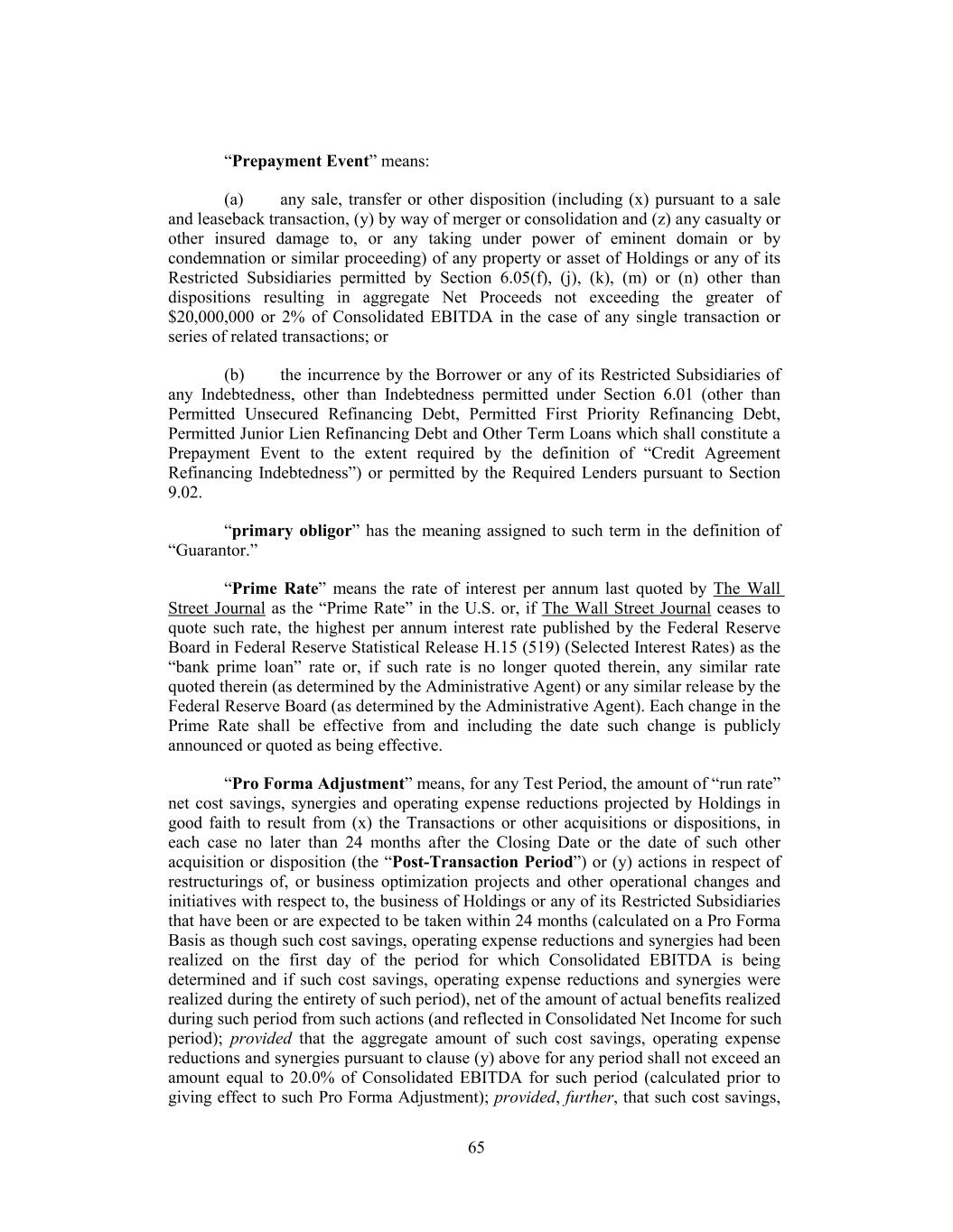 “Prepayment Event” means: (a) any sale, transfer or other disposition (including (x) pursuant to a sale and leaseback transaction, (y) by way of merger or consolidation and (z) any casualty or other insured damage to, or any taking under power of eminent domain or by condemnation or similar proceeding) of any property or asset of Holdings or any of its Restricted Subsidiaries permitted by Section 6.05(f), (j), (k), (m) or (n) other than dispositions resulting in aggregate Net Proceeds not exceeding the greater of $20,000,000 or 2% of Consolidated EBITDA in the case of any single transaction or series of related transactions; or (b) the incurrence by the Borrower or any of its Restricted Subsidiaries of any Indebtedness, other than Indebtedness permitted under Section 6.01 (other than Permitted Unsecured Refinancing Debt, Permitted First Priority Refinancing Debt, Permitted Junior Lien Refinancing Debt and Other Term Loans which shall constitute a Prepayment Event to the extent required by the definition of “Credit Agreement Refinancing Indebtedness”) or permitted by the Required Lenders pursuant to Section 9.02. “primary obligor” has the meaning assigned to such term in the definition of “Guarantor.” “Prime Rate” means the rate of interest per annum last quoted by The Wall Street Journal as the “Prime Rate” in the U.S. or, if The Wall Street Journal ceases to quote such rate, the highest per annum interest rate published by the Federal Reserve Board in Federal Reserve Statistical Release H.15 (519) (Selected Interest Rates) as the “bank prime loan” rate or, if such rate is no longer quoted therein, any similar rate quoted therein (as determined by the Administrative Agent) or any similar release by the Federal Reserve Board (as determined by the Administrative Agent). Each change in the Prime Rate shall be effective from and including the date such change is publicly announced or quoted as being effective. “Pro Forma Adjustment” means, for any Test Period, the amount of “run rate” net cost savings, synergies and operating expense reductions projected by Holdings in good faith to result from (x) the Transactions or other acquisitions or dispositions, in each case no later than 24 months after the Closing Date or the date of such other acquisition or disposition (the “Post-Transaction Period”) or (y) actions in respect of restructurings of, or business optimization projects and other operational changes and initiatives with respect to, the business of Holdings or any of its Restricted Subsidiaries that have been or are expected to be taken within 24 months (calculated on a Pro Forma Basis as though such cost savings, operating expense reductions and synergies had been realized on the first day of the period for which Consolidated EBITDA is being determined and if such cost savings, operating expense reductions and synergies were realized during the entirety of such period), net of the amount of actual benefits realized during such period from such actions (and reflected in Consolidated Net Income for such period); provided that the aggregate amount of such cost savings, operating expense reductions and synergies pursuant to clause (y) above for any period shall not exceed an amount equal to 20.0% of Consolidated EBITDA for such period (calculated prior to giving effect to such Pro Forma Adjustment); provided, further, that such cost savings, 65